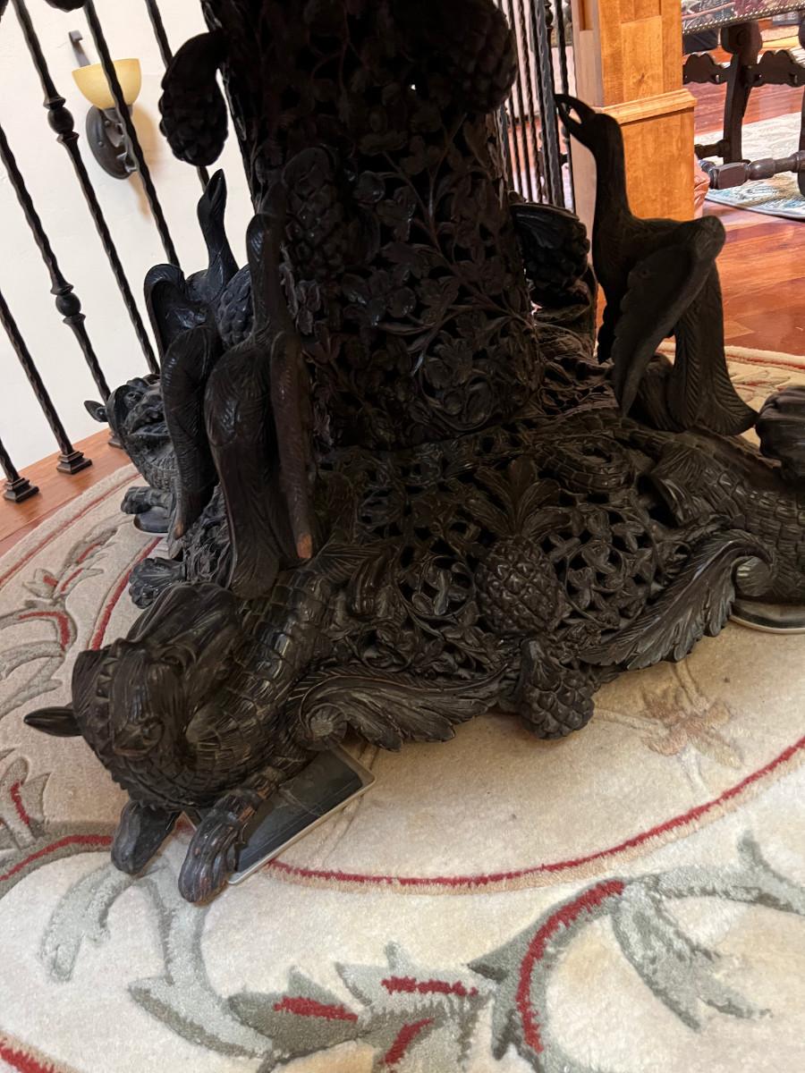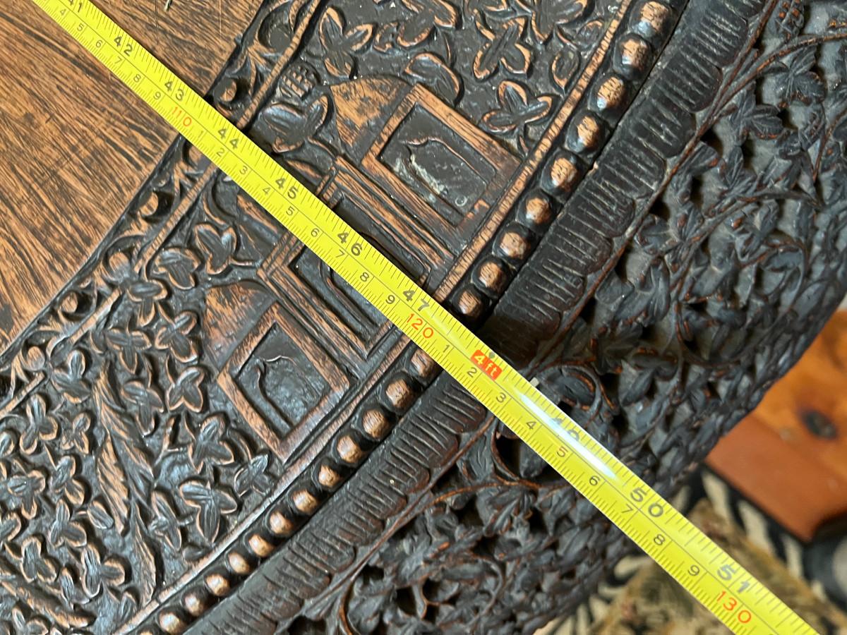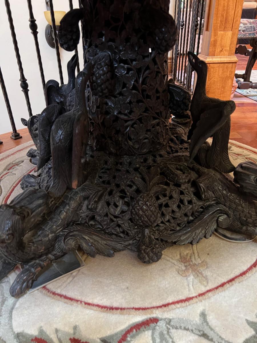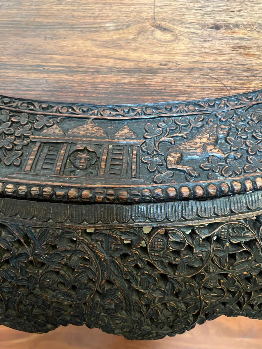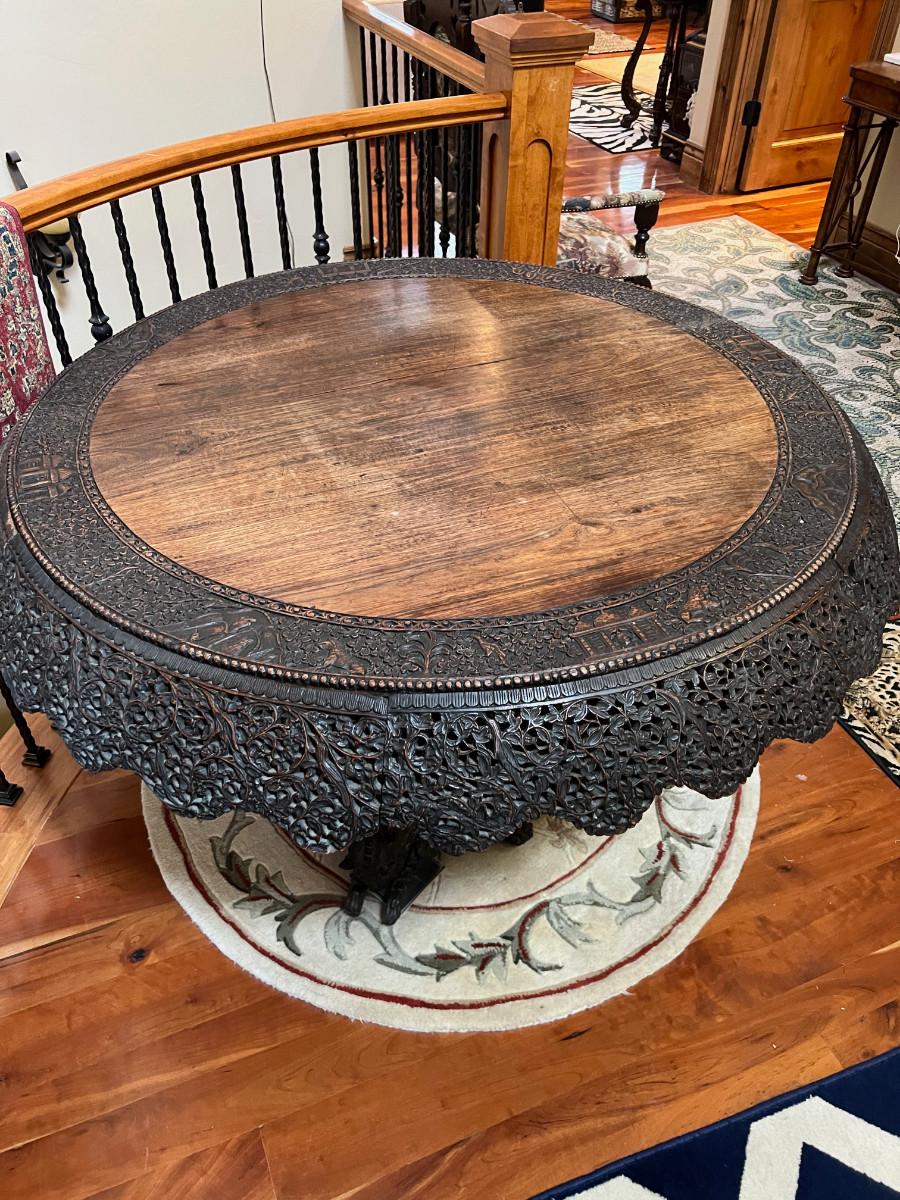 This beautifully carved table is from the late 1800's most likely 1890's. Finely carved rosewood of British East Indian Origin. Table does have some age related damage and wear, it appears to also have been repaired in the past but I believe it to be the original finish. Regardless this is a one of a kind piece and quite rare. 48" diameter and 31" tall, Top will swivel as shown for display.