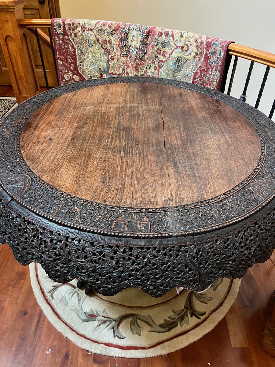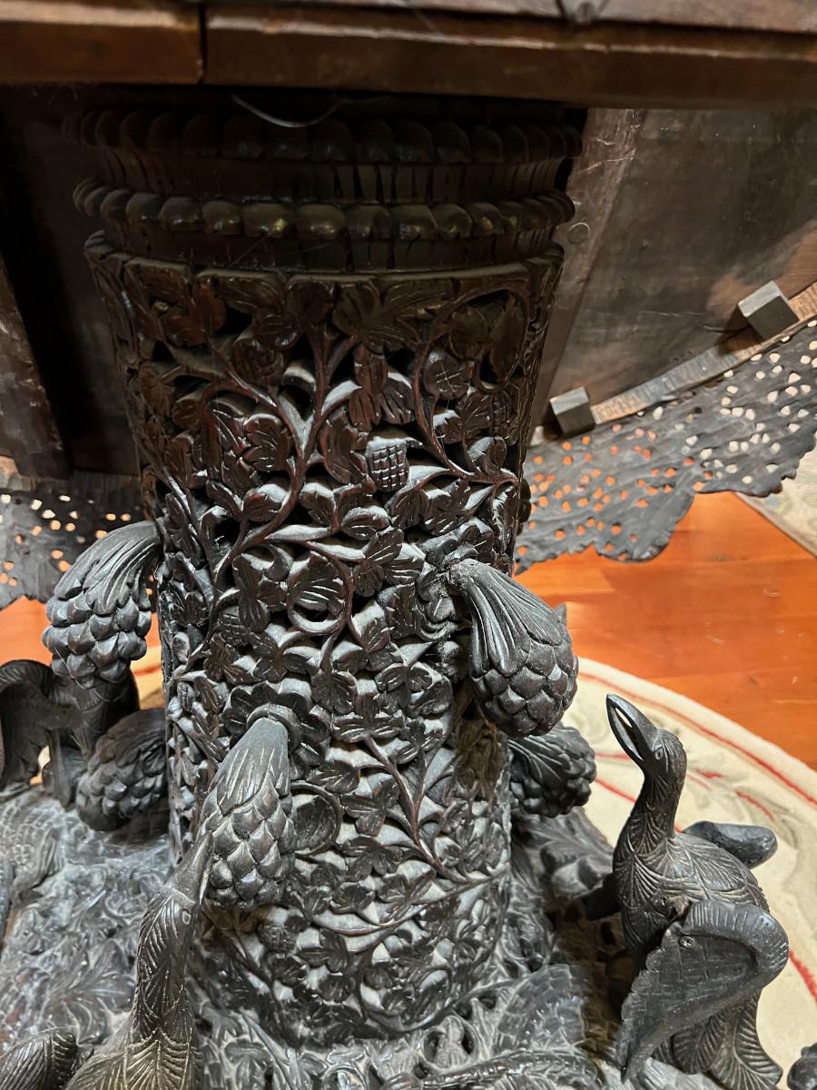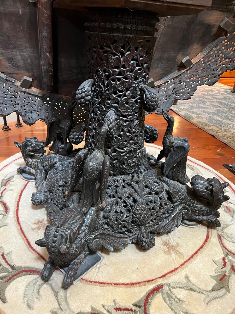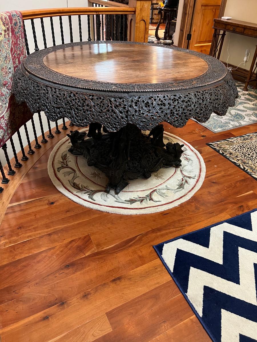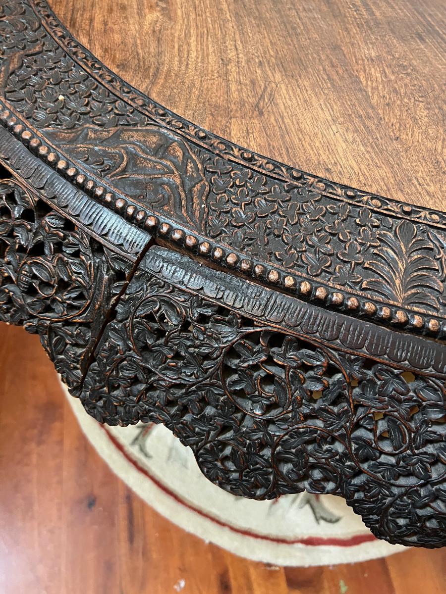 This beautifully carved table is from the late 1800's most likely 1890's. Finely carved rosewood of British East Indian Origin. Table does have some age related damage and wear, it appears to also have been repaired in the past but I believe it to be the original finish. Regardless this is a one of a kind piece and quite rare. 48" diameter and 31" tall, Top will swivel as shown for display.