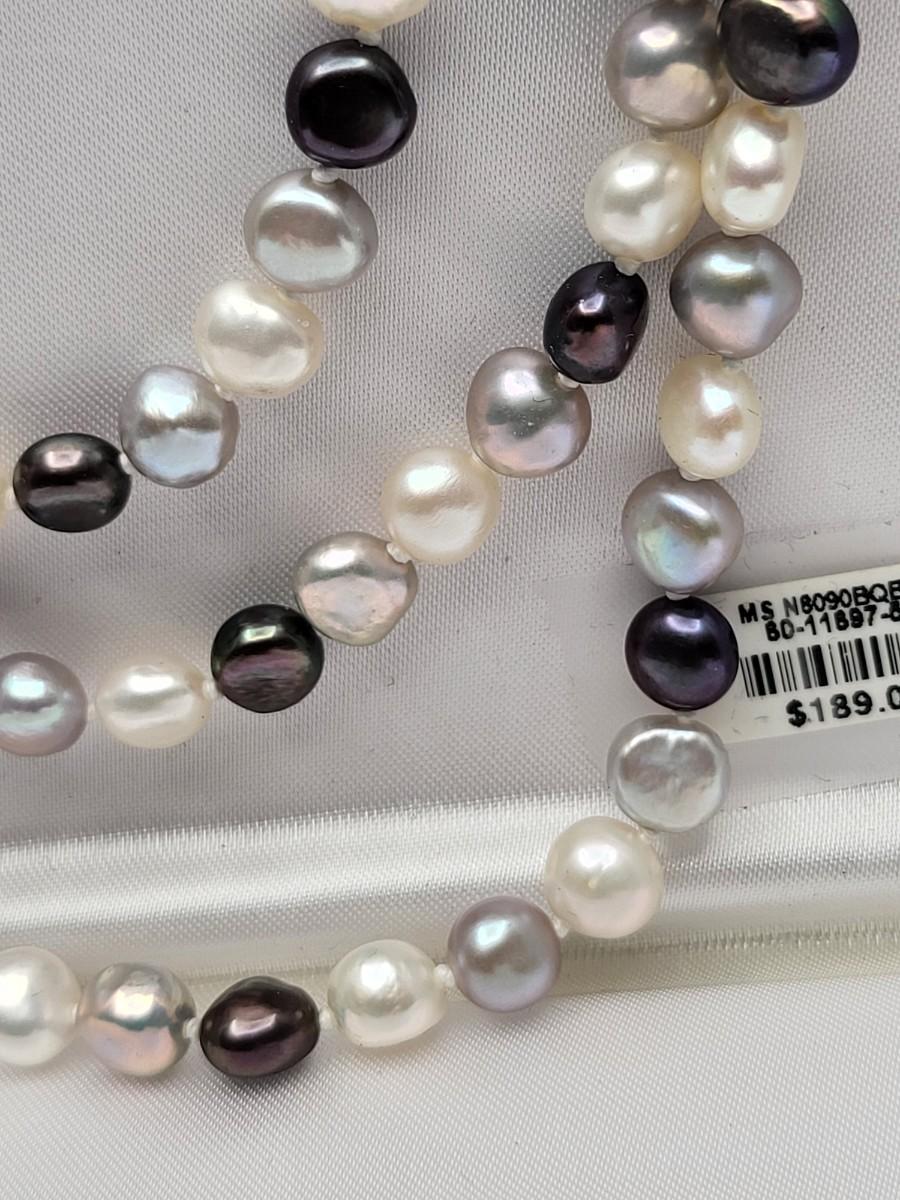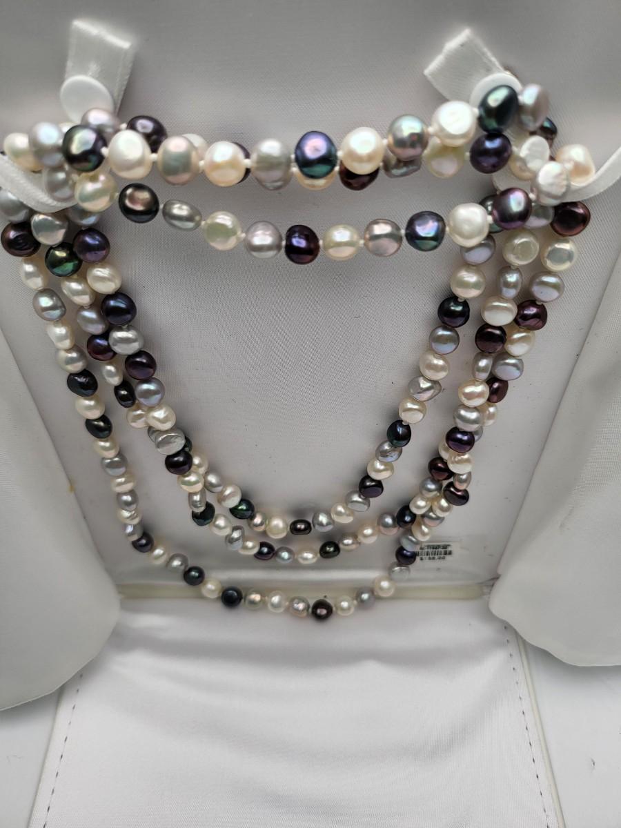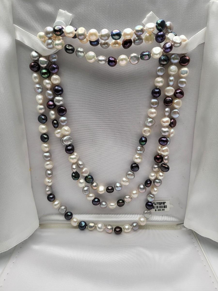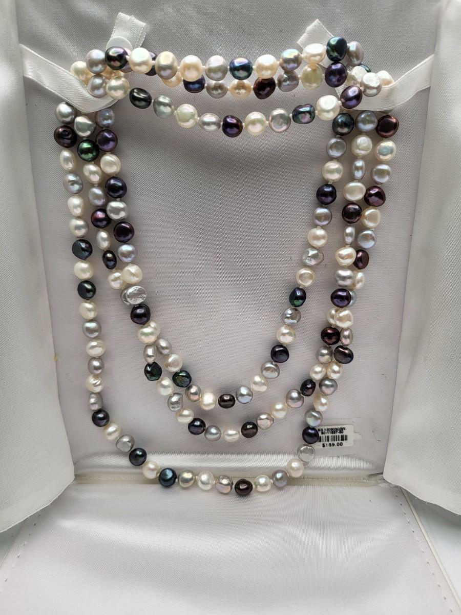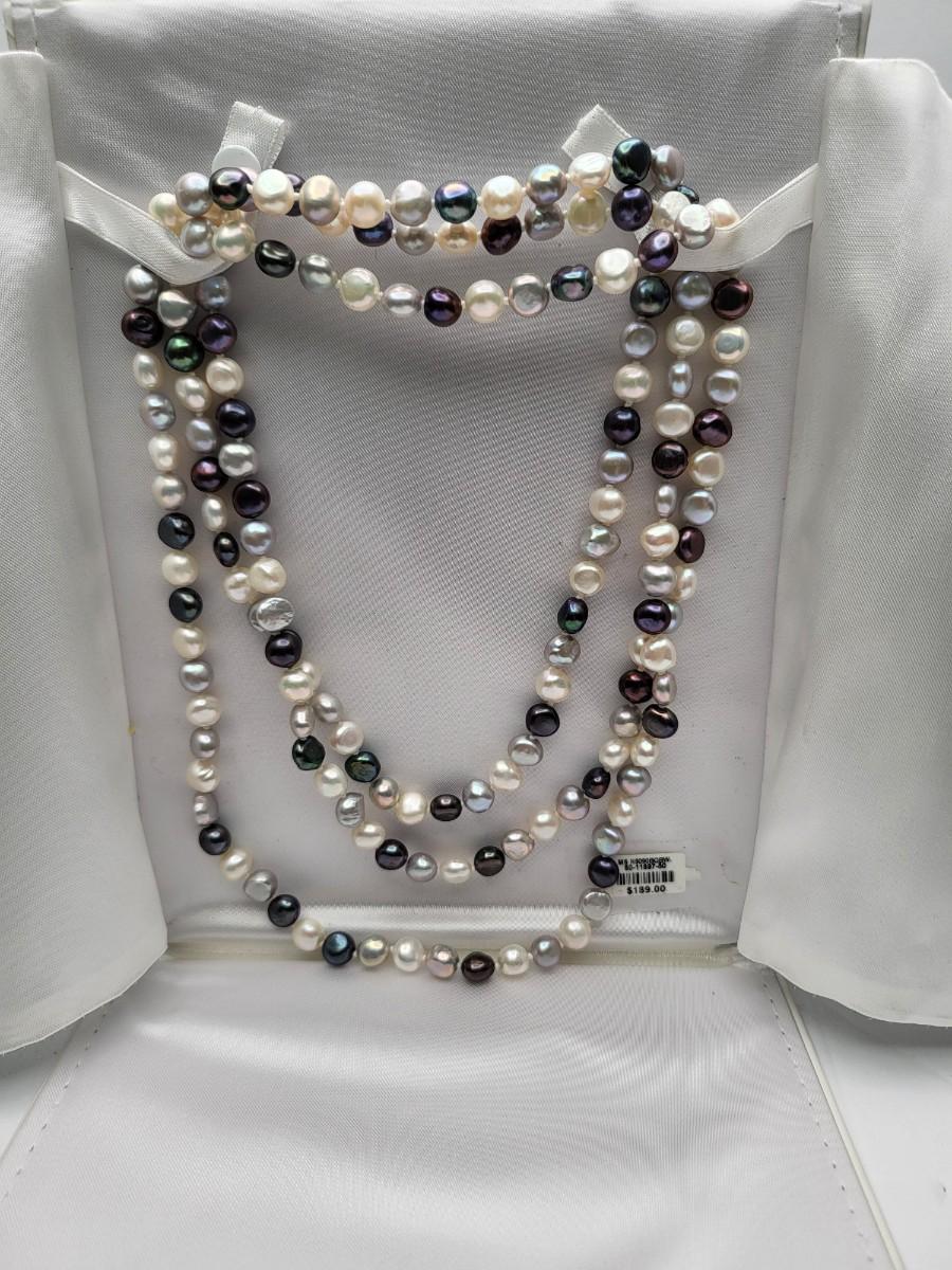 New, in Burton jewelers box. Gorgeous 53" continuous genuine freshwater pearls, multi-color strand necklace.