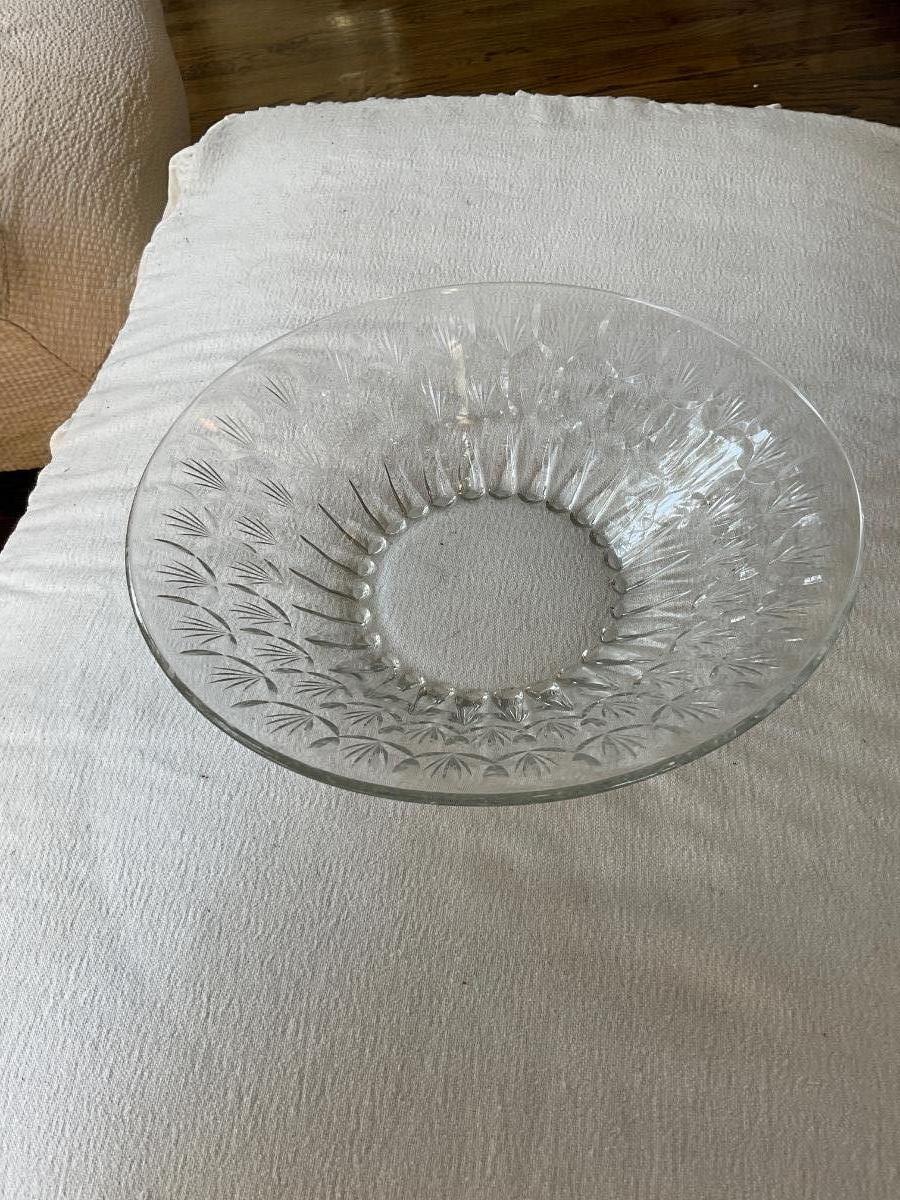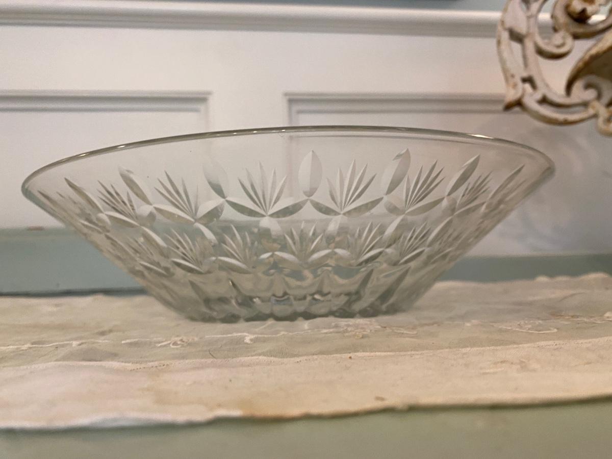 Stunning Antique Fine Cut Crystal bowl from Squire Mansion. Wide Flared Cut Glass with simple pattern of what looks like tulips along side. Measures about 16” diameter 4” tall.