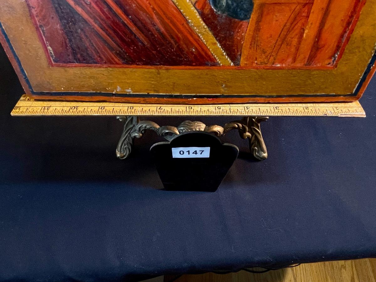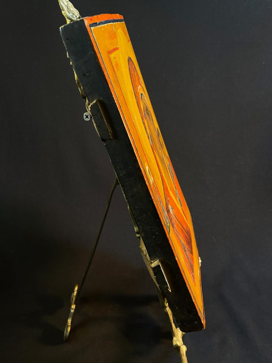 The subject item is a fine authentic Russian Icon of Our Lady of Kazan 1st of Moscow. The icon features a sensitively rendered Mother Mary adoring the Christ Child as he makes the sign of Blessing with his proper right hand, on a thick, slightly bowed plank with trenched cross-bar supports. The image is in very good condition, considering the fragile nature of this art form. There may be some slight touch-up done to the surrounding border, but this image itself appears unaltered in any way.