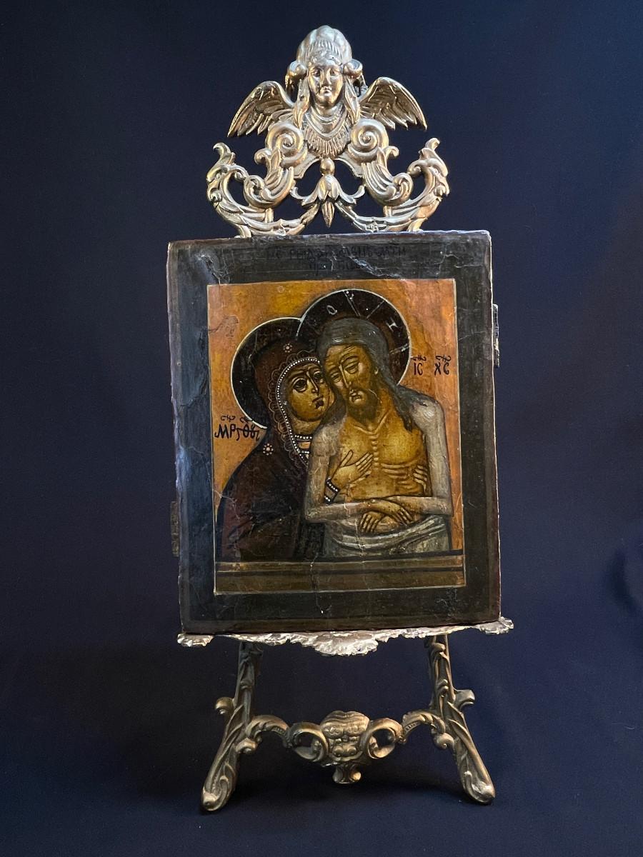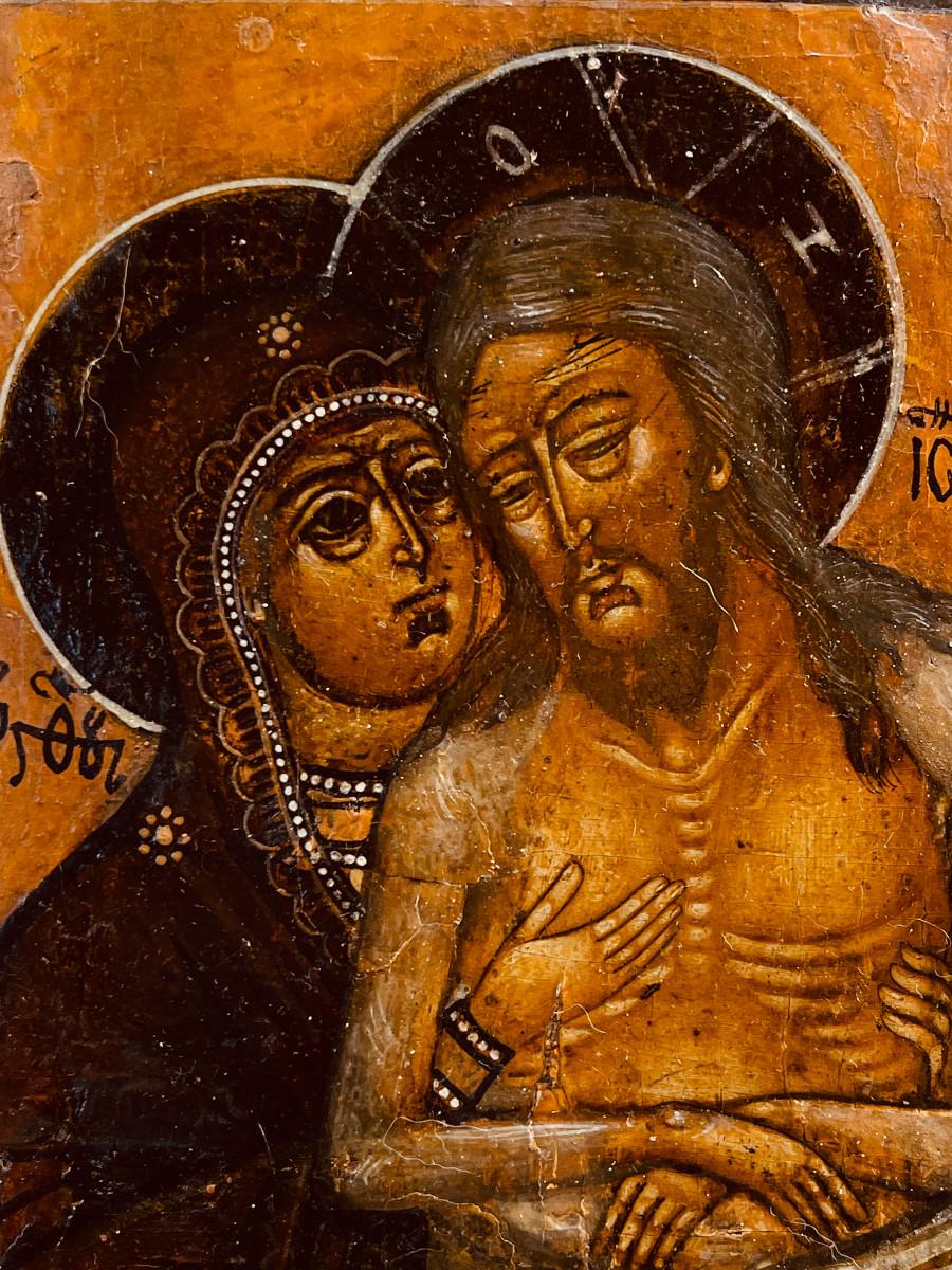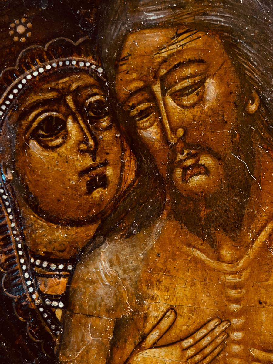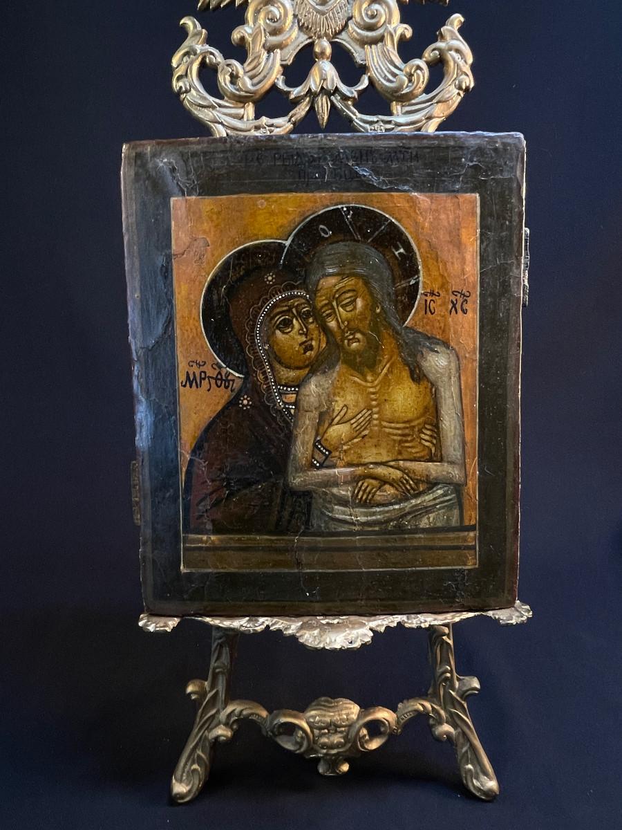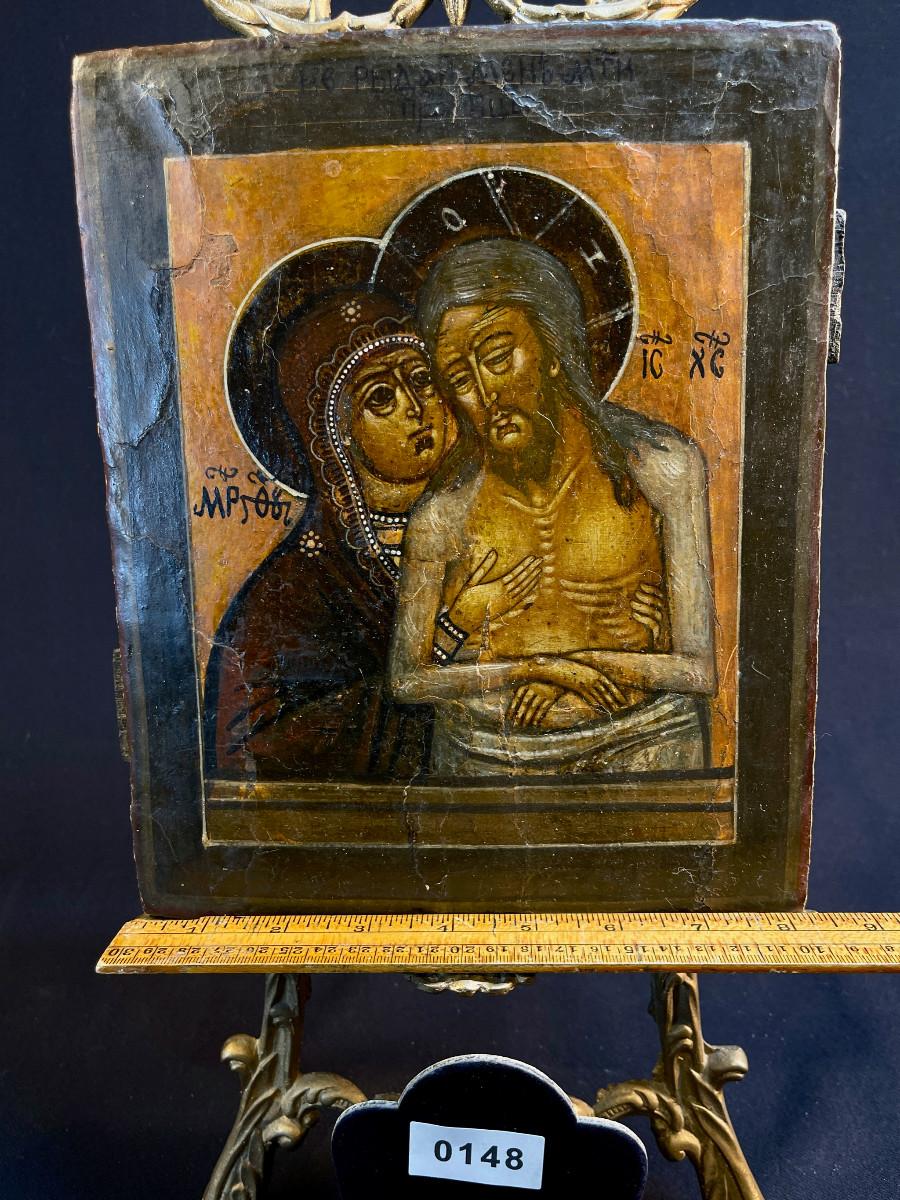 The subject item is a fine Russian Icon of Sorrows. The icon, posing the Mother Mary supporting the body of the Sacrificed Christ, is rendered in the traditional manner on a thick, slightly bowed plank with trenched cross-bar supports. The image is in very good condition, considering the fragile nature of this art form.