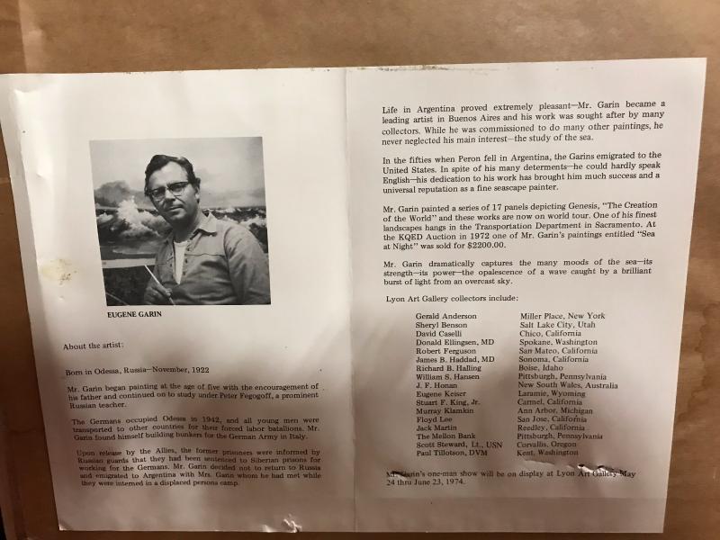 Born in Russia in 1922, Eugene Garin studied with the famous Russian artist Peter Effremovich Fedatov during his youth. The works of I. K. Aivazowsky later influenced him. Combining the traditional beauty of European art with contemporary techniques he has created revolution methods of seascape painting.