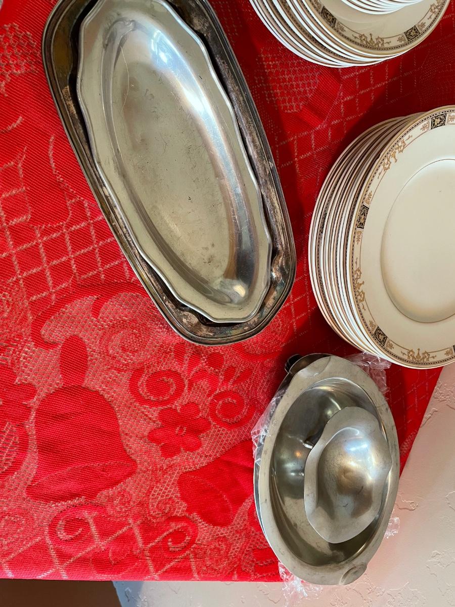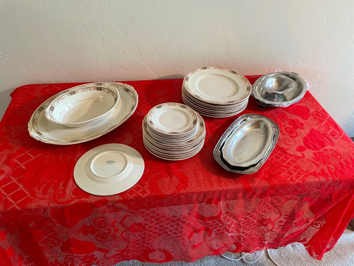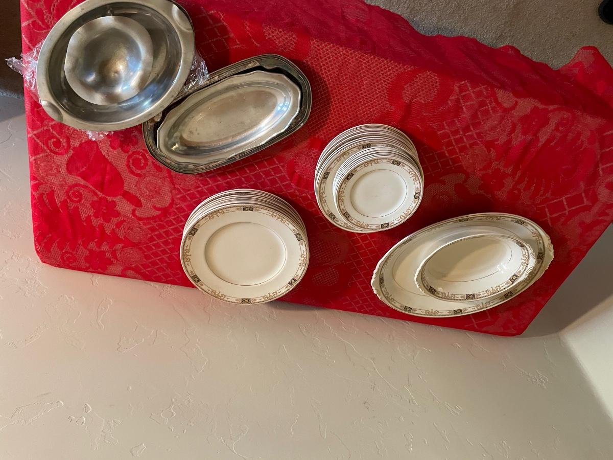 31 piece Webster Olde Ivory Syracuse fine china as seen in photos and miscellaneous pewter and plate serving pieces