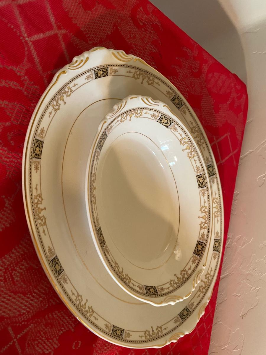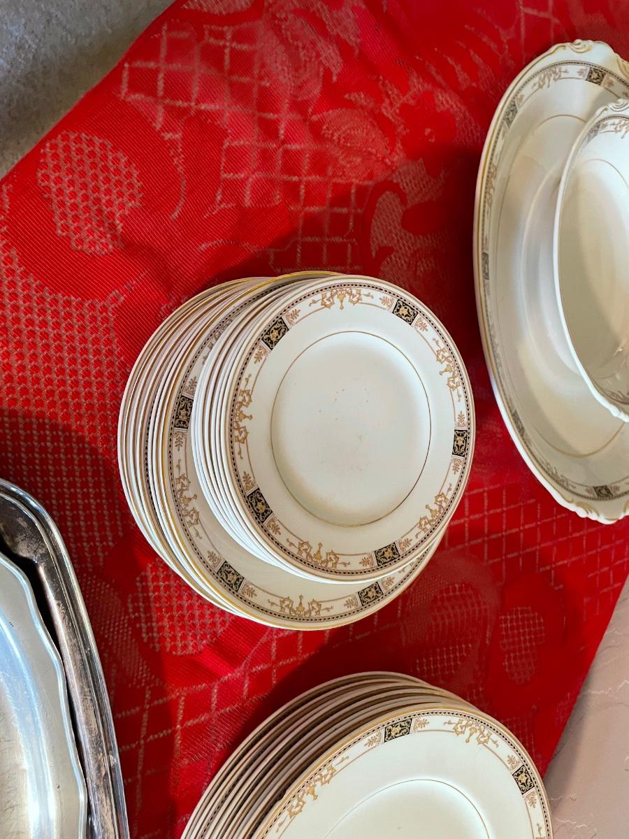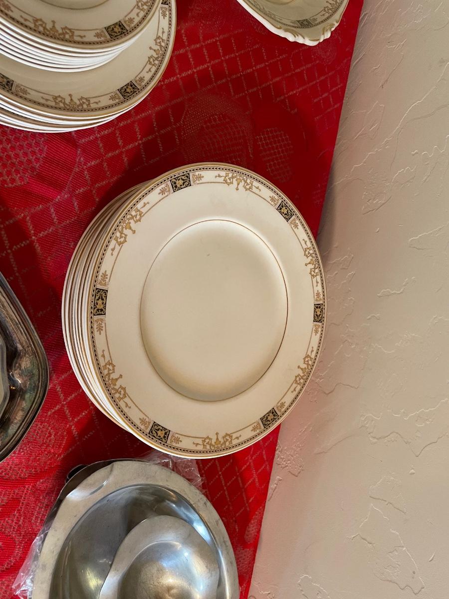 31 piece Webster Olde Ivory Syracuse fine china as seen in photos and miscellaneous pewter and plate serving pieces