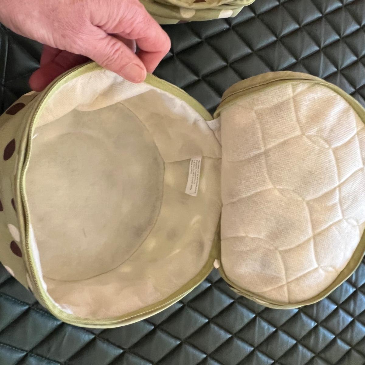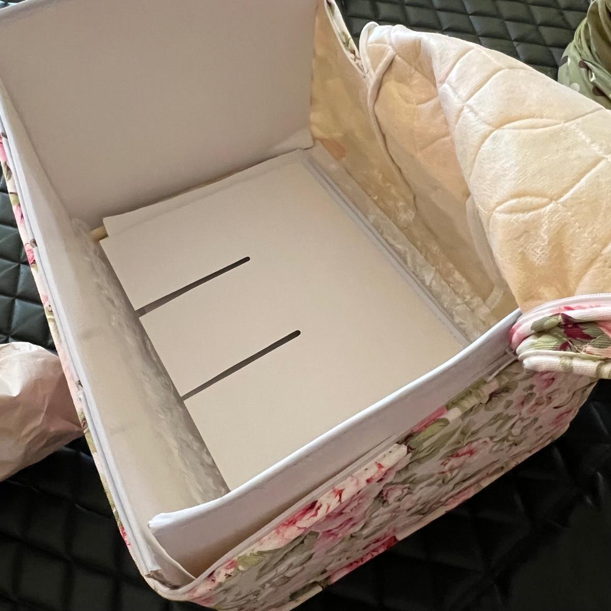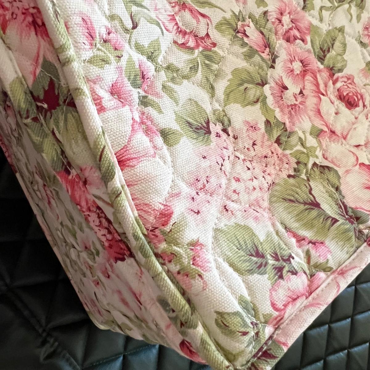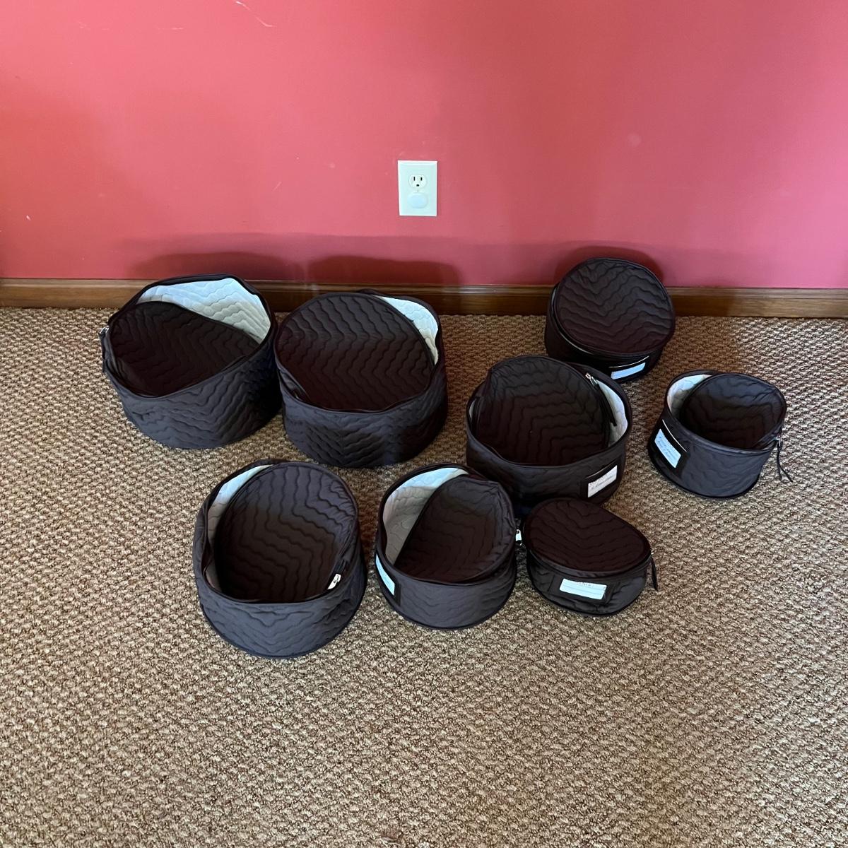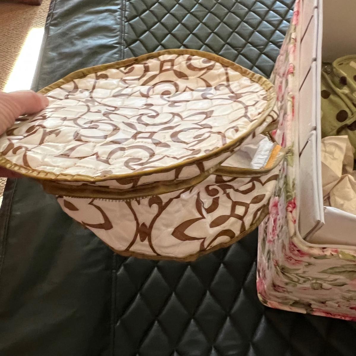 Large assortment of soft sided storage bags in a range of sizes for dinner plates and side plates or bowls. The pink floral tote is the largest and measures 15” x 13” x 10”H.
