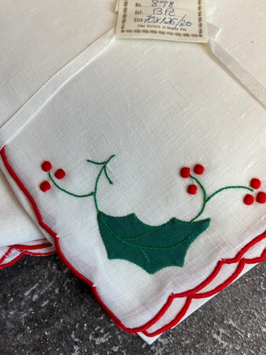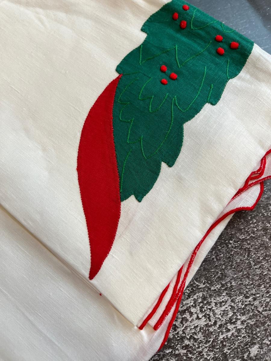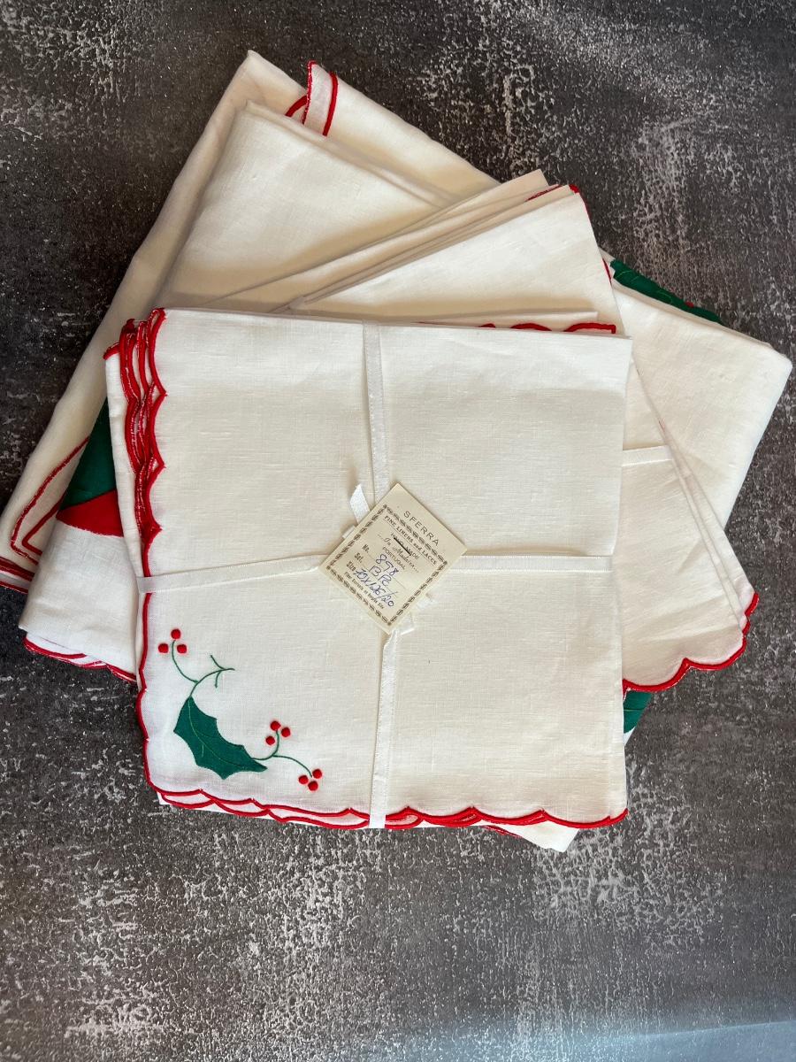 The tablecloth measures 70" x 126" and comes with 12 napkins. Decorated with holly, wreaths, and garlands in red and green. These linens were originally purchased at Shaxted in Chicago (for those of you who remember that gorgeous store), made by Sferra in Madeira, Portugal.