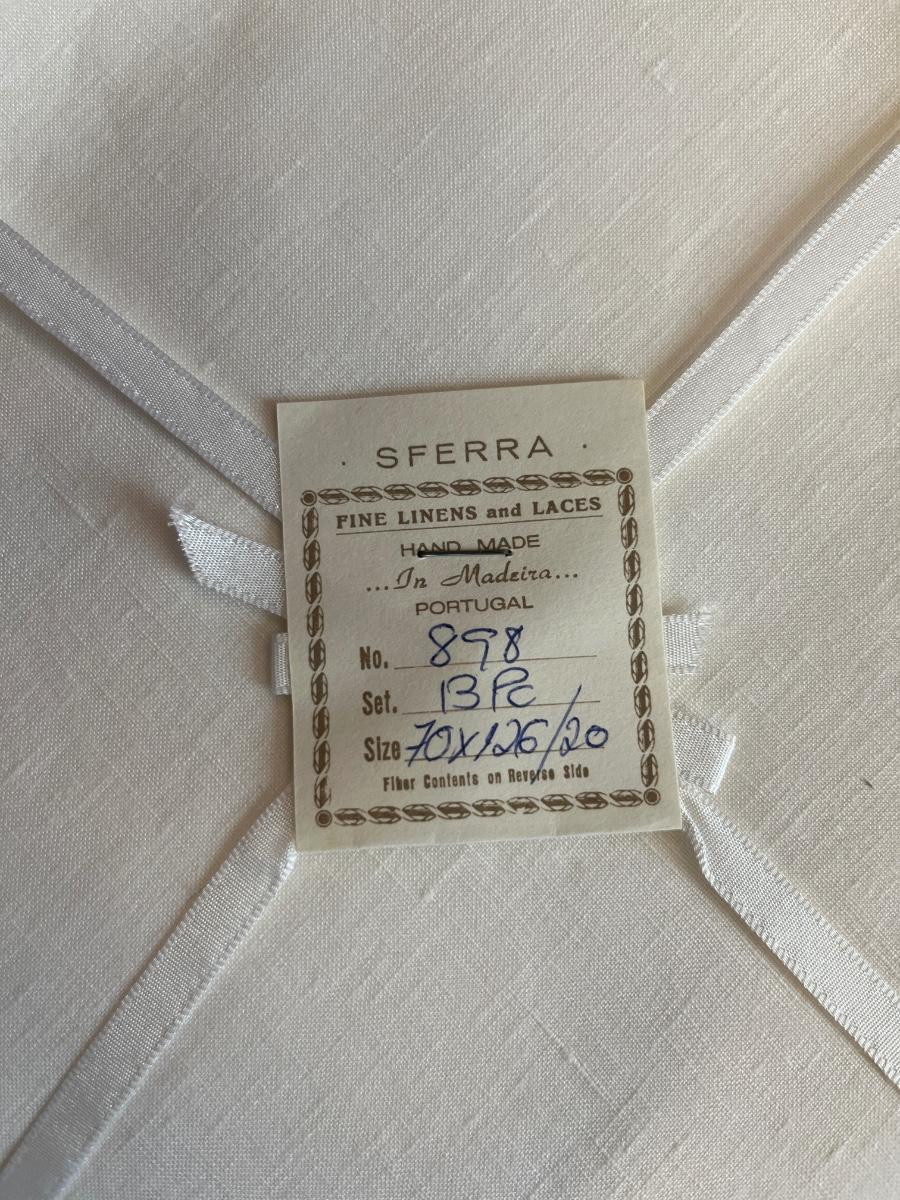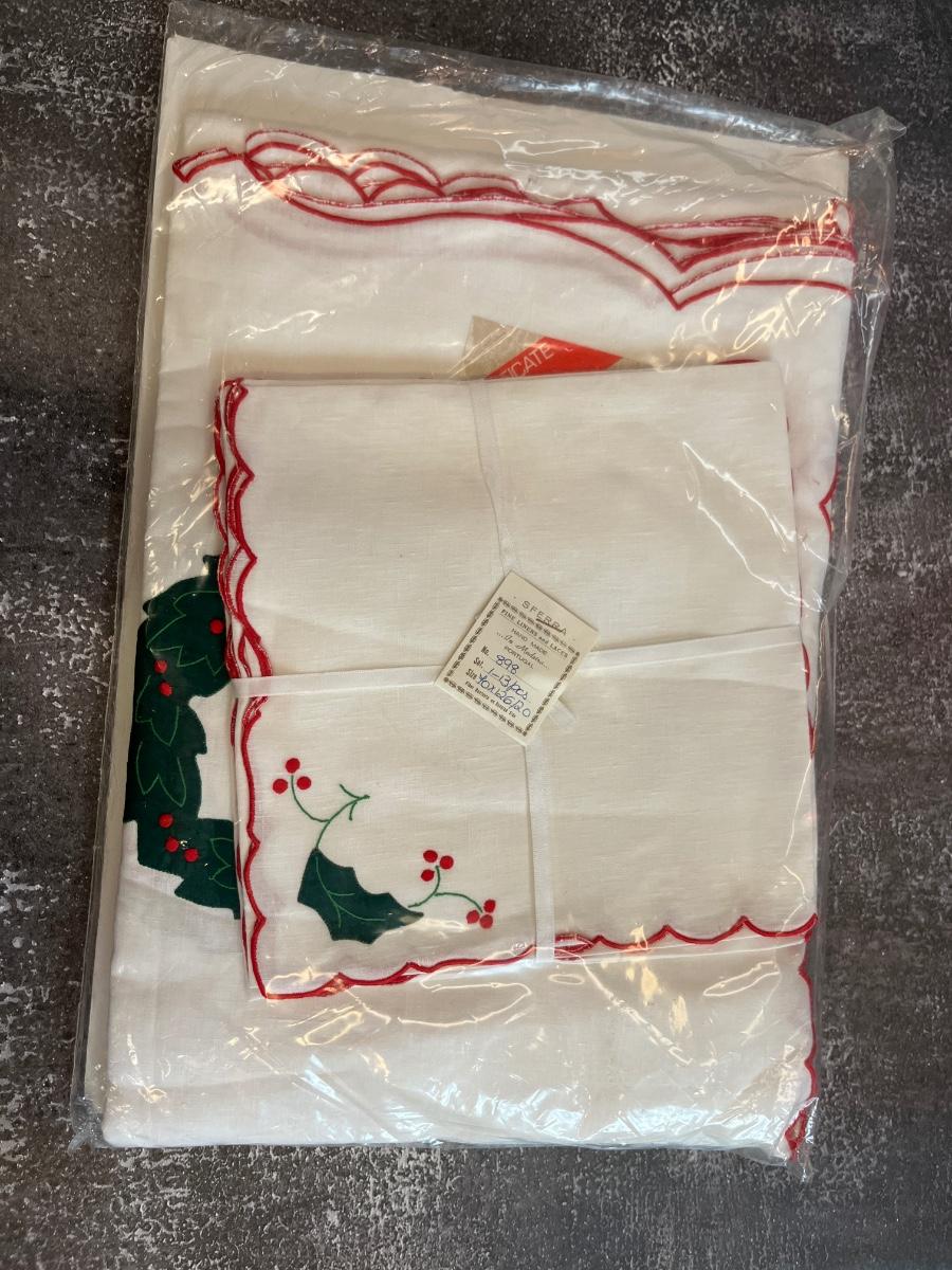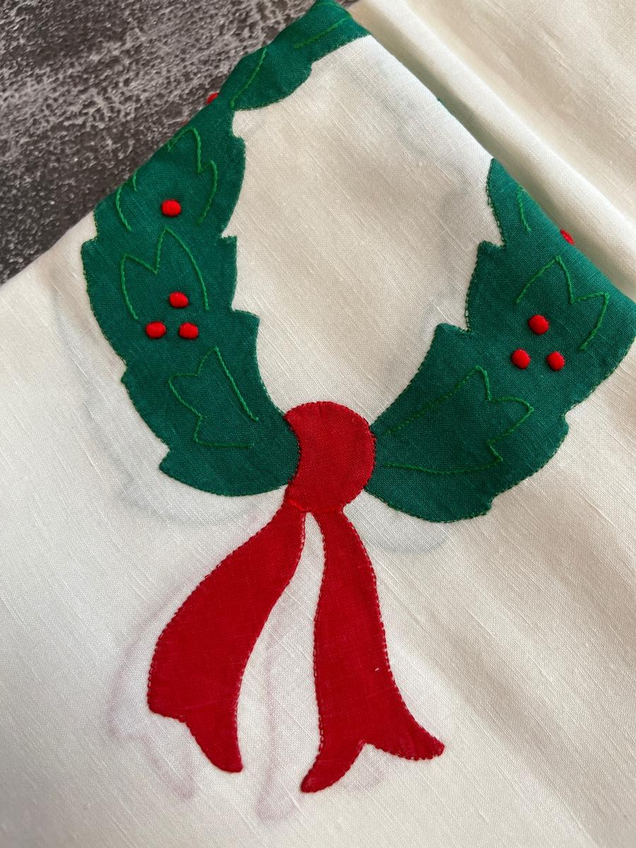 The tablecloth measures 70" x 126" and comes with 12 napkins. Decorated with holly, wreaths, and garlands in red and green. These linens were originally purchased at Shaxted in Chicago (for those of you who remember that gorgeous store), made by Sferra in Madeira, Portugal.