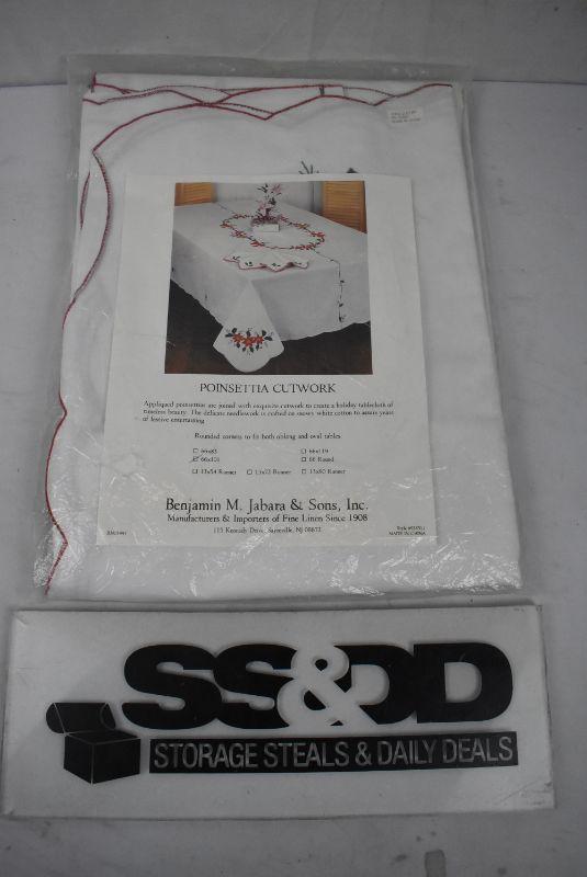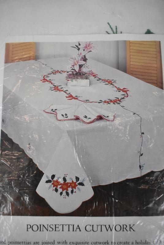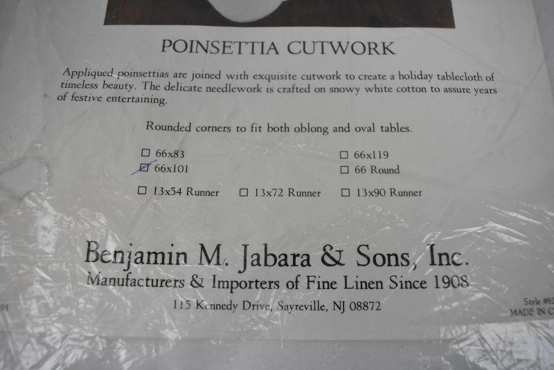 Fine Linen Poinsettia Cutwork Tablecloth, 66x101. New old stock