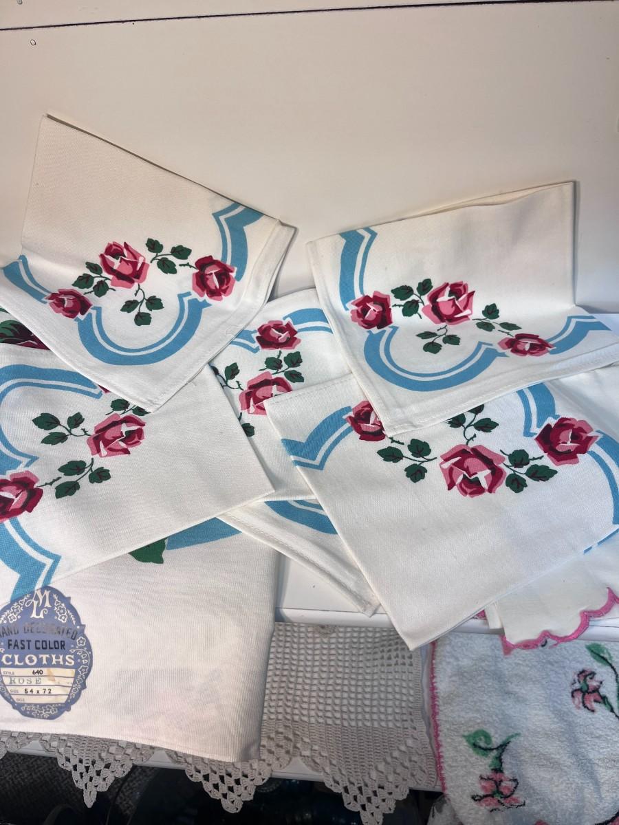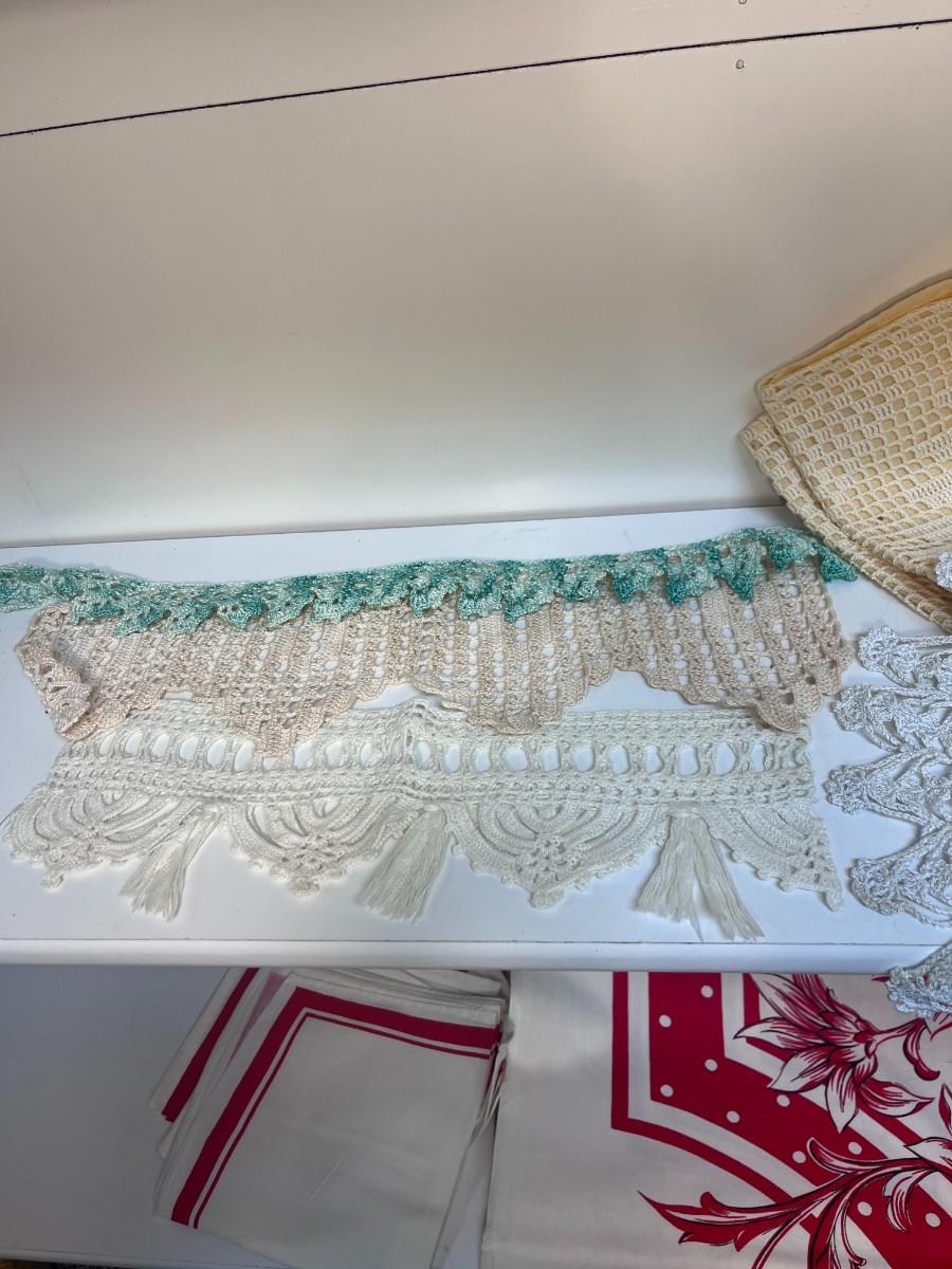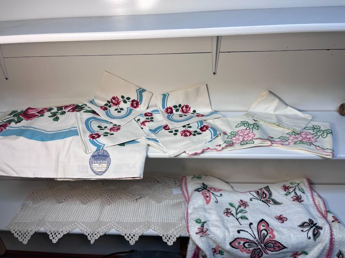 FINE LINEN TABLECLOTH AND NAPKINS, TEA TOWELS, DOILIES AND MORE