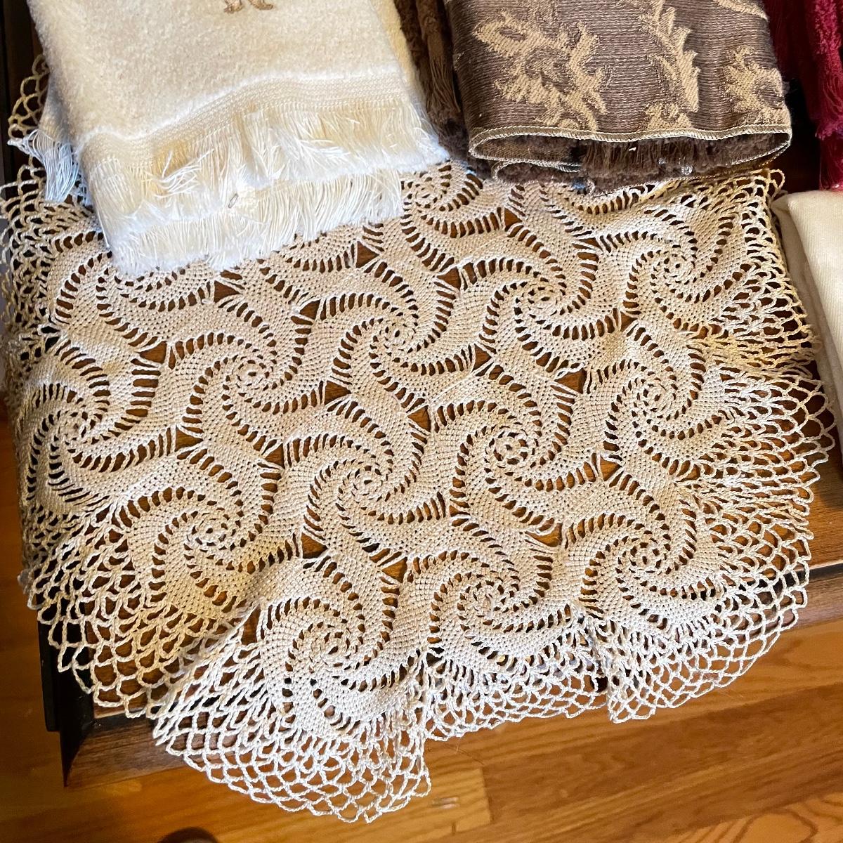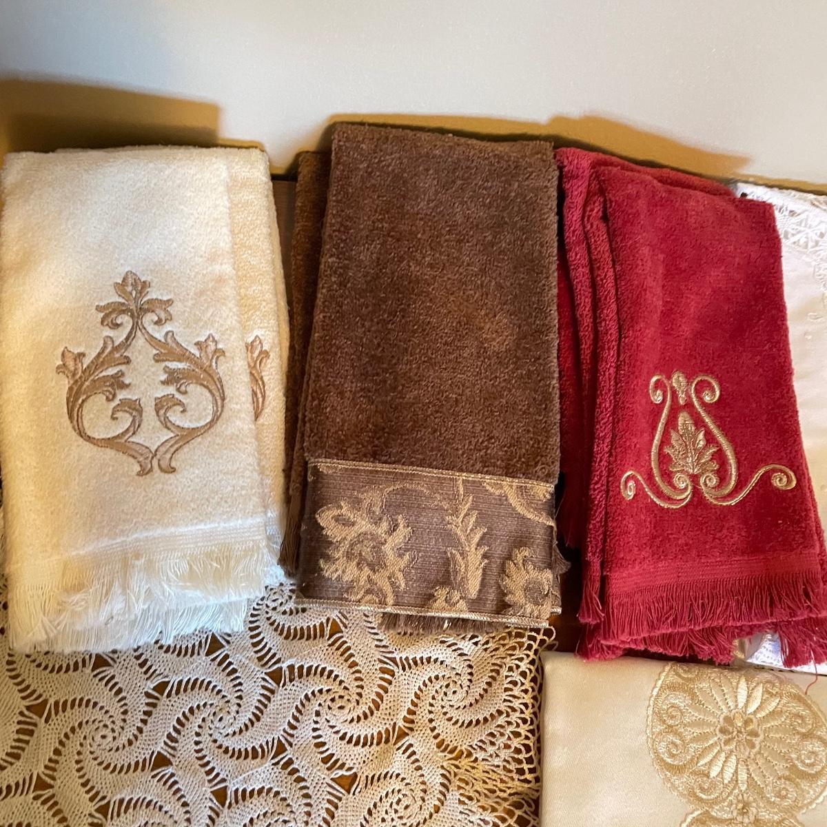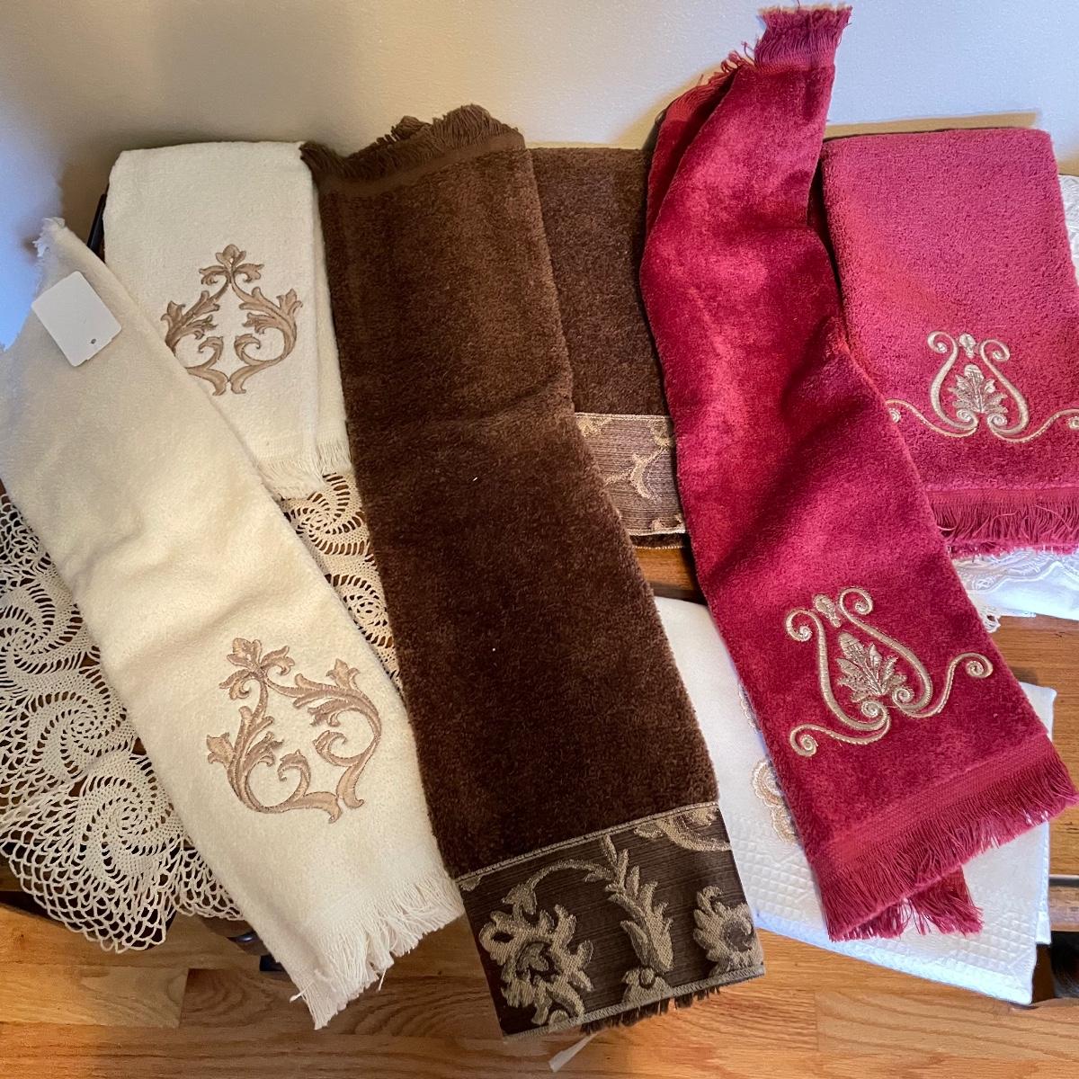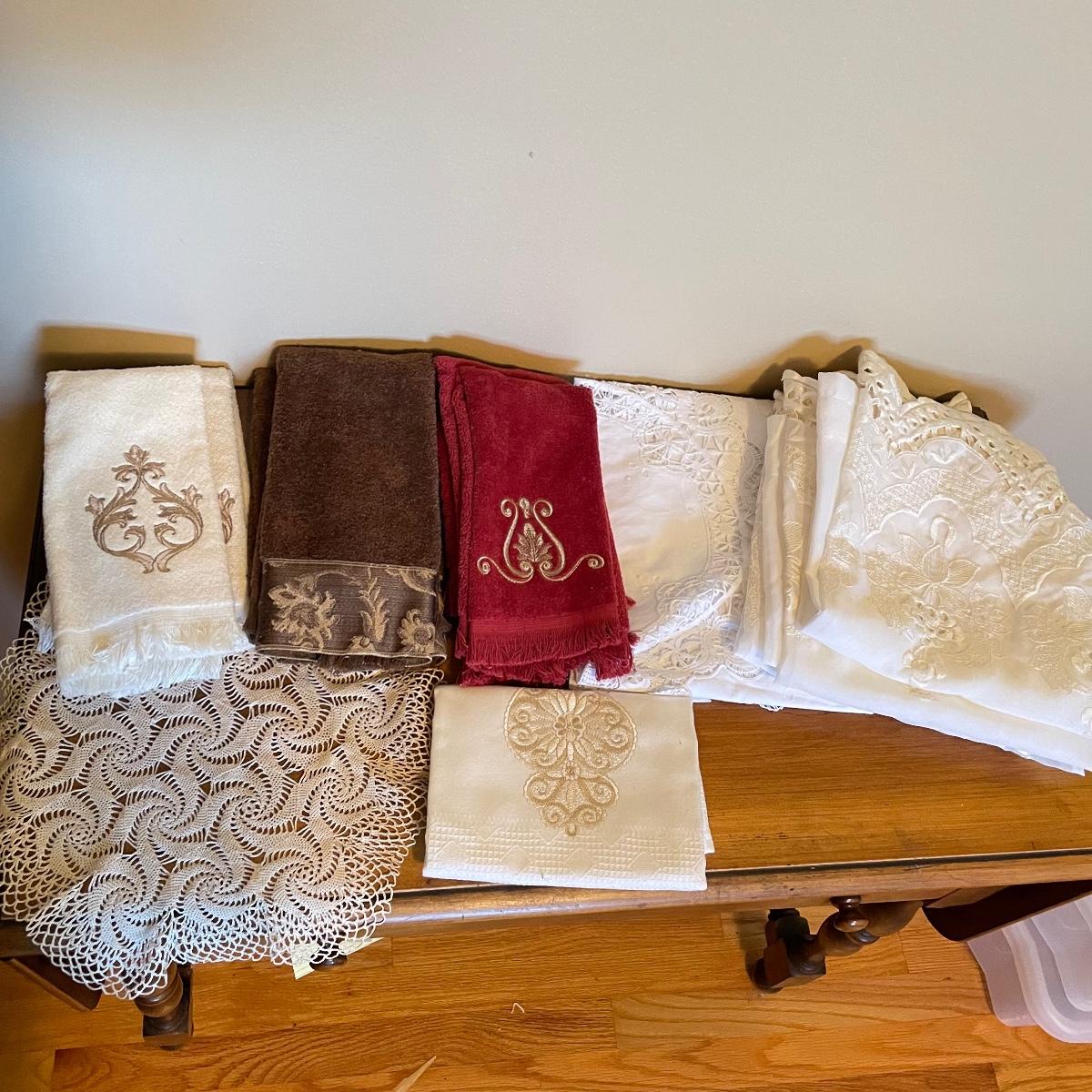 This lot includes a small selection of very nice fine linens: Three pairs of matching hand towels, four panels of sheer ivory curtains measuring 34” x 35”, a small doily, table cover and new starched tea towel. See images. Shipping Available.