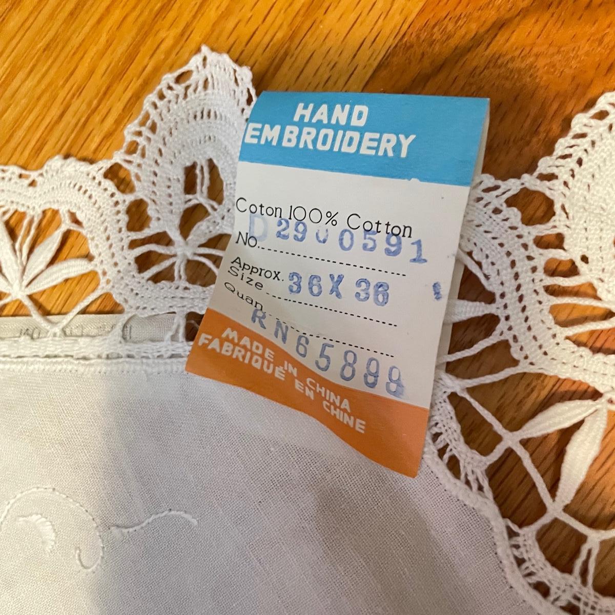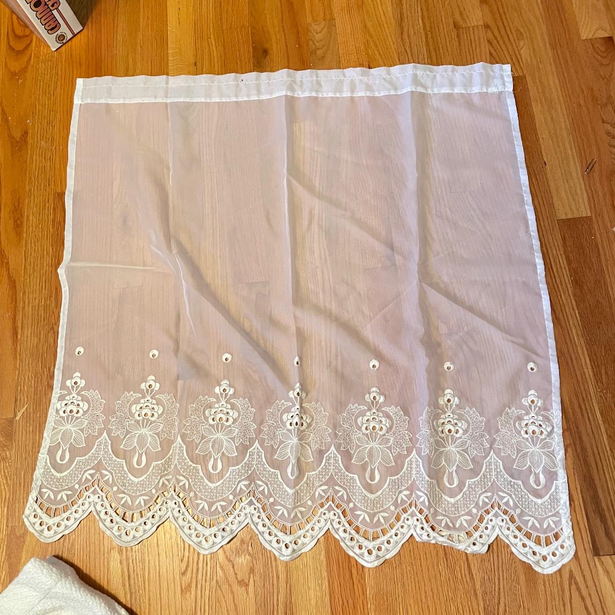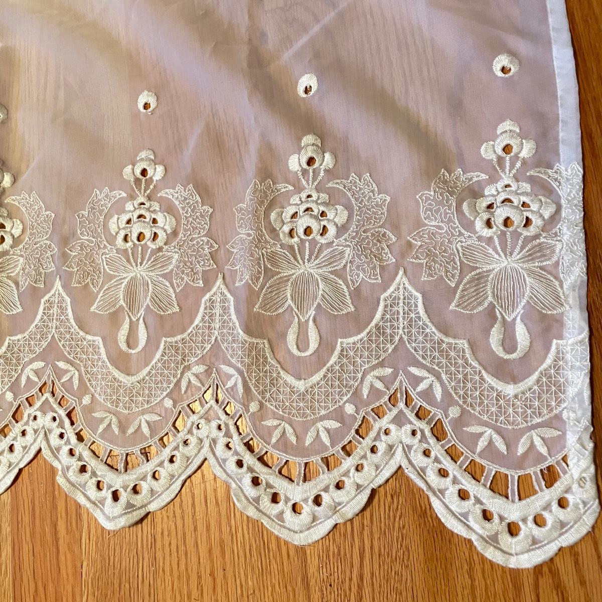 This lot includes a small selection of very nice fine linens: Three pairs of matching hand towels, four panels of sheer ivory curtains measuring 34” x 35”, a small doily, table cover and new starched tea towel. See images. Shipping Available.