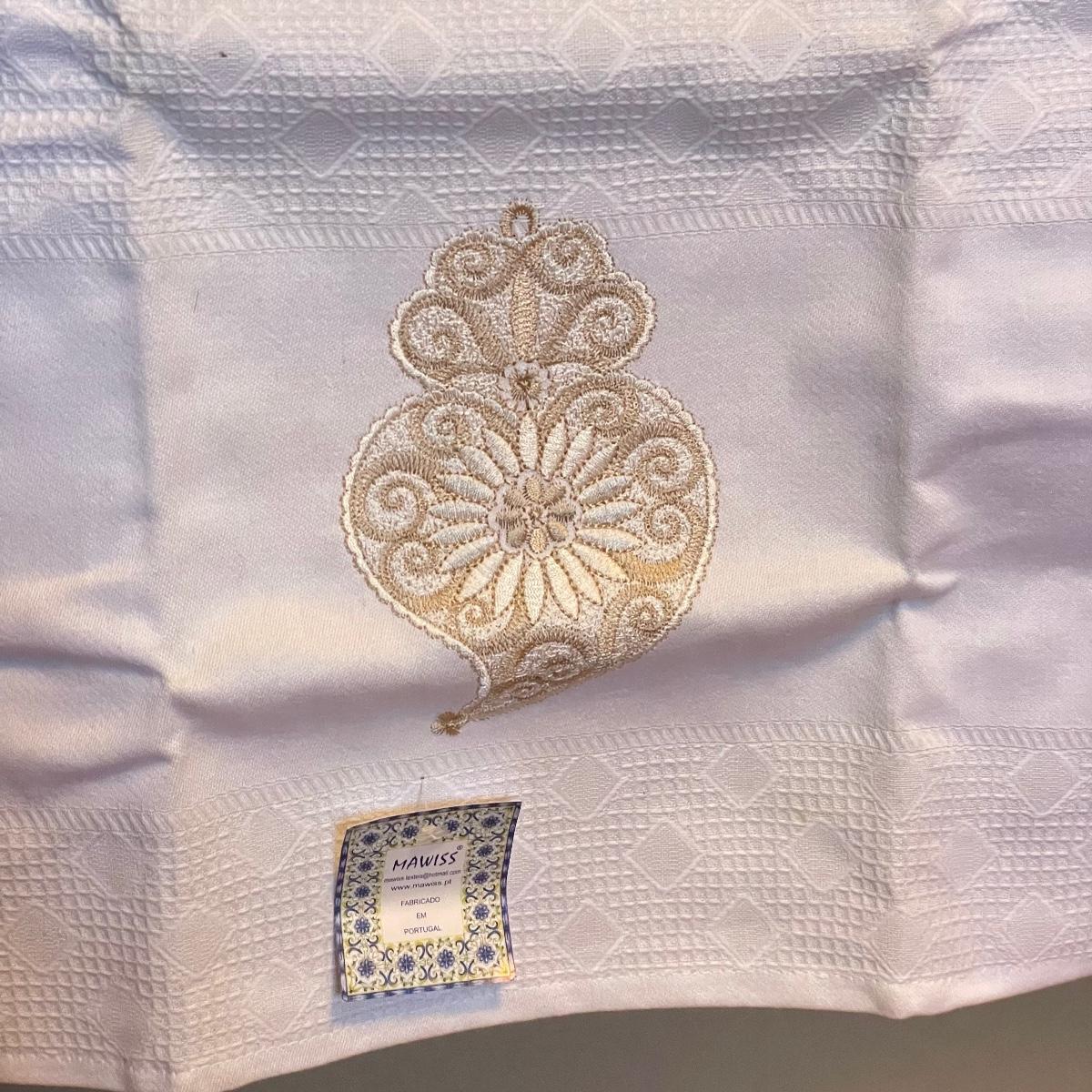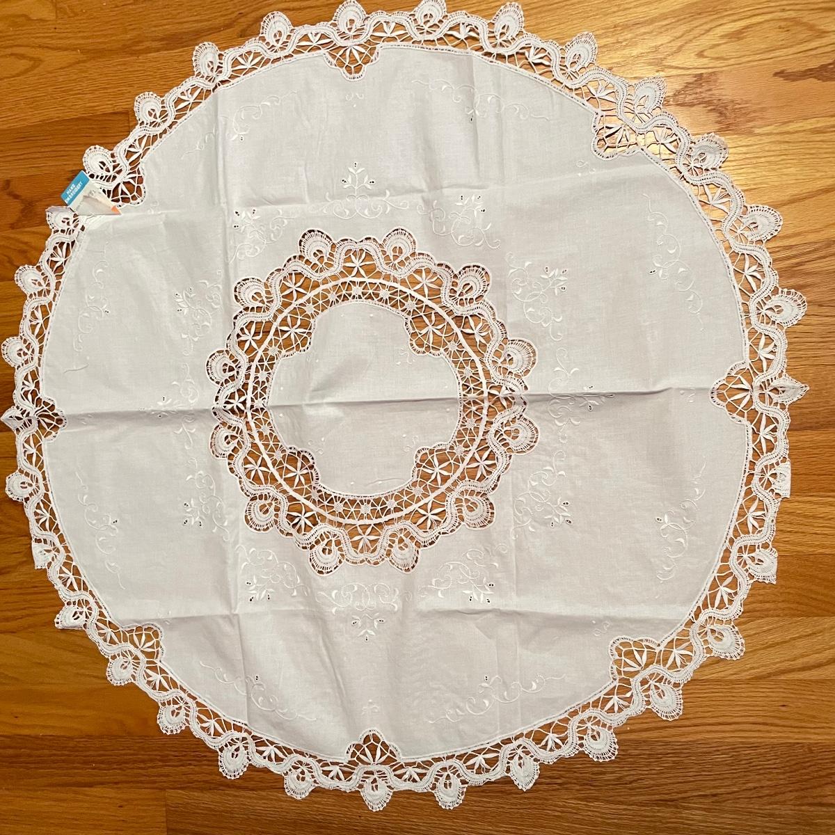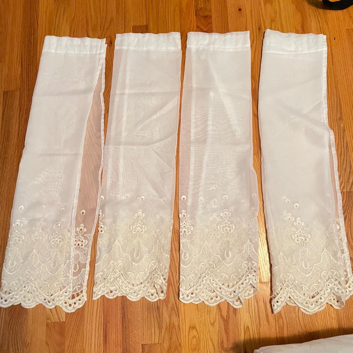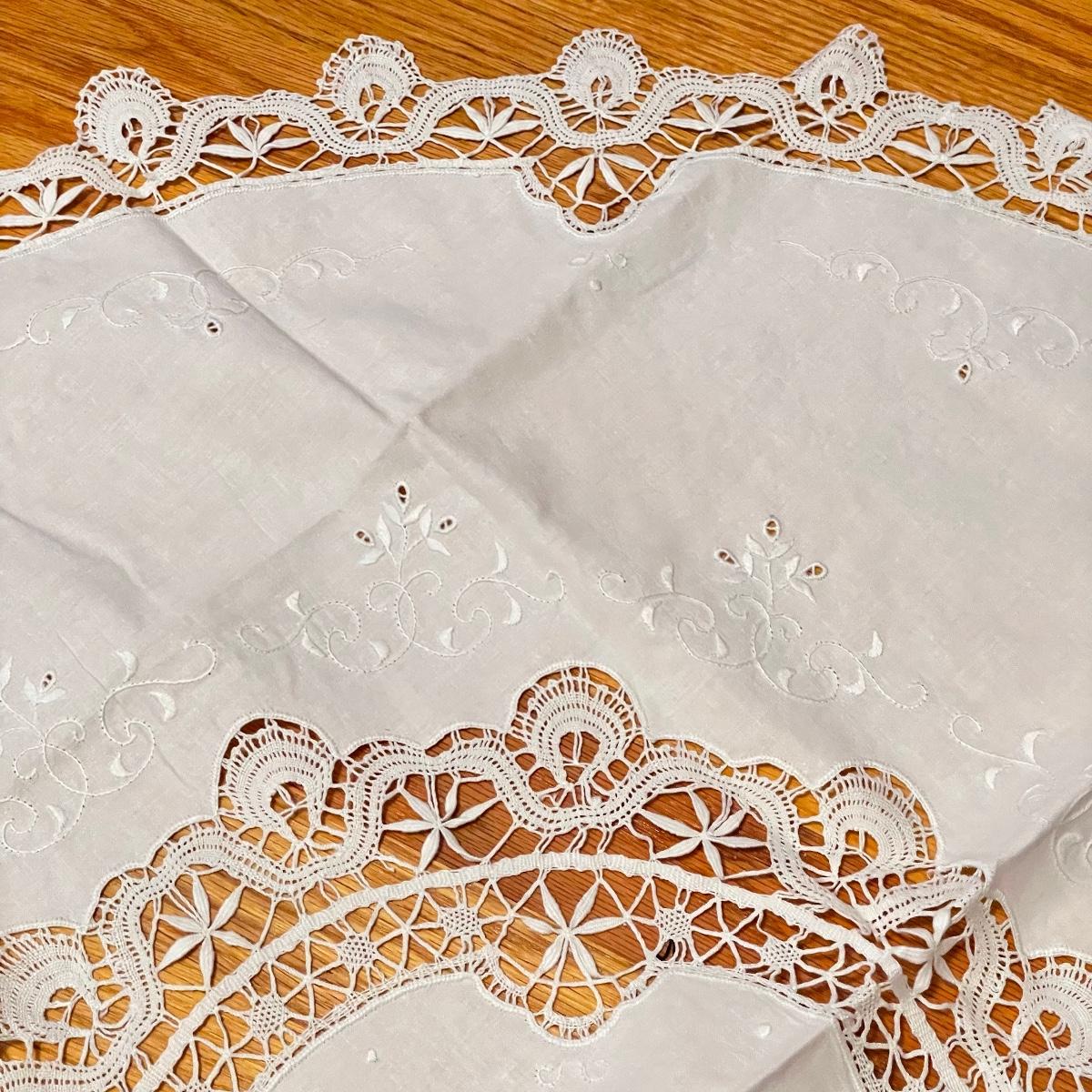 This lot includes a small selection of very nice fine linens: Three pairs of matching hand towels, four panels of sheer ivory curtains measuring 34” x 35”, a small doily, table cover and new starched tea towel. See images. Shipping Available.