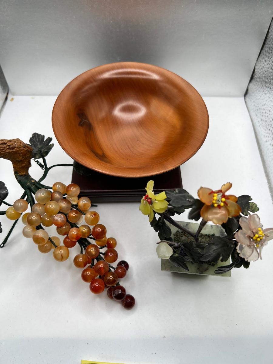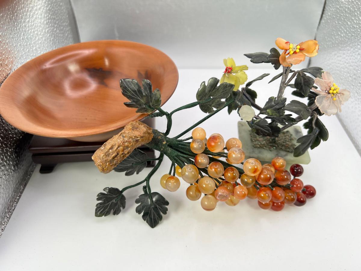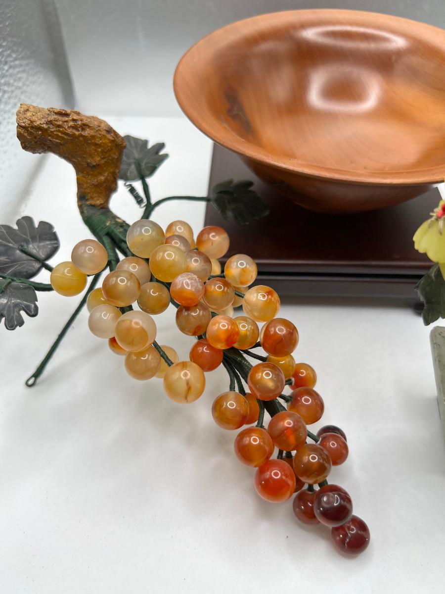 Fine turned Mahogany Bowl, Jade and stone Grapes and Flowers