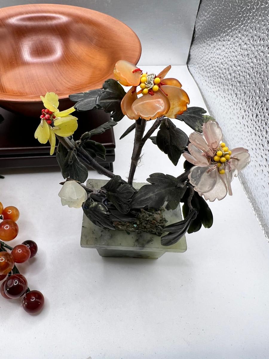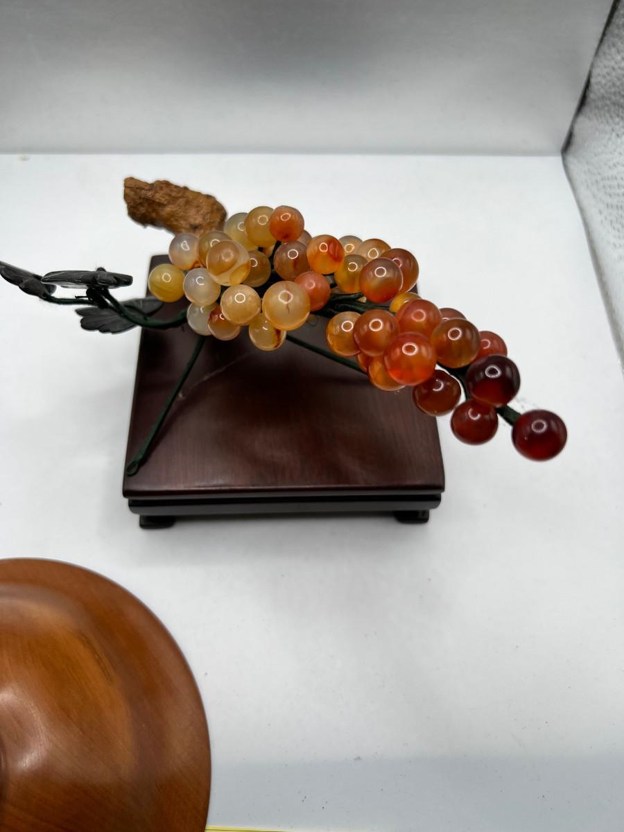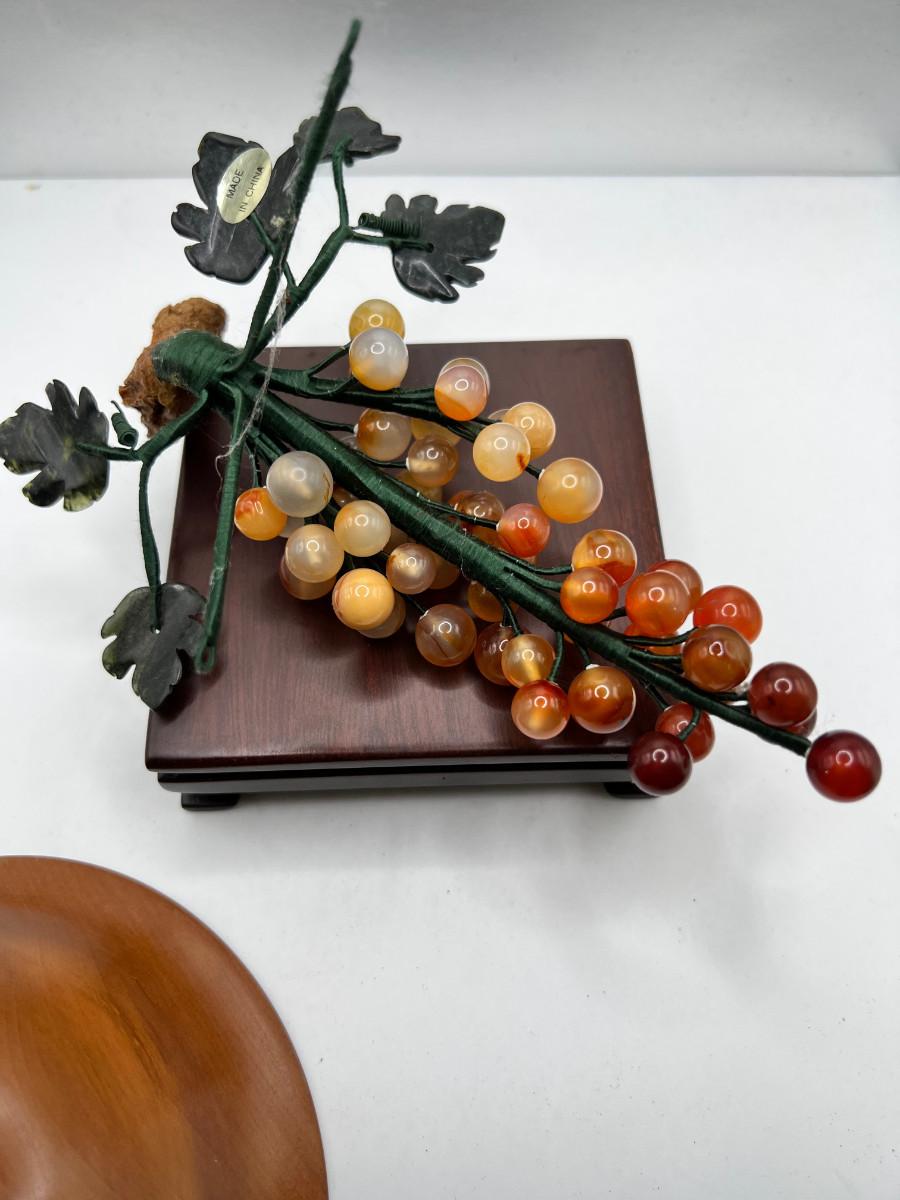 Fine turned Mahogany Bowl, Jade and stone Grapes and Flowers