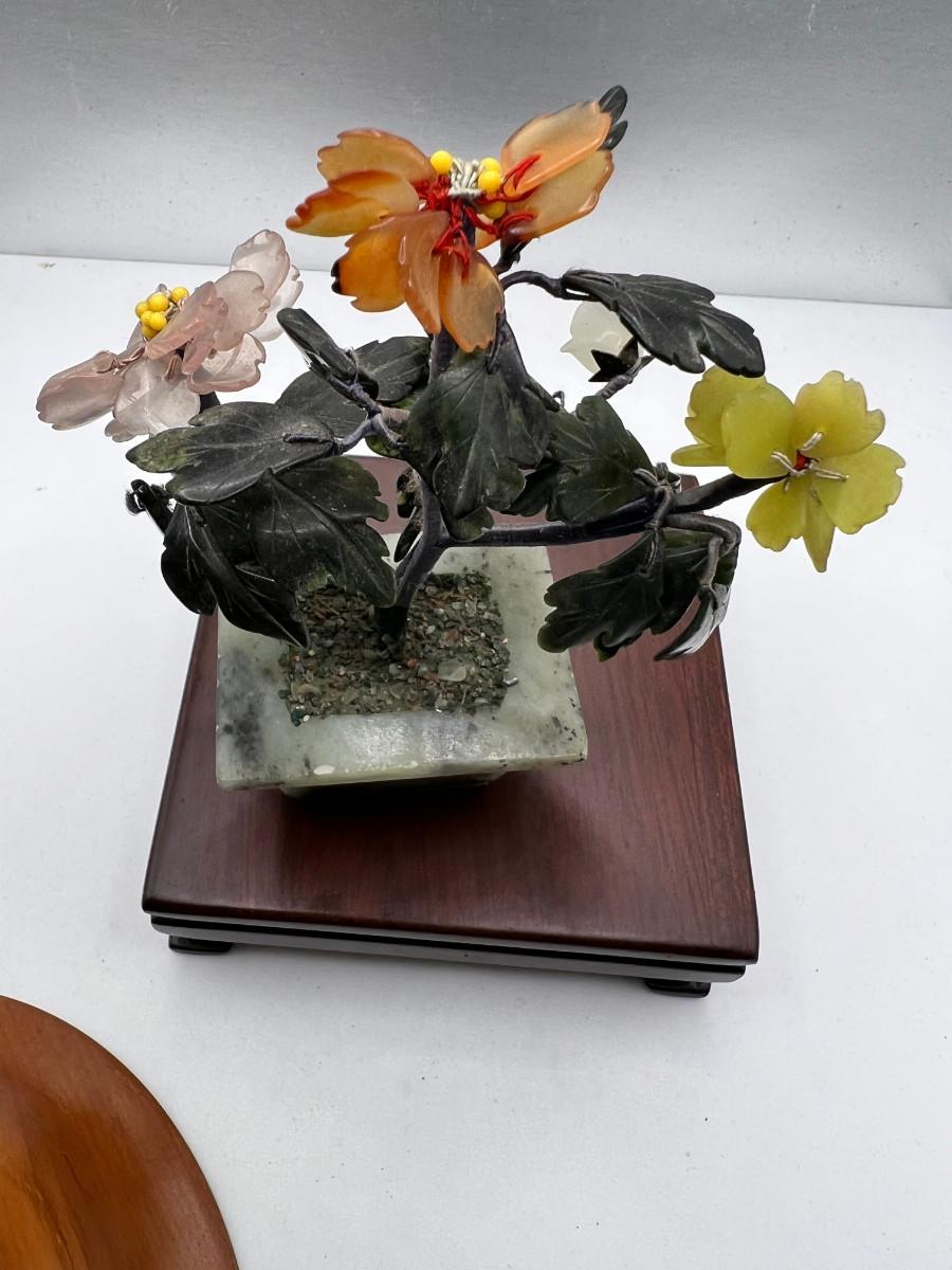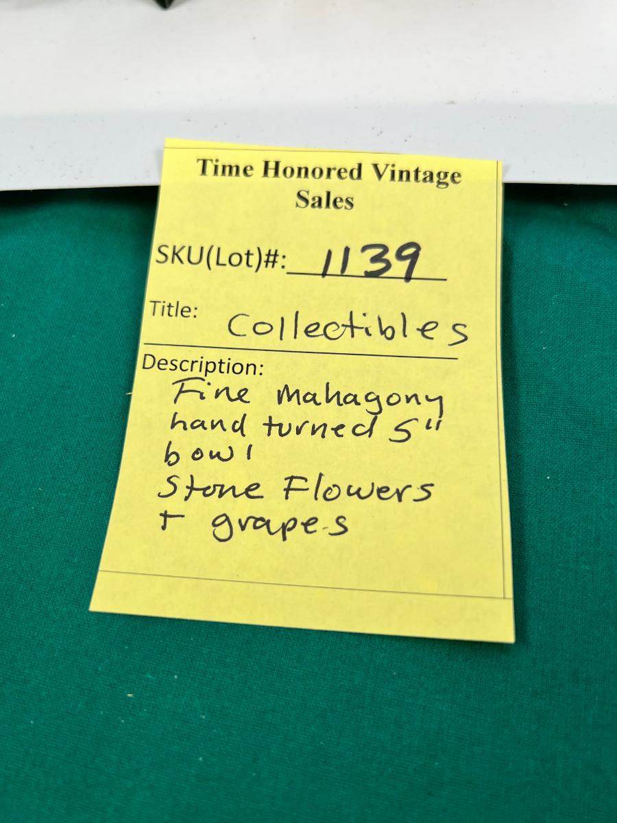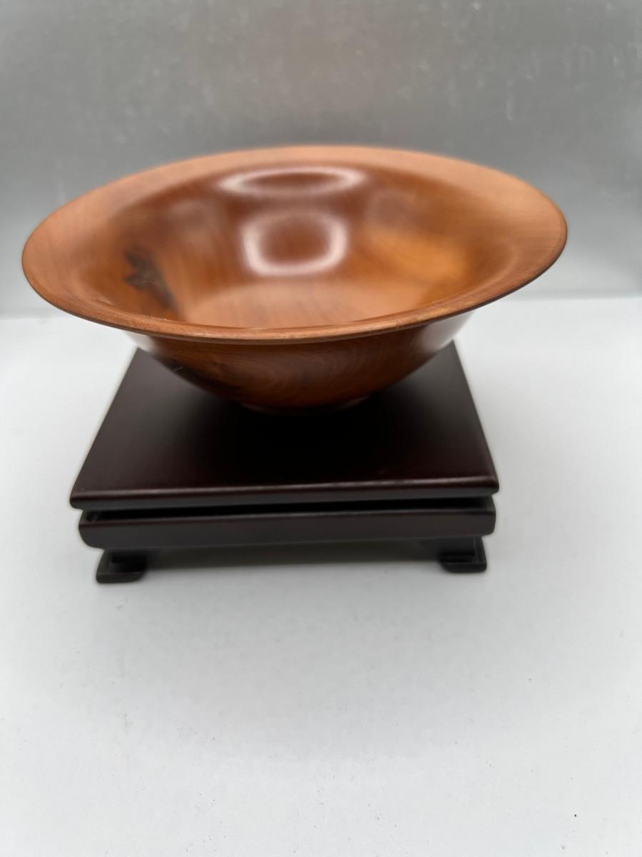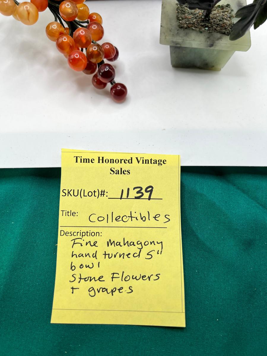 Fine turned 5" Mahogany Bowl, Jade and stone Grapes and Flowers. 4" stand.