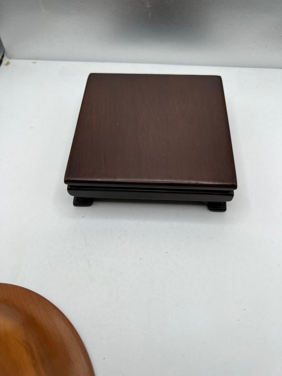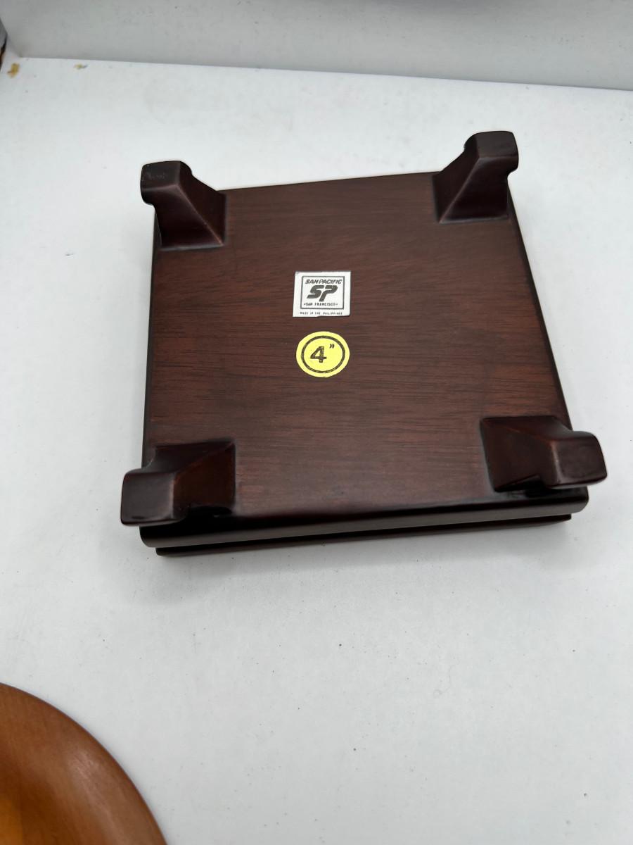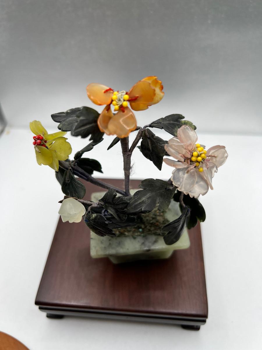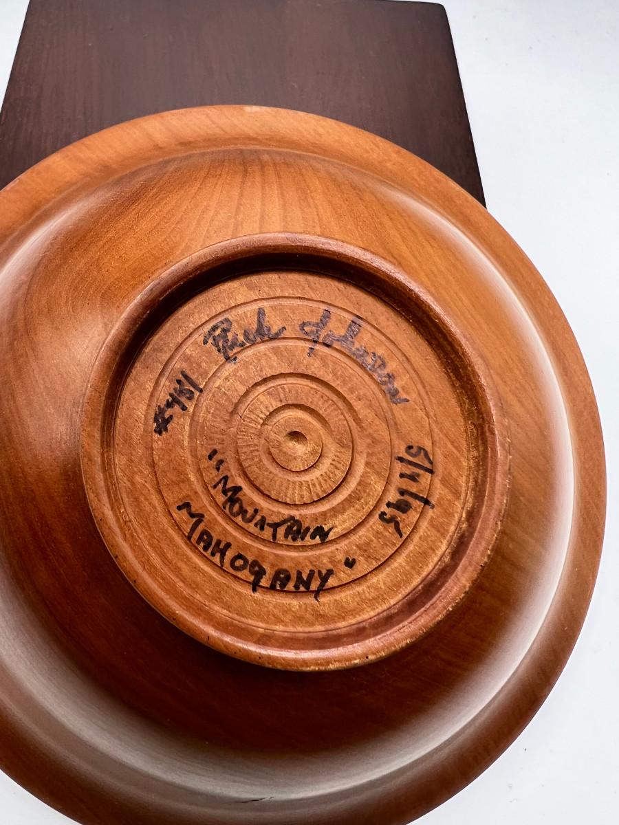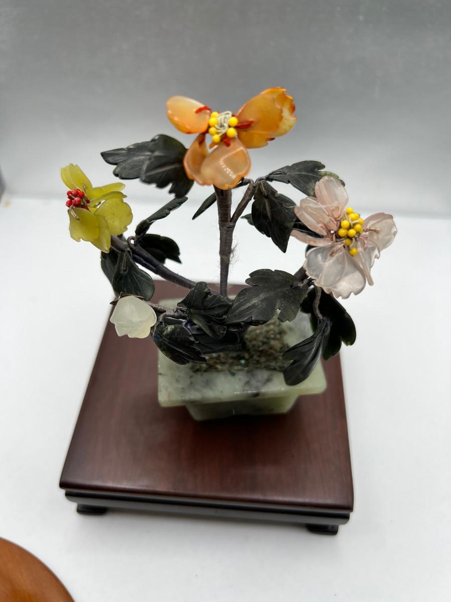 Fine turned 5" Mahogany Bowl, Jade and stone Grapes and Flowers. 4" stand.