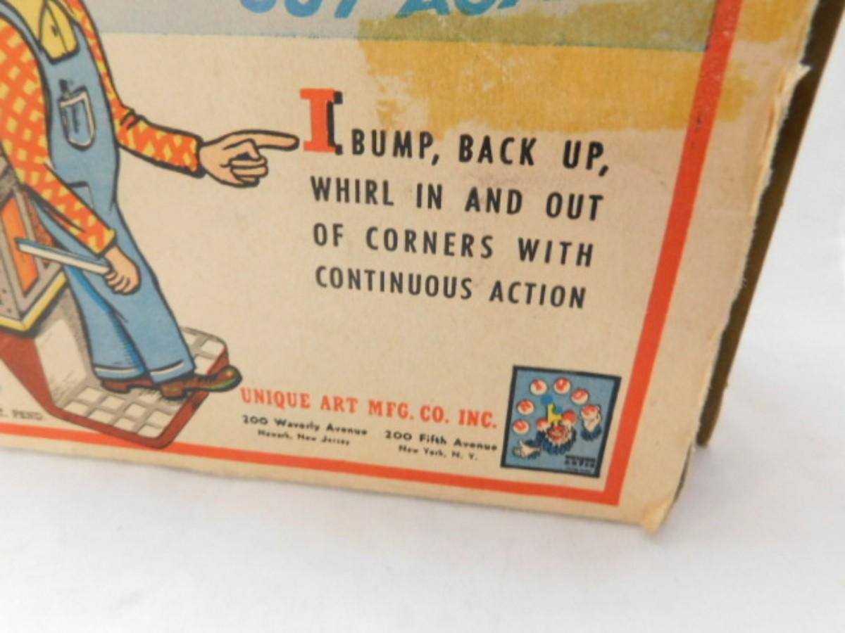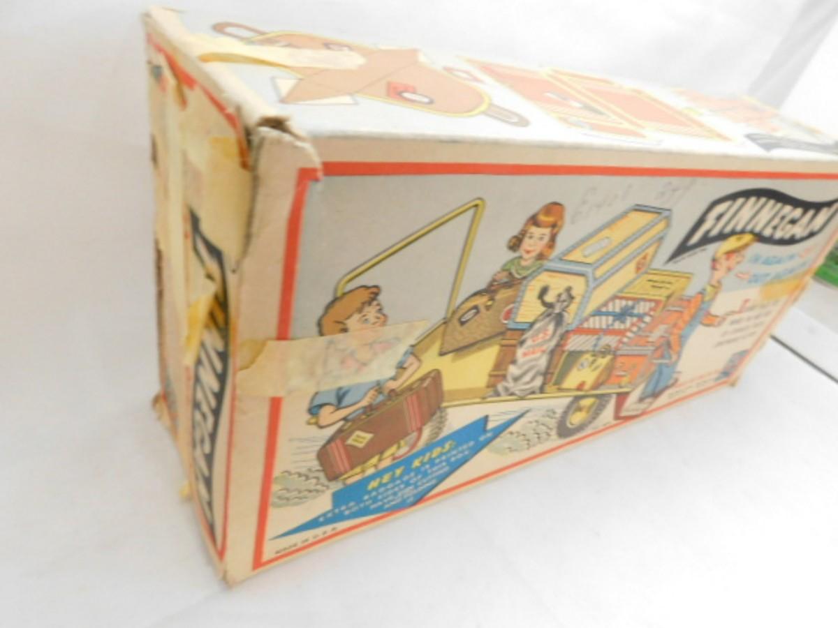 Vintage Unique Art Brand Finnegan Porter Luggage Cart Mechanical Toy with Original Box. Box has repairs as shown. Some paint wear but toy appears to be in working condition.