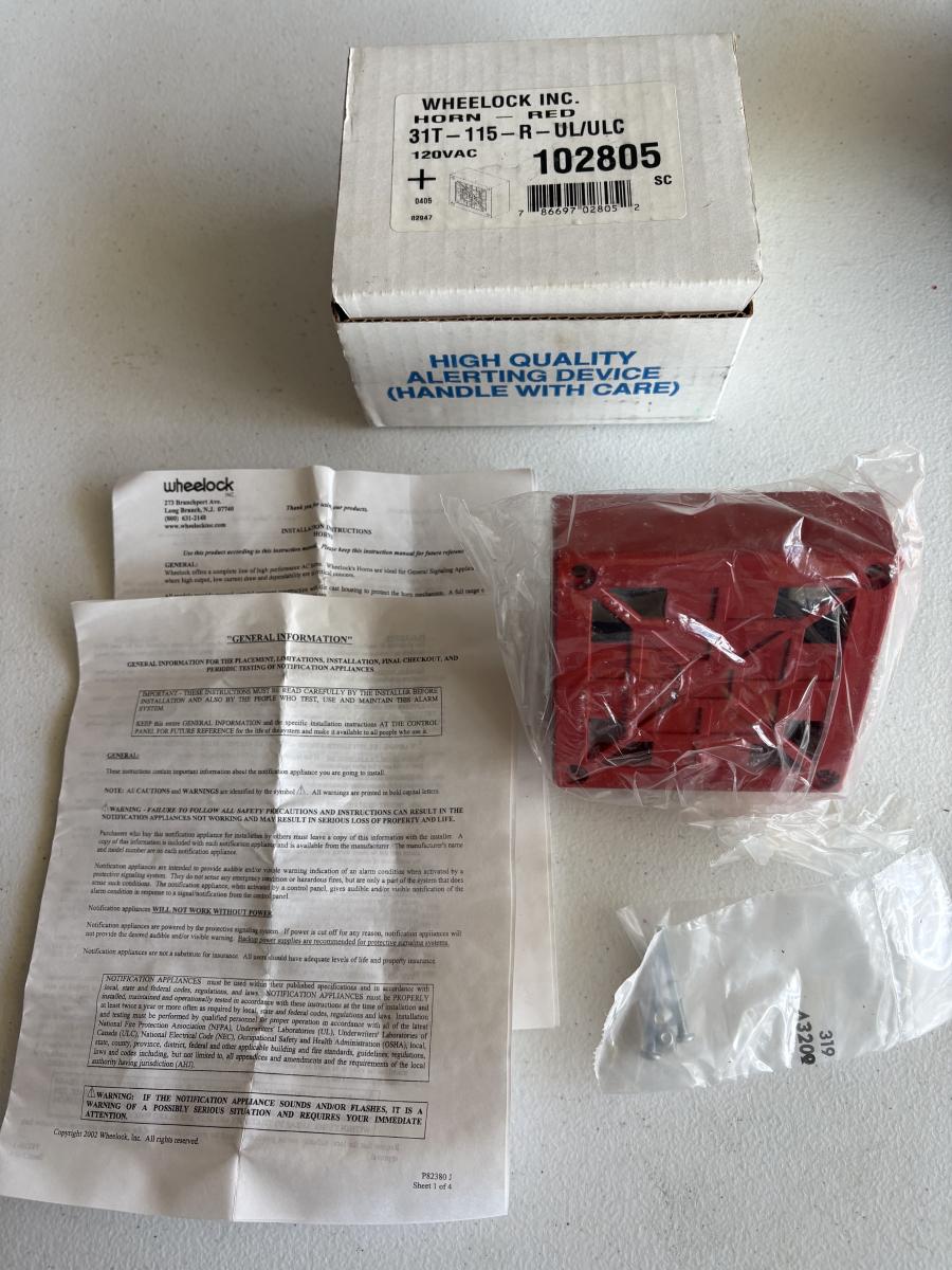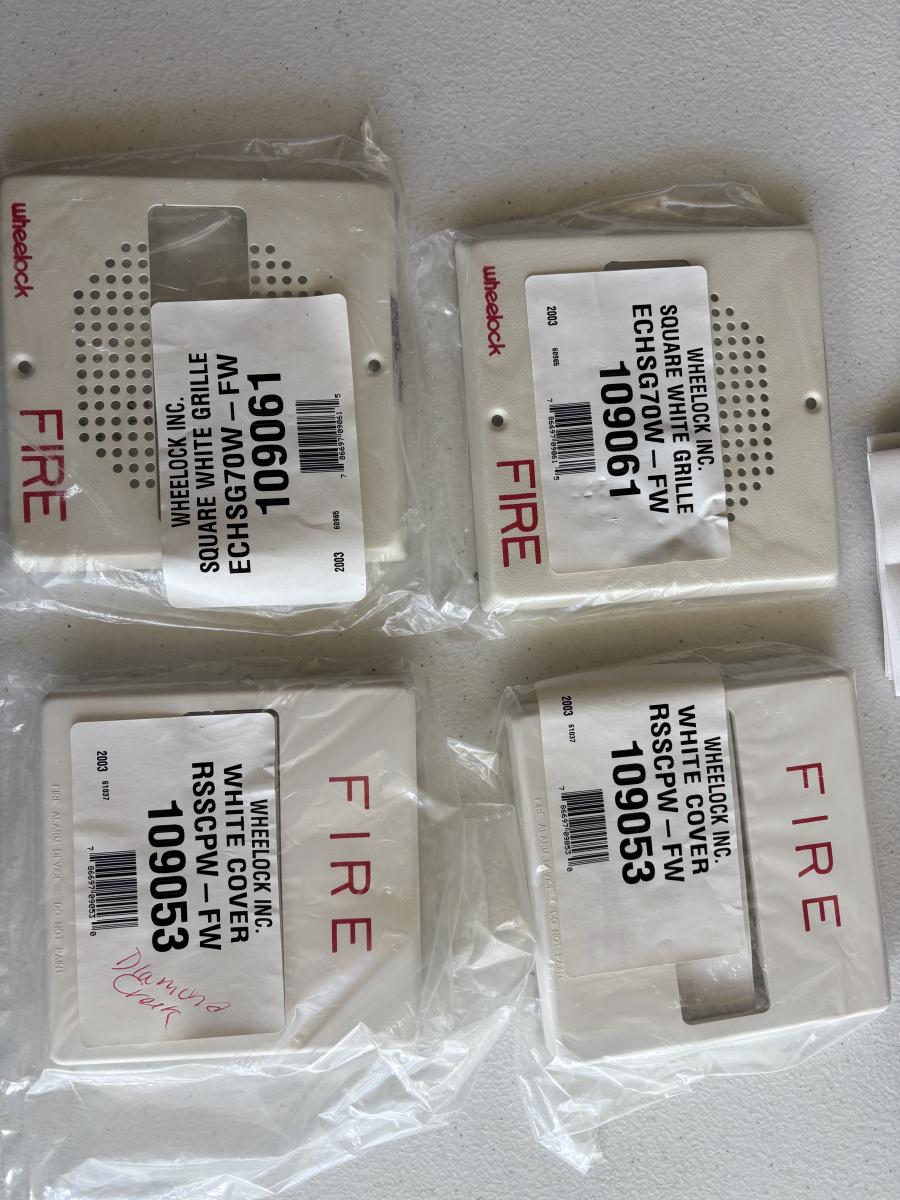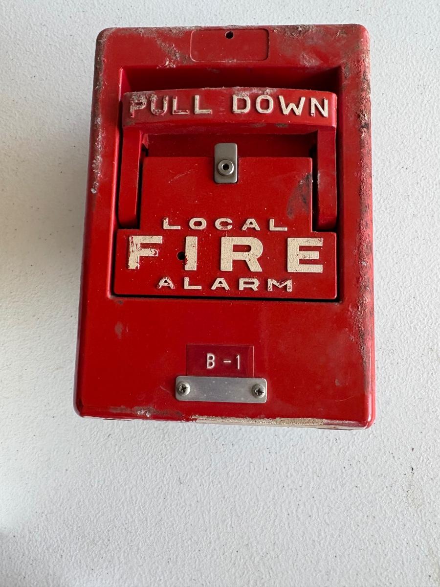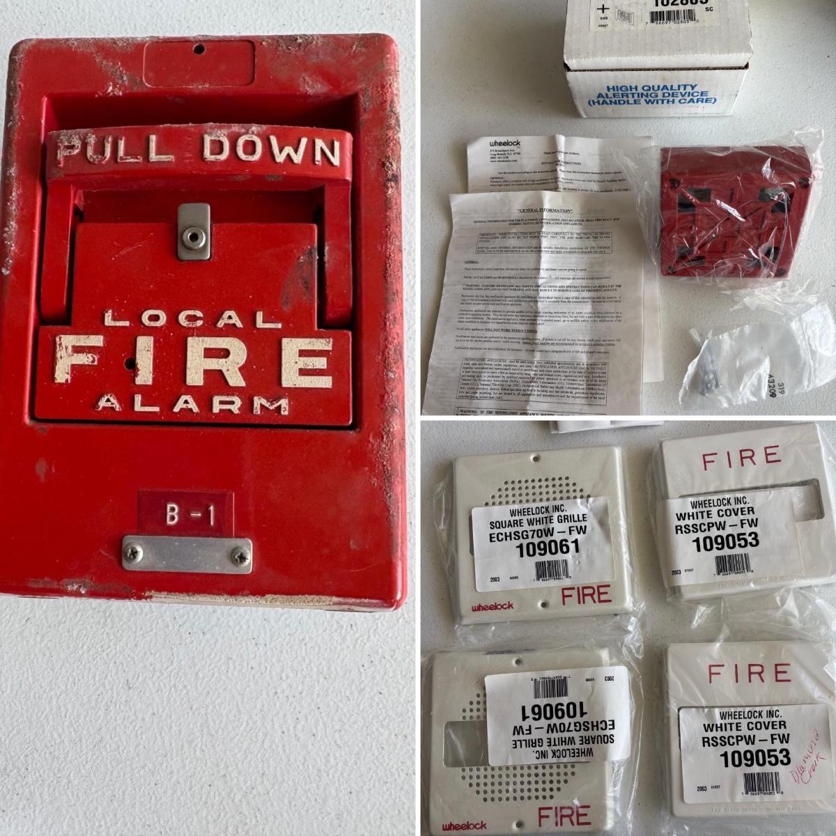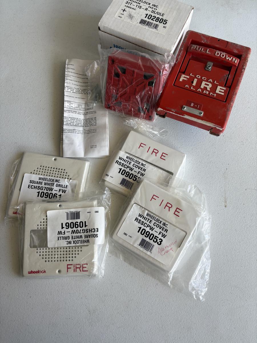 One new fire alarm, four new alarm covers, and a fire engine red Pull-Down alarm taken from the wall of home (not tested). Pull down alarm is 5” x 1”x 7”H.