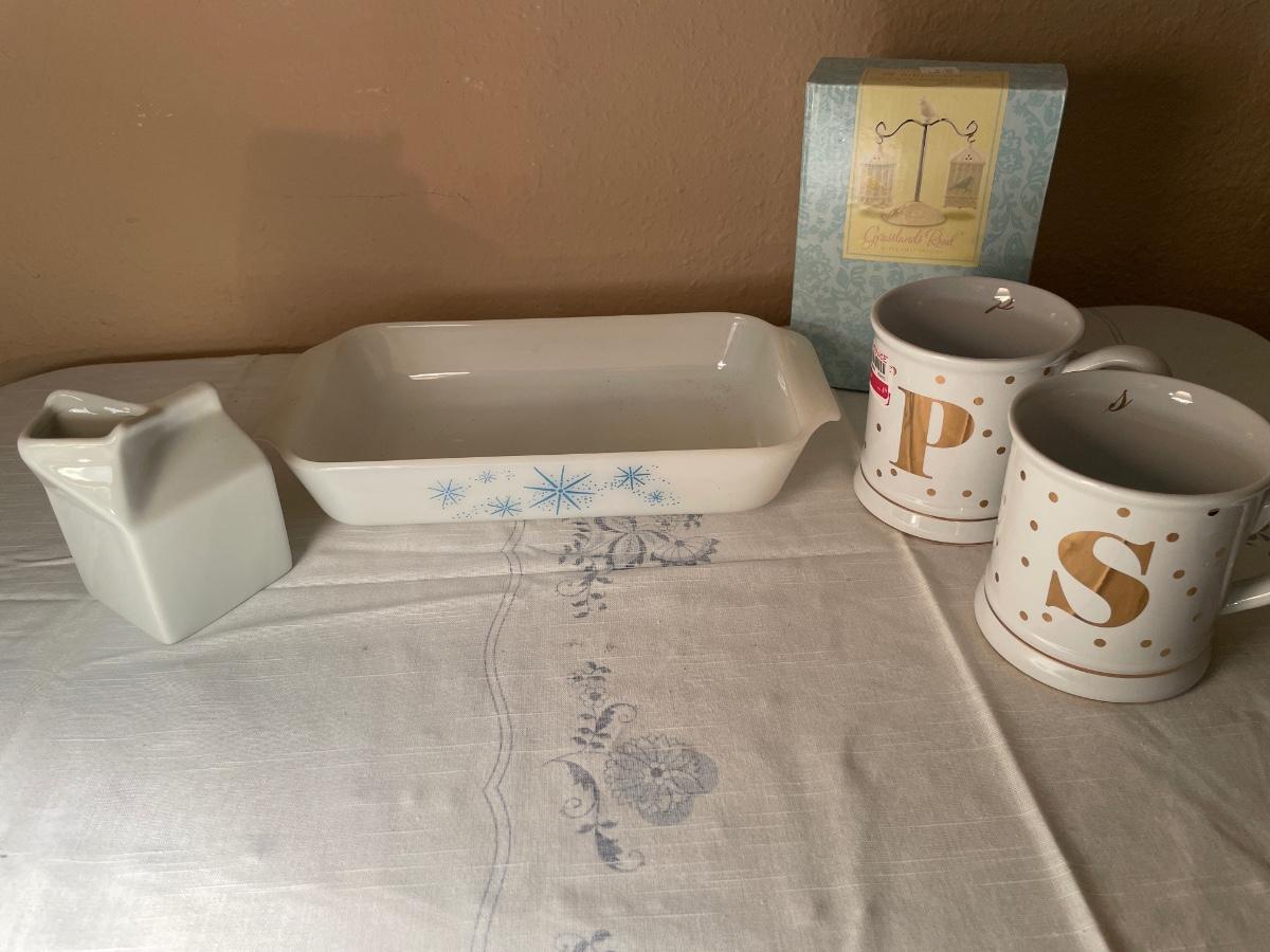 Fire king casserole, mugs, milk carton & S&P