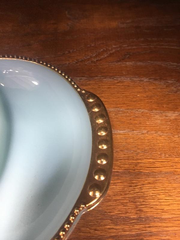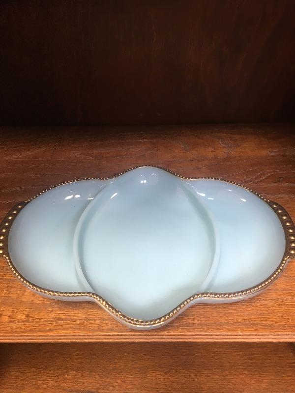 Fire-King oven proof dish. Beautiful blue color with beautiful gold trim.
