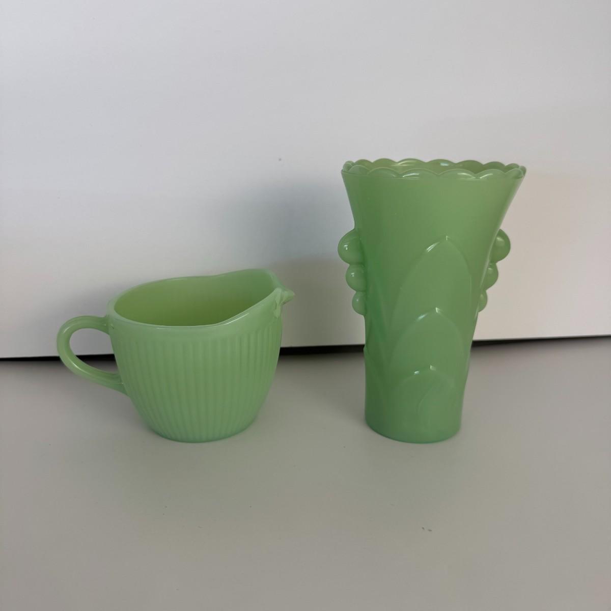 Milk Glass Pitcher, Vase, Cake Stand, and Glass Vase