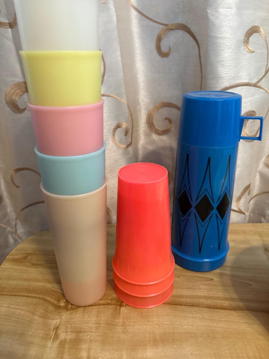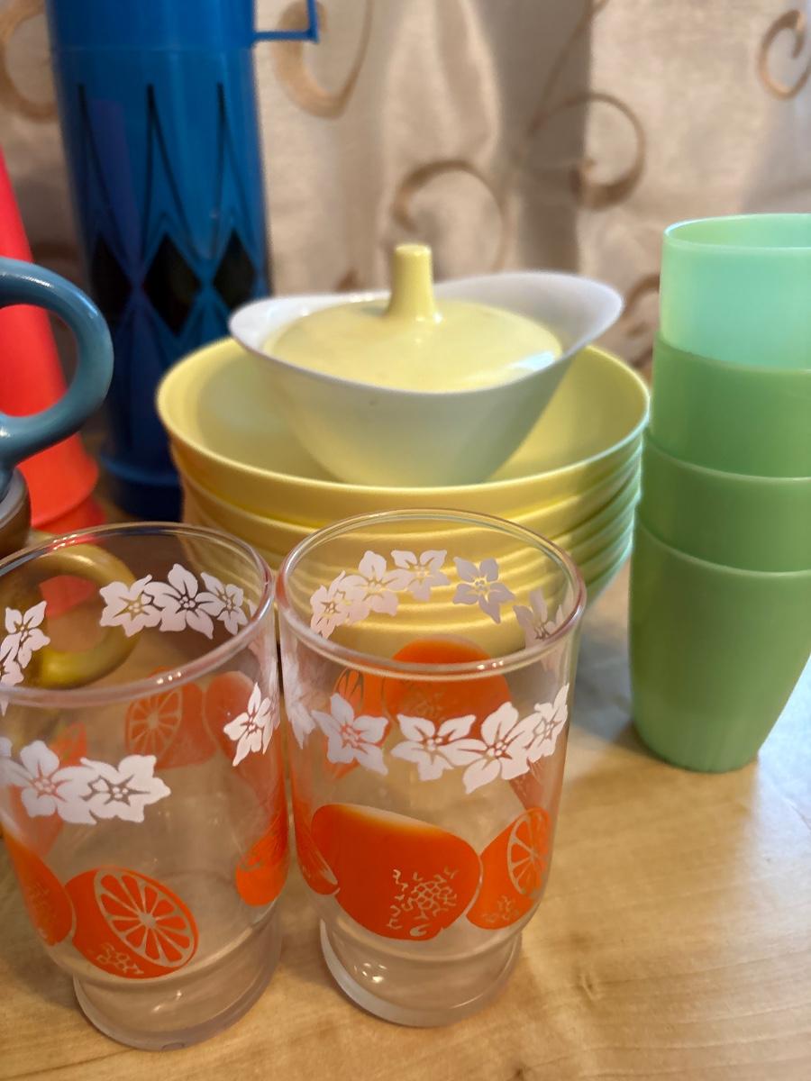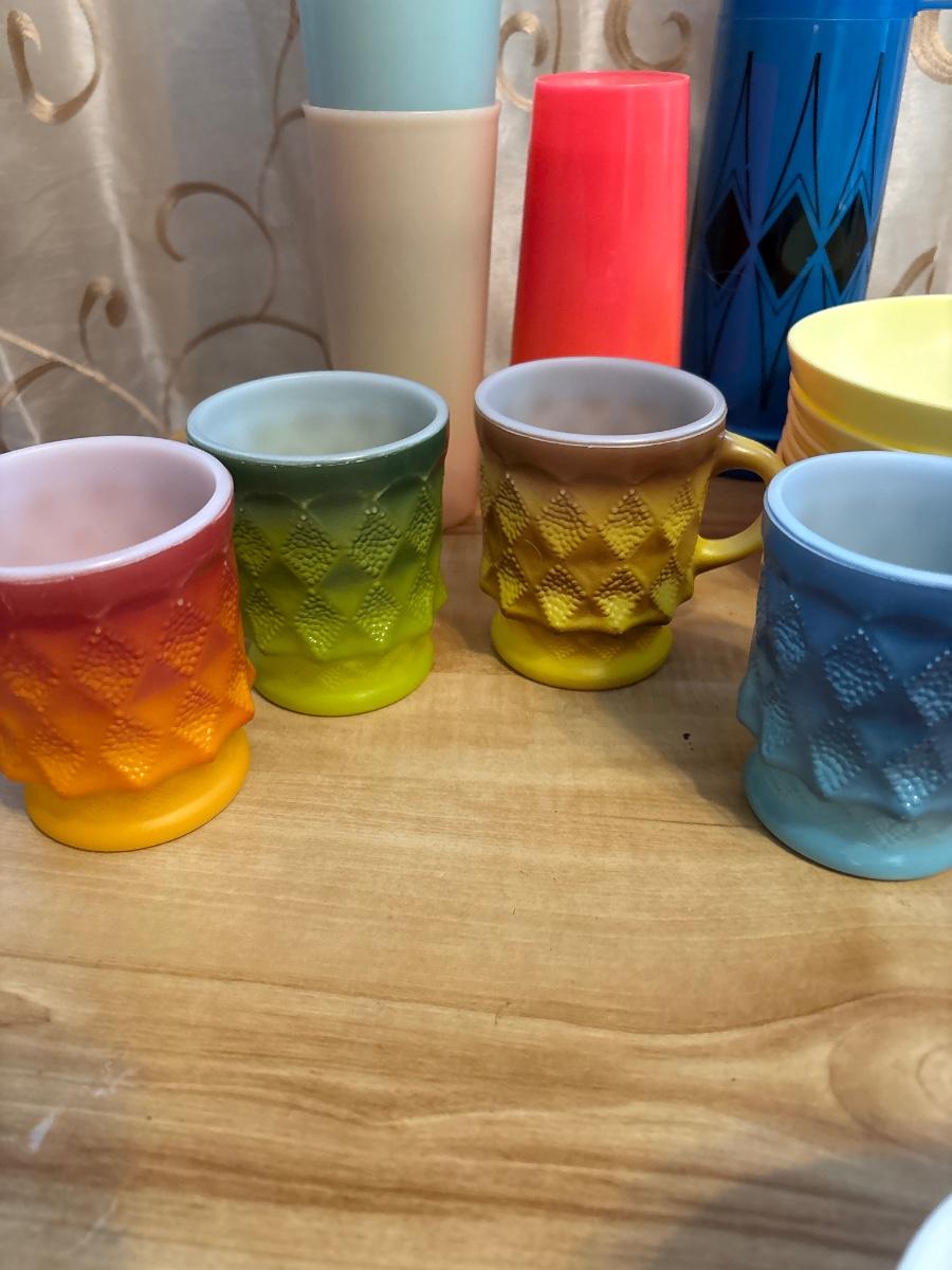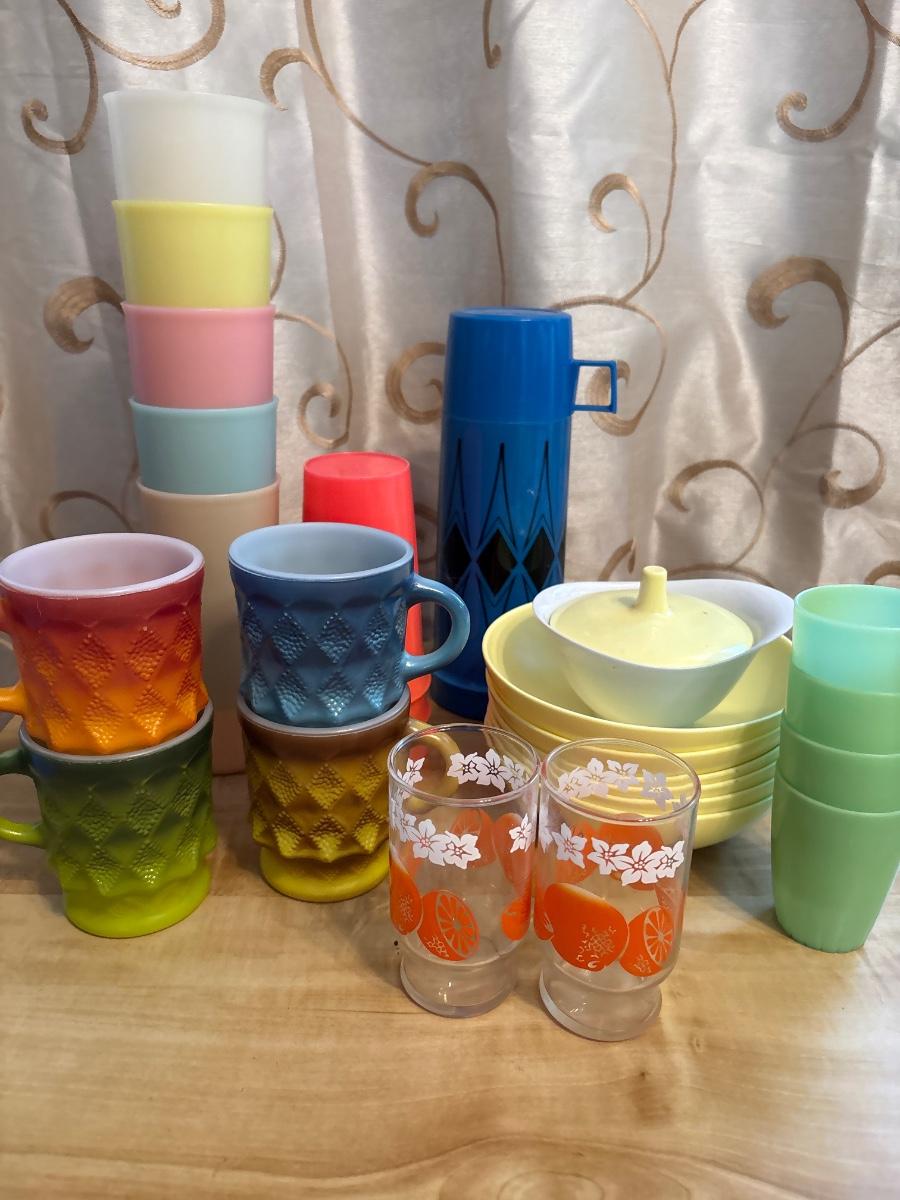 Fire King mugs, Texas Ware bowls, Tupperware glasses