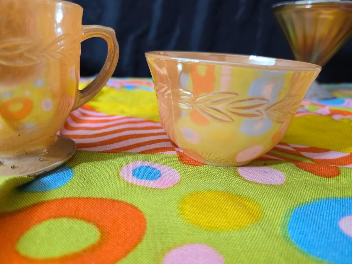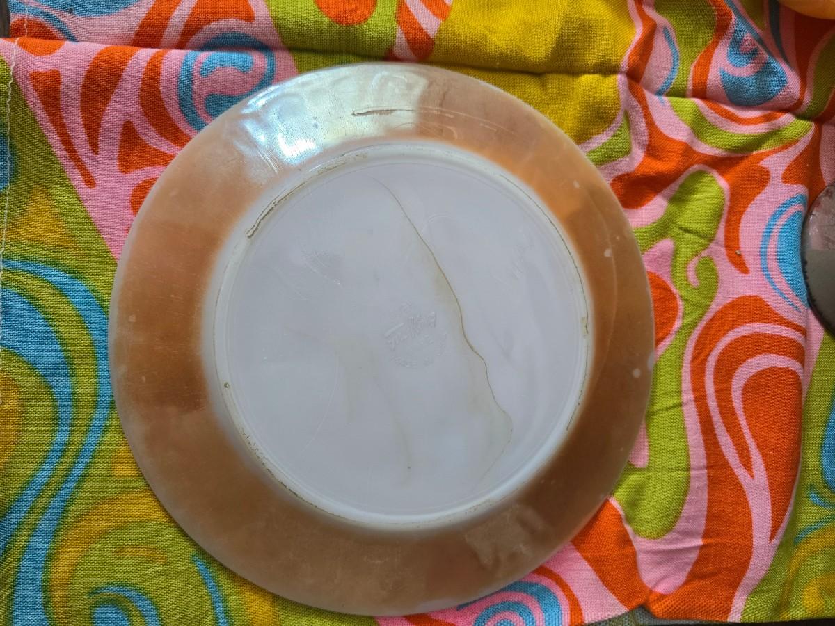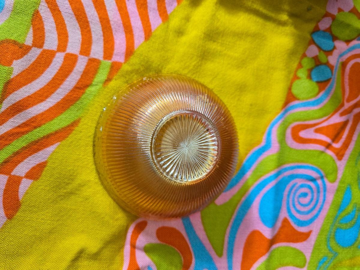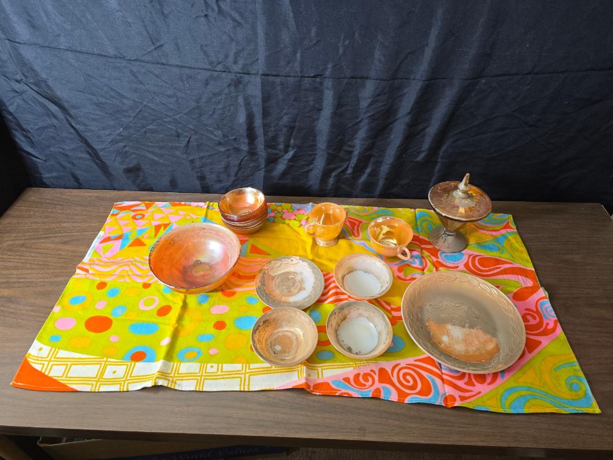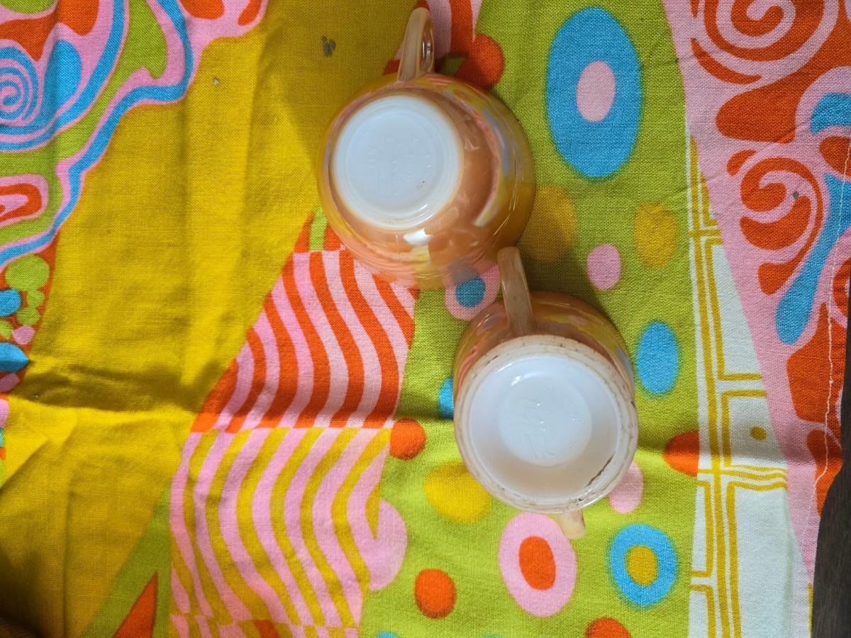 Fire king orange lusterware with a fun & funky vintage tablecloth