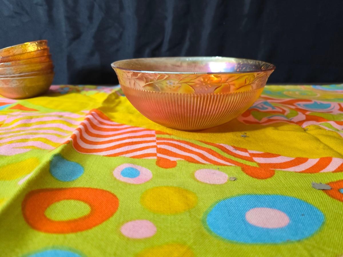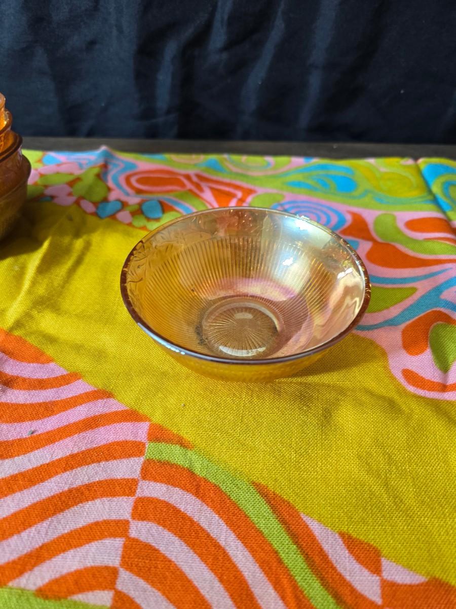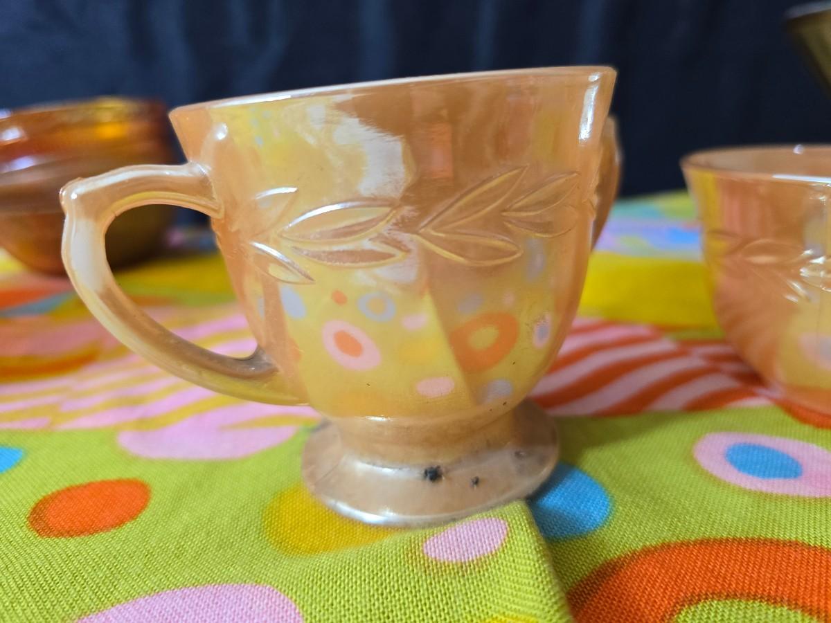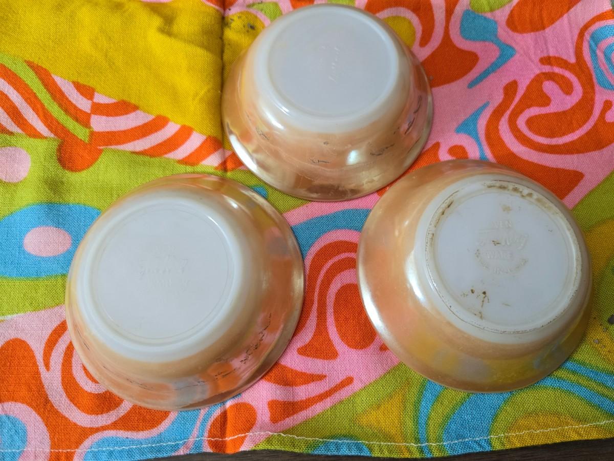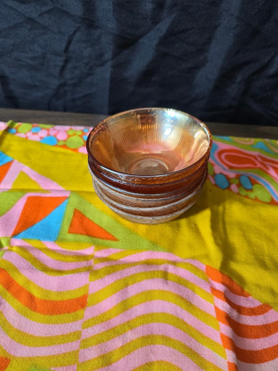 Fire king orange lusterware with a fun & funky vintage tablecloth