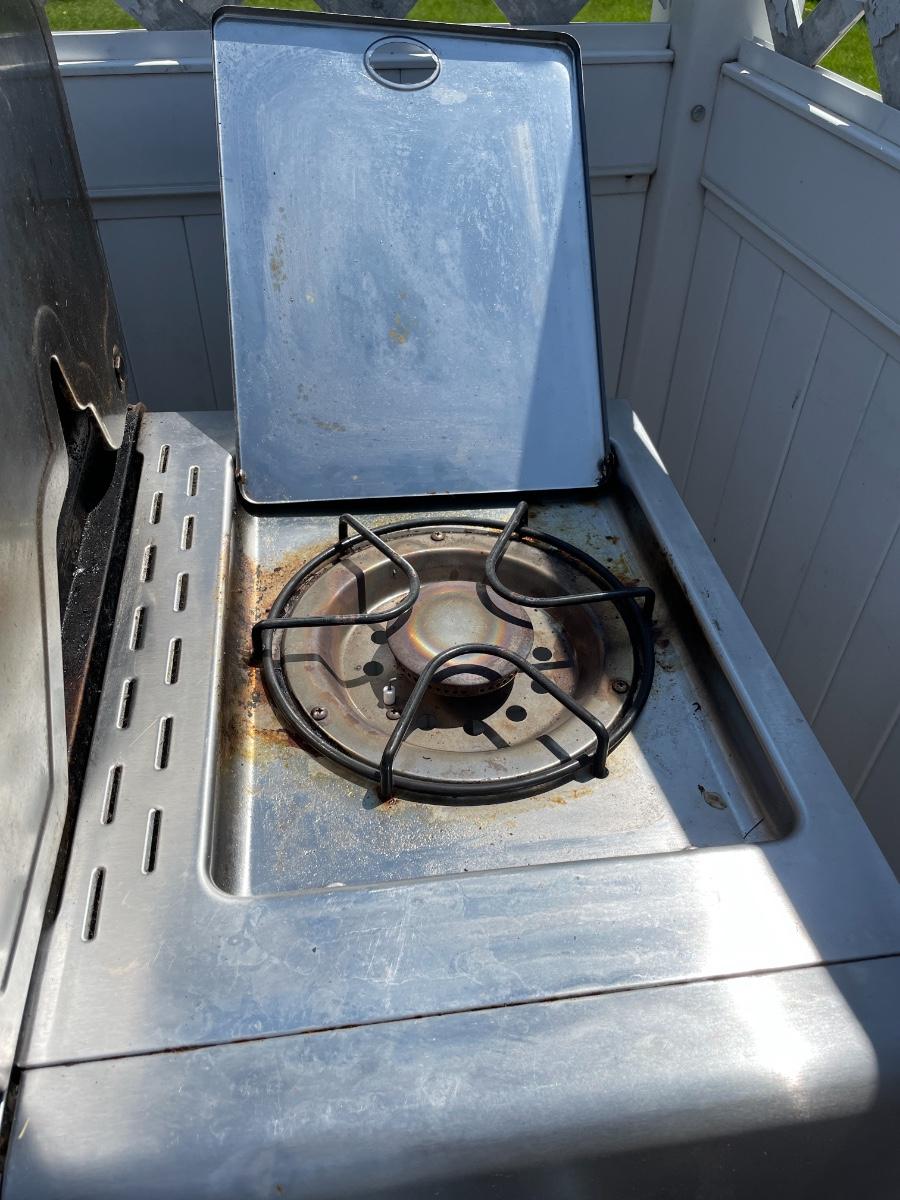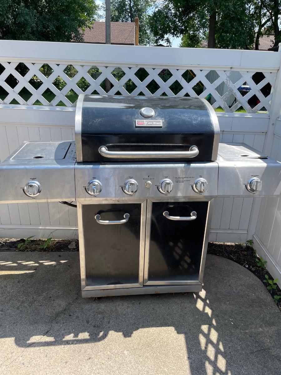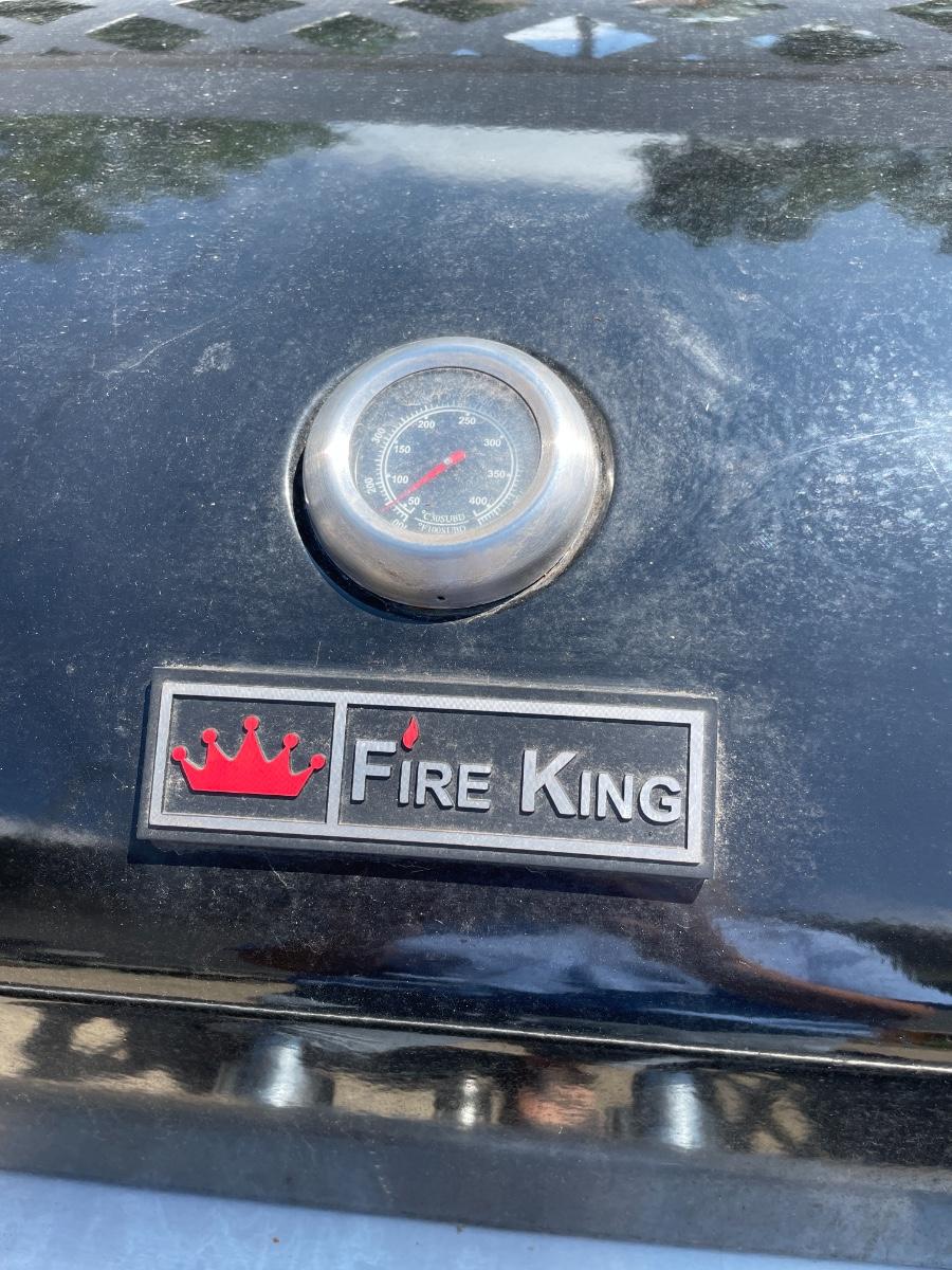 Fire King Propane grill with 2 burners and cover. Has ignition button. Works great!