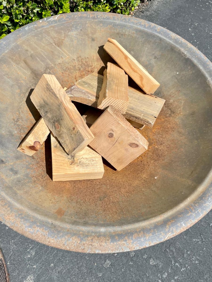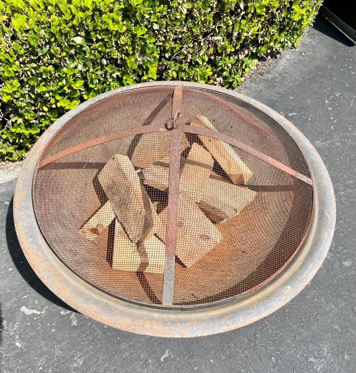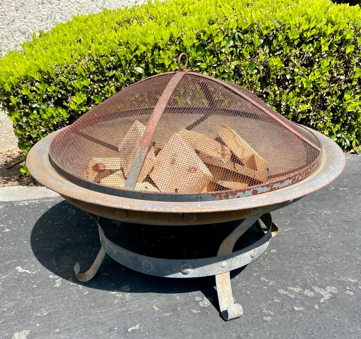 Steel saucer-shaped base with wrought iron legs. Mesh lid for arresting sparks. Good, solid used condition. Approx. 36” across.