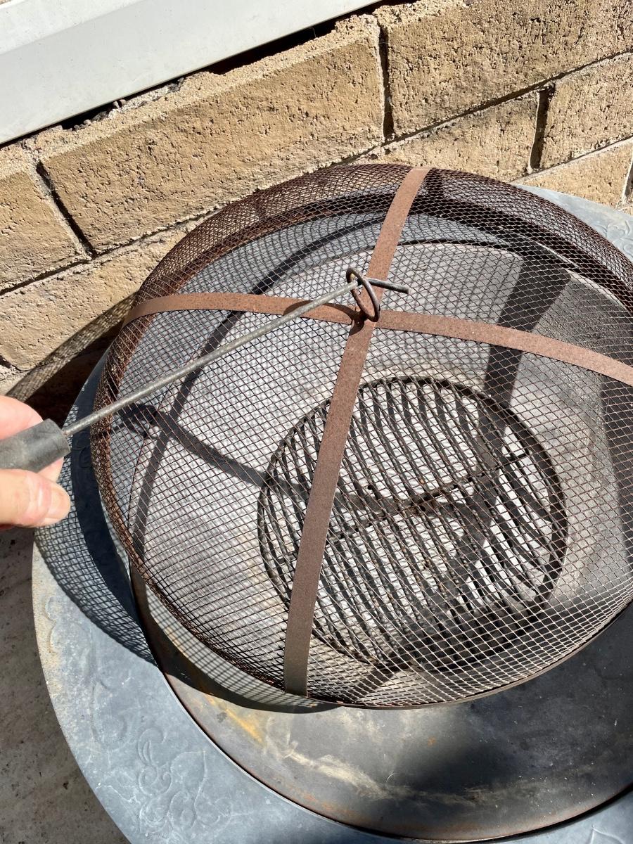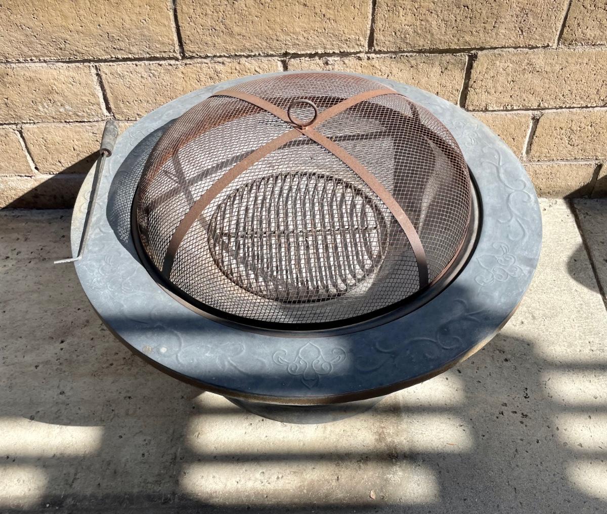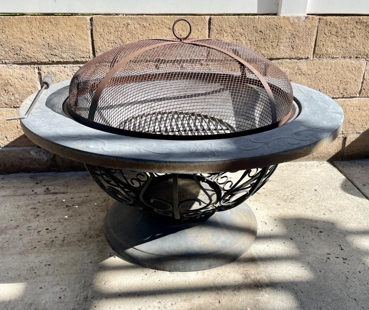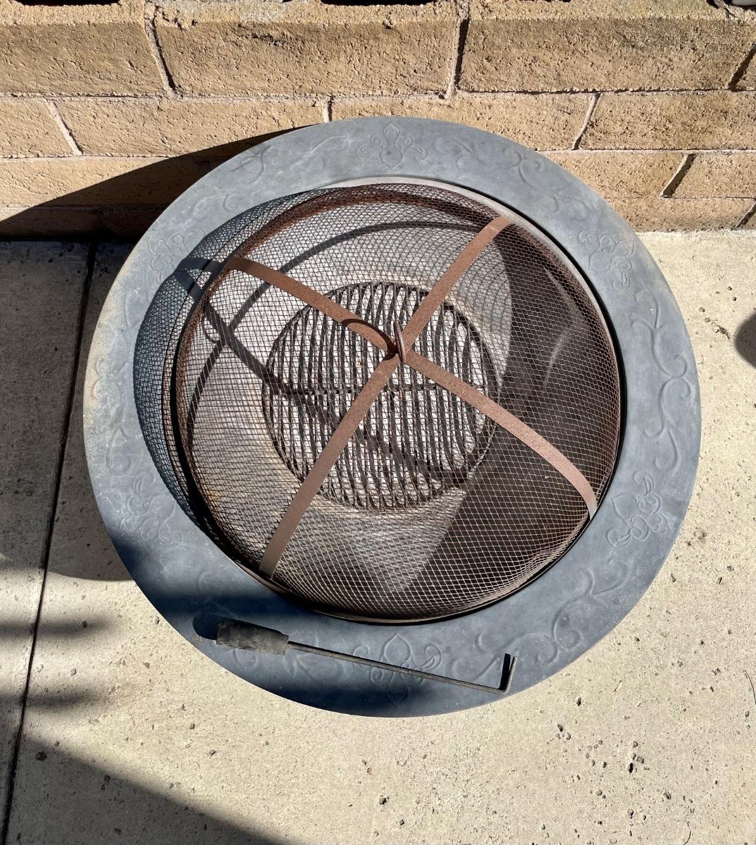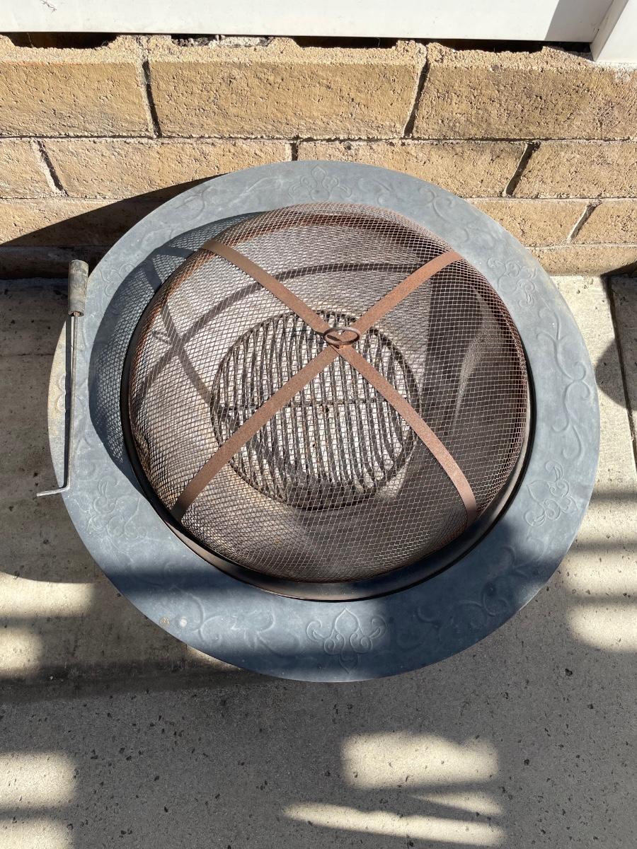 Metal fire pit with ledge, removable dome screen and hand hook for removing dome. Used condition, stored outside.