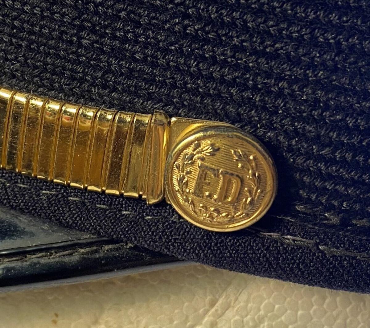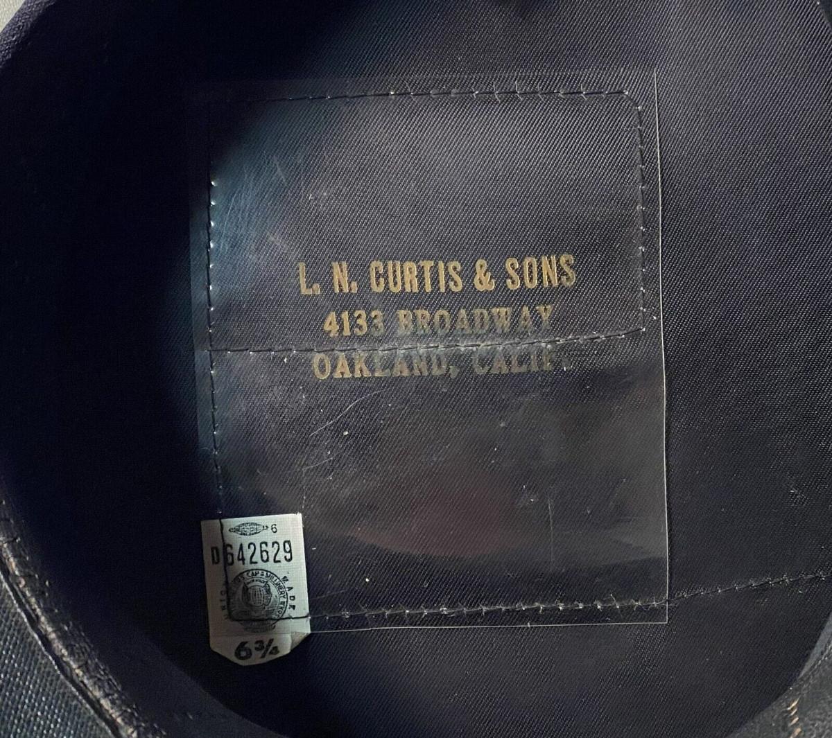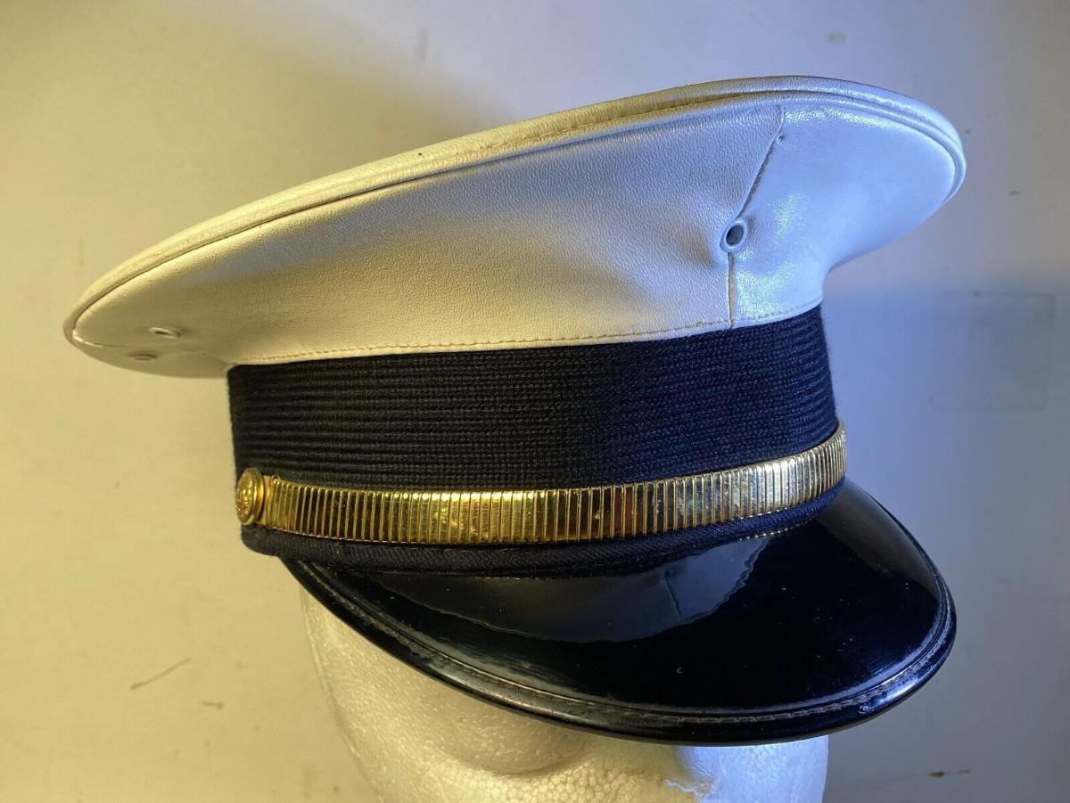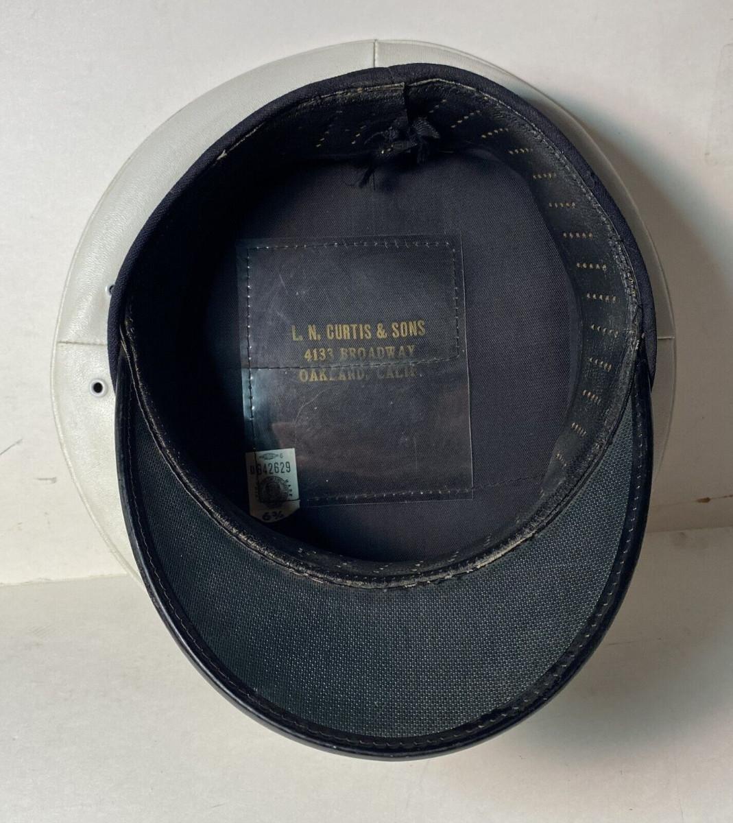 With light normal use here is a vintage Class A Dress Cap for a Fire Chief..Found in Utah, but no badge to identify department...White leather..Size 6 3/4...From the L.N. Curtis & Sons Company of Oakland, Calif...The union label dates it pre-1983...Light wear on the gold expansion band with FD side buttons...Easily replaced.