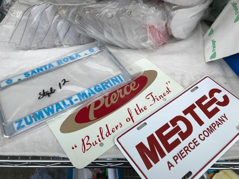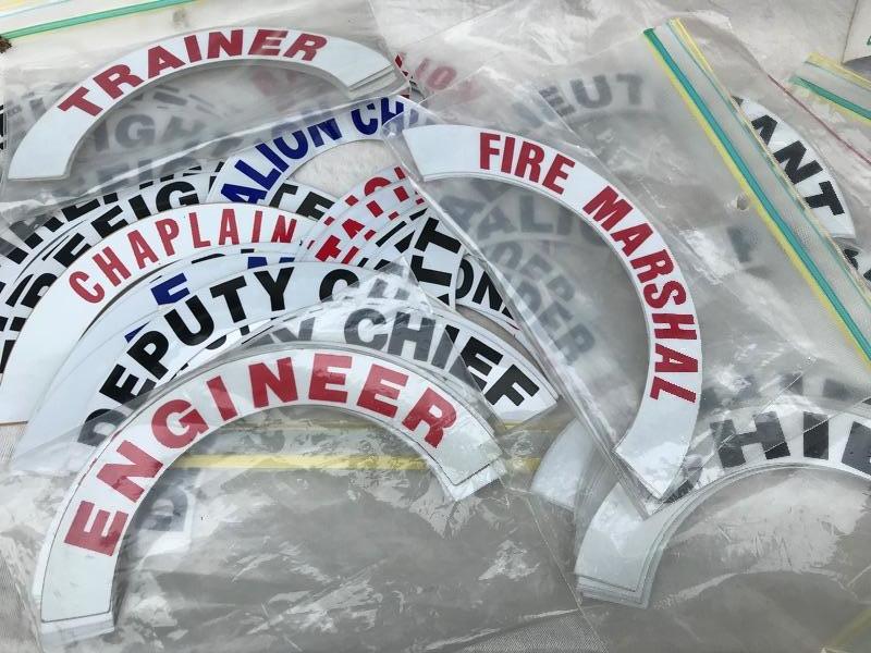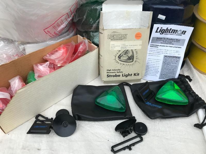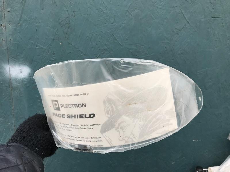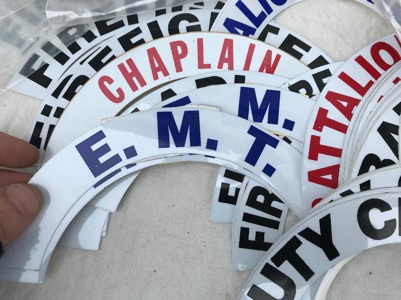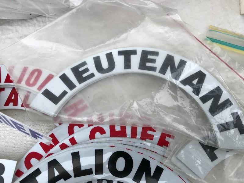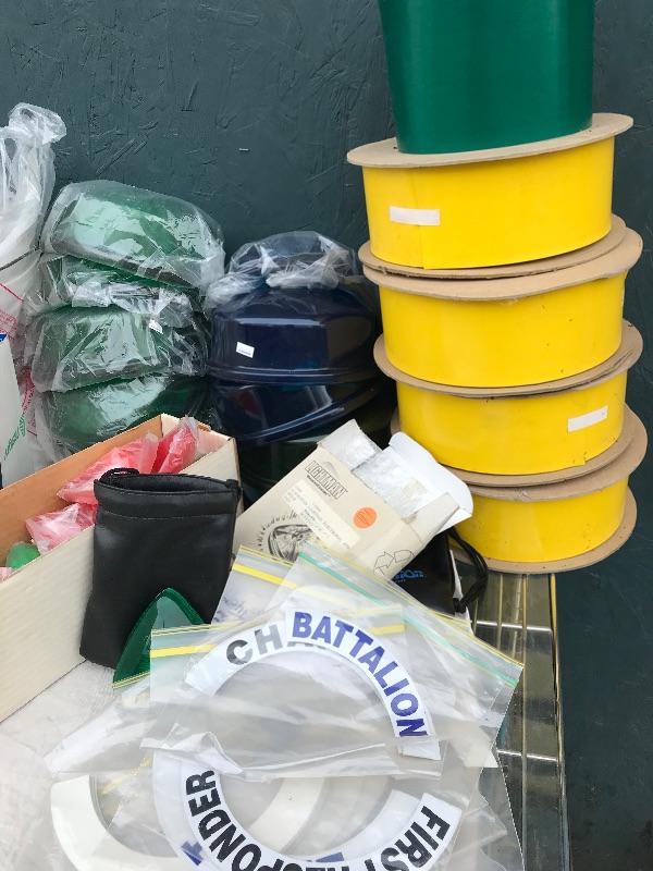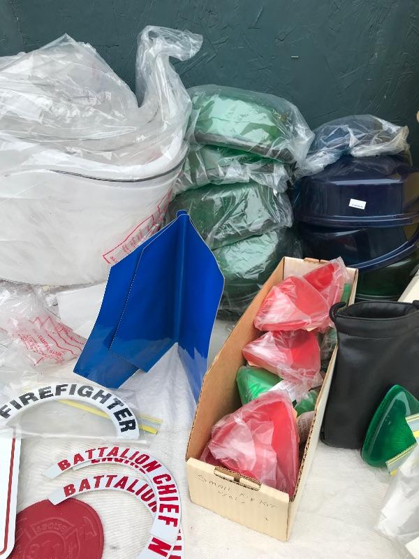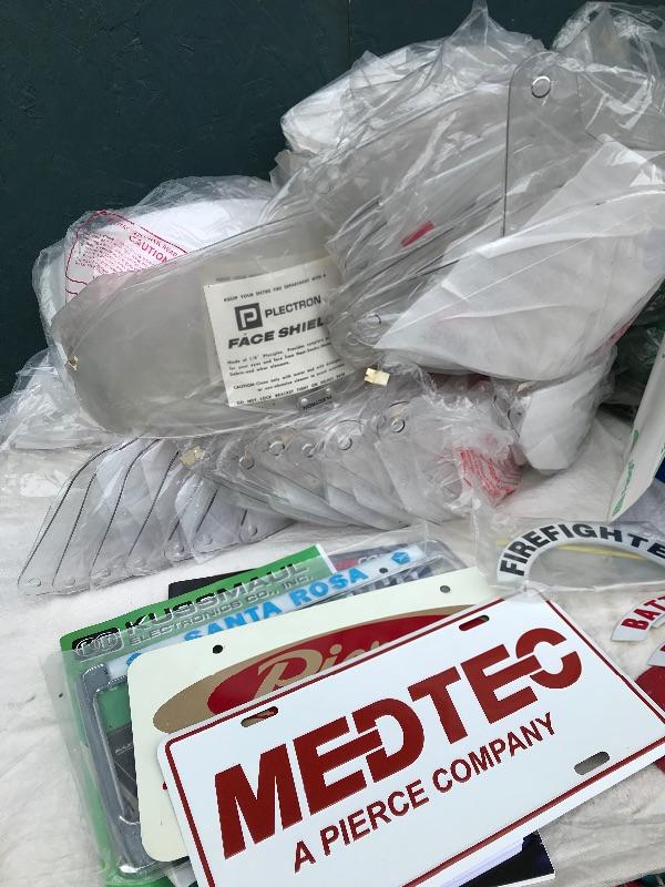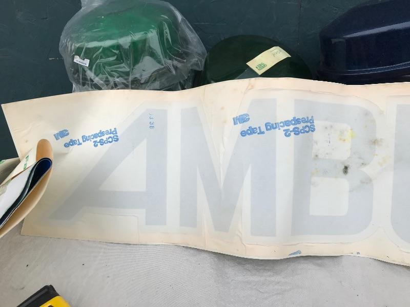 Included are 36 clear plastic face shields with a few different styles. There are 4 round blue light caps and 7 green light caps. There are a large amount of half circle stickers with various titles on them. There are two large "Ambulance" vehicle decals. There are small, battery powered triangle lights with multiple red and green caps. Also included are 3 rounds of green reflective tape.
