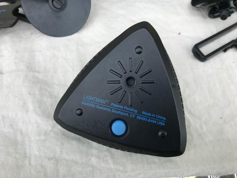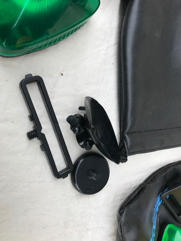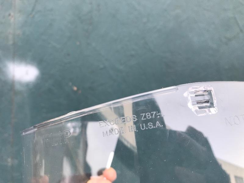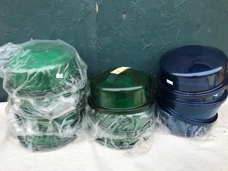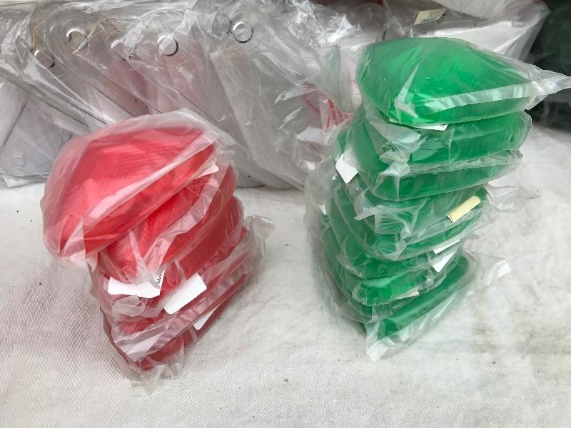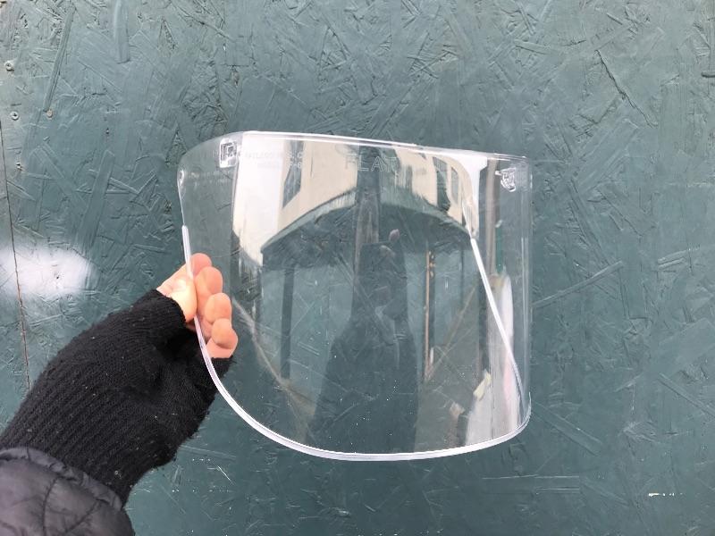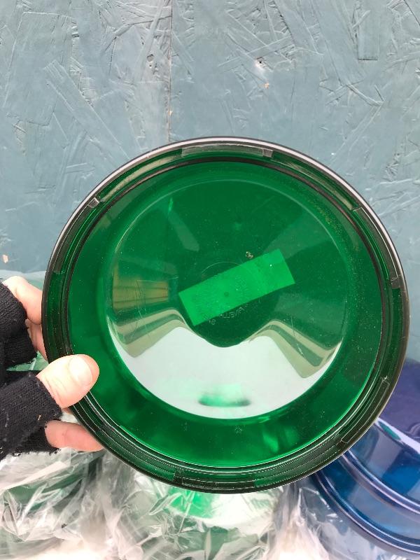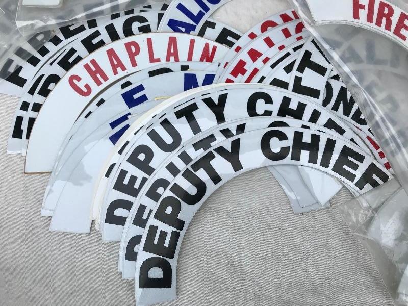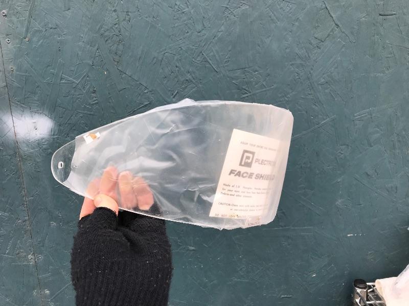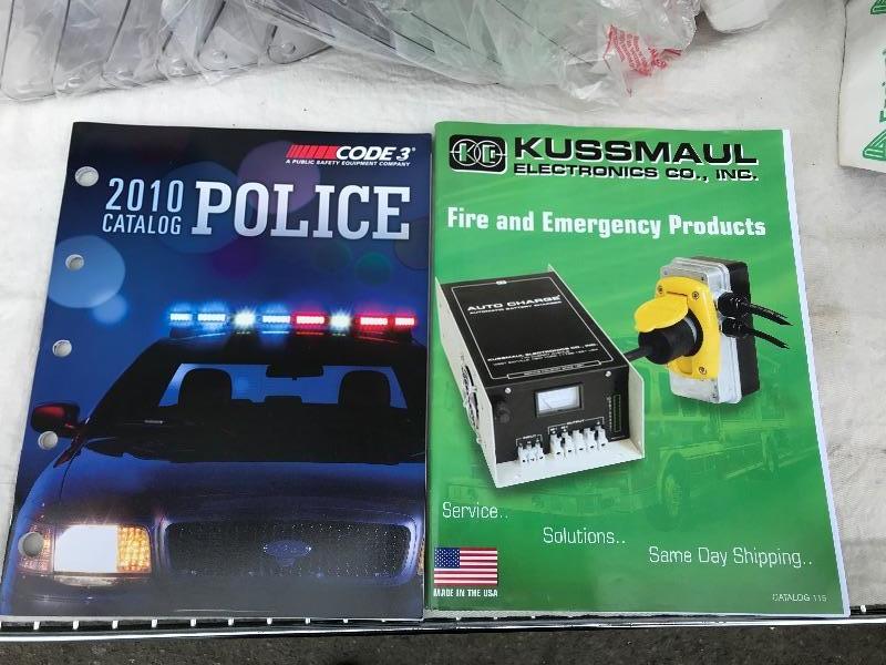 Included are 36 clear plastic face shields with a few different styles. There are 4 round blue light caps and 7 green light caps. There are a large amount of half circle stickers with various titles on them. There are two large "Ambulance" vehicle decals. There are small, battery powered triangle lights with multiple red and green caps. Also included are 3 rounds of green reflective tape.