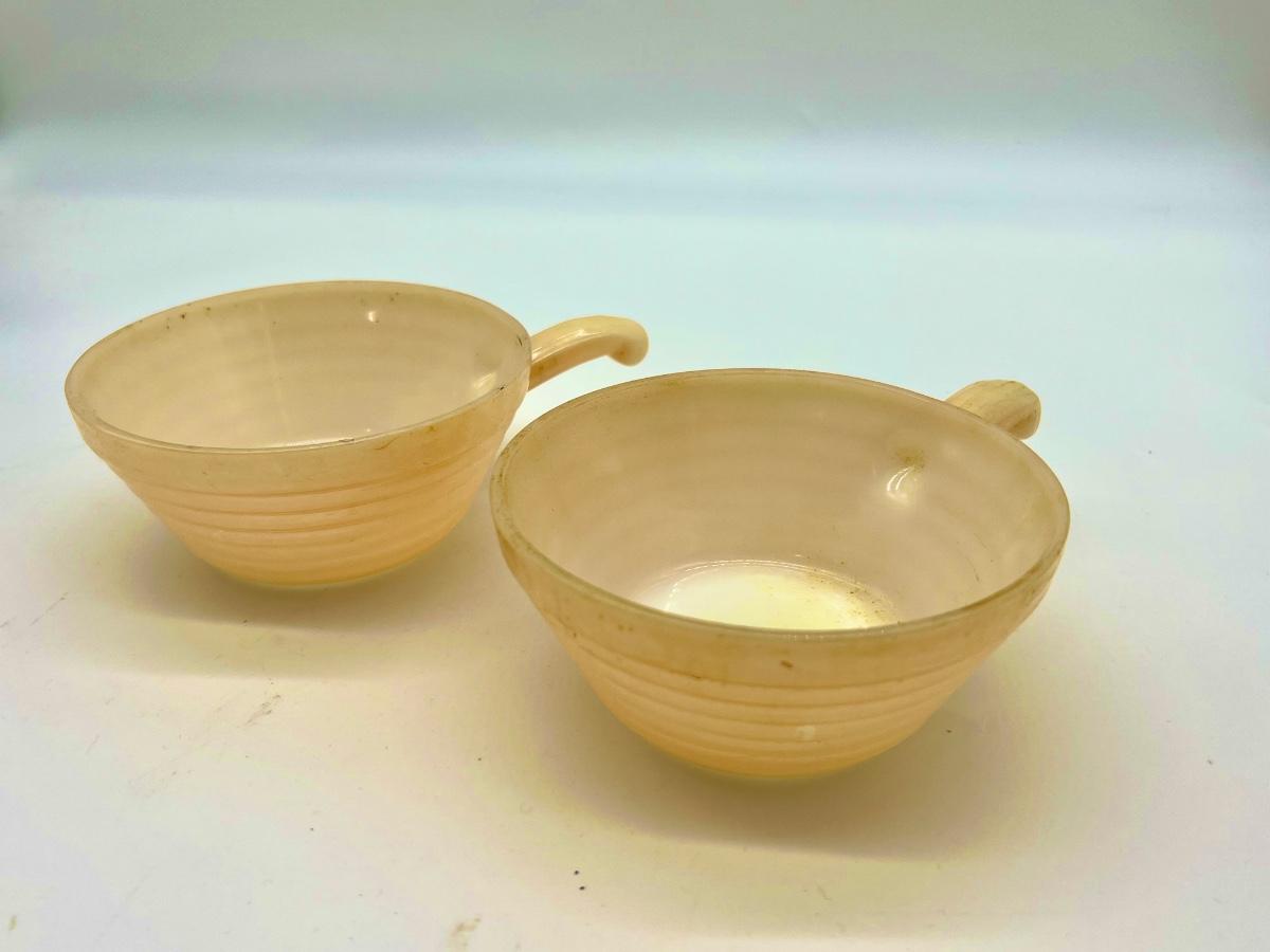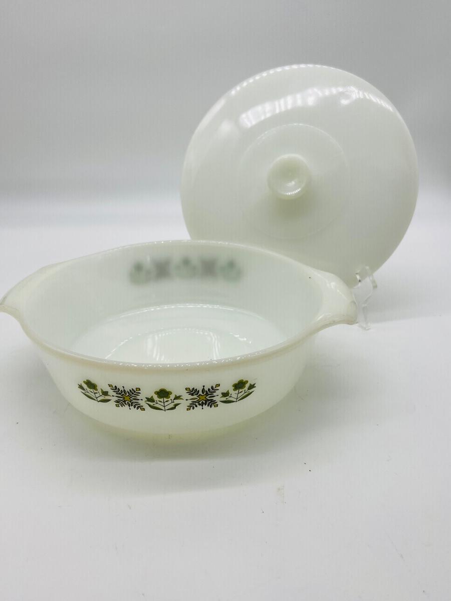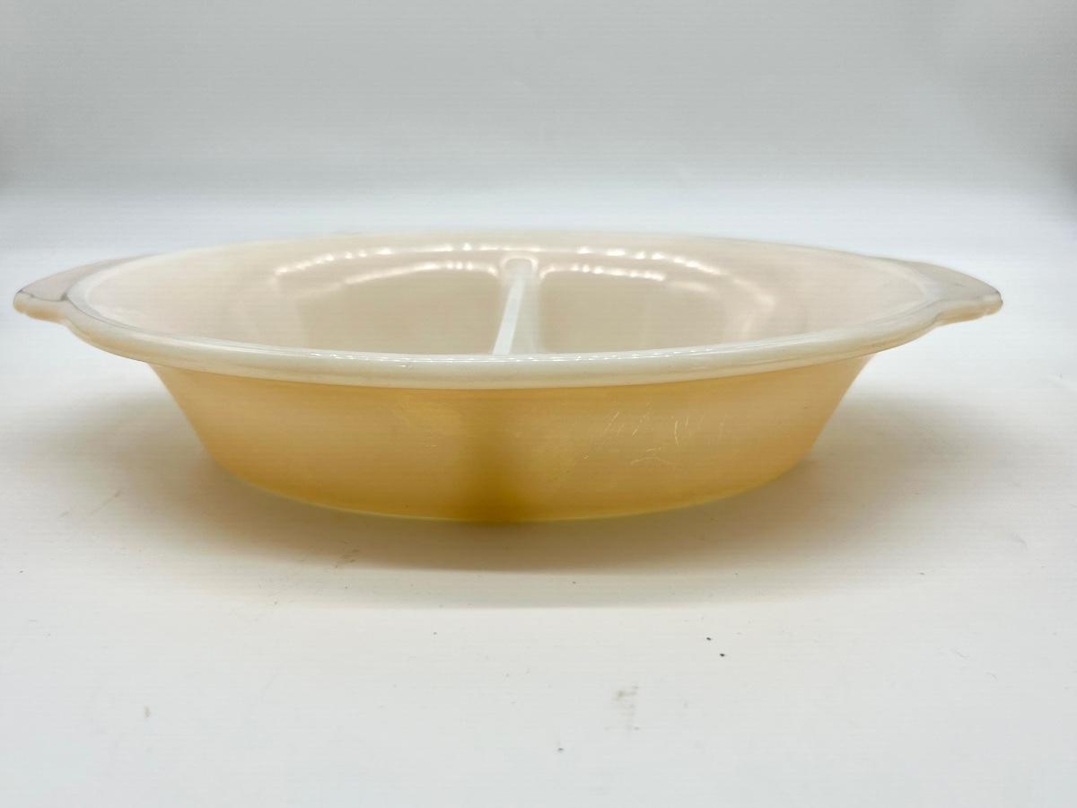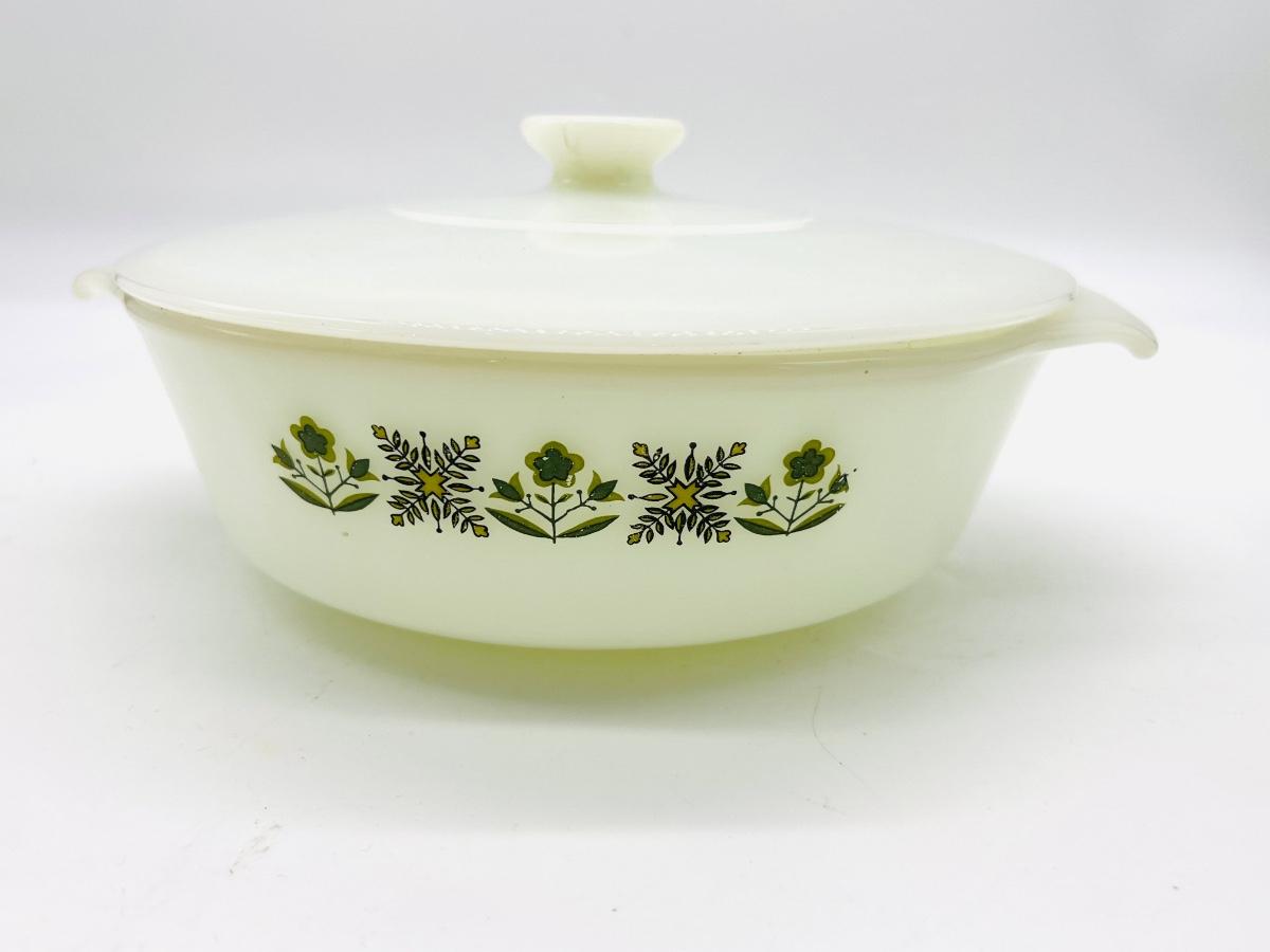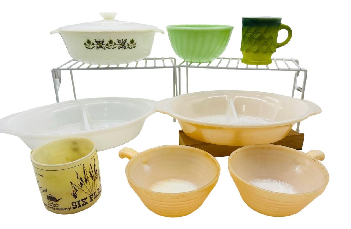 Vintage FireKing and more Includes Anchor Hocking Fire King Jadeite Glass Swirl Mixing Bowl #20, Anchor Hocking Fire King Green Meadow Casserole Baking Dish w/Lid #437 1.5 qt., VINTAGE FIRE KING #468 DIVIDED CASSEROLE DISH, PEACH LUSTER, REVERSE LOGO and 2 Vintage Fire King Oven Ware Peach Luster Beehive Handled Soup Bowls Glass USA, Vintage Fire King Green Kimberly Mug, Vintage Federal Six Flags mug, and Vintage Glassbake Milk Glass Divided Oval Casserole
