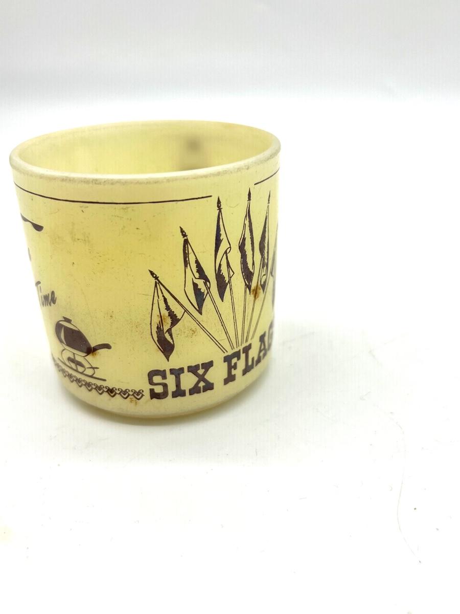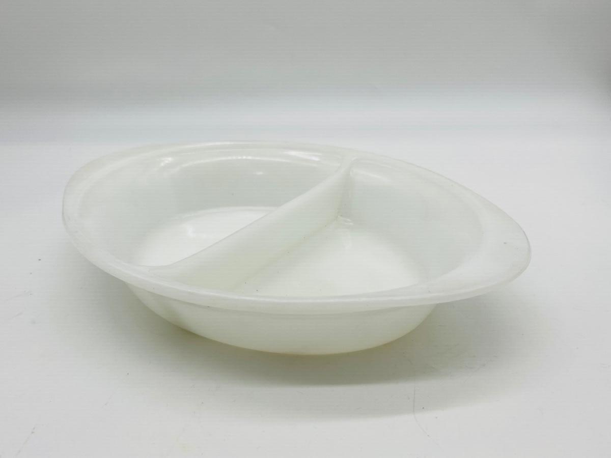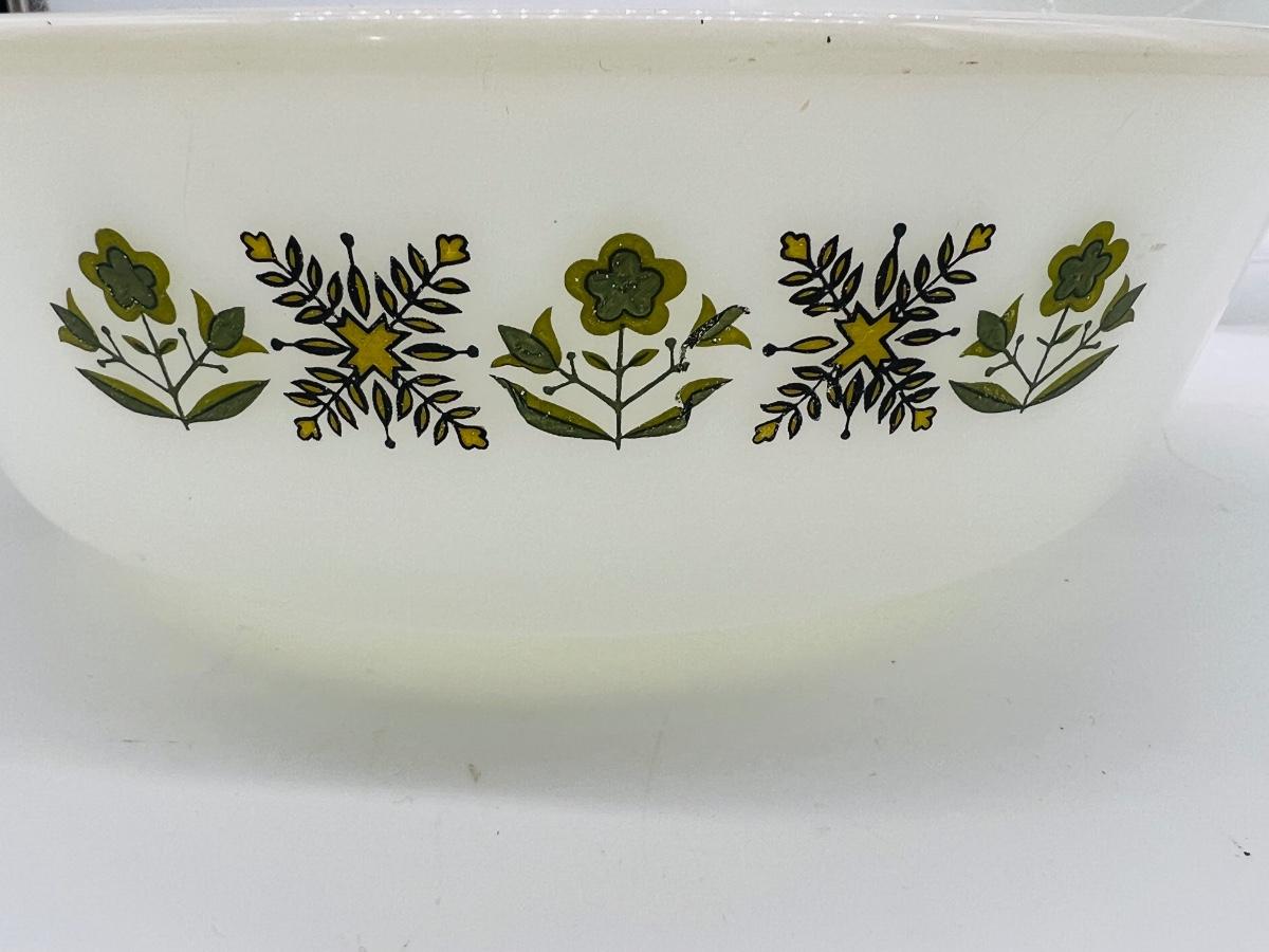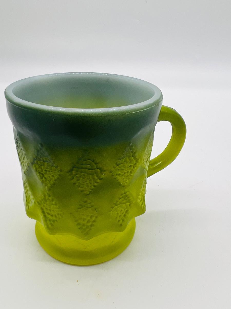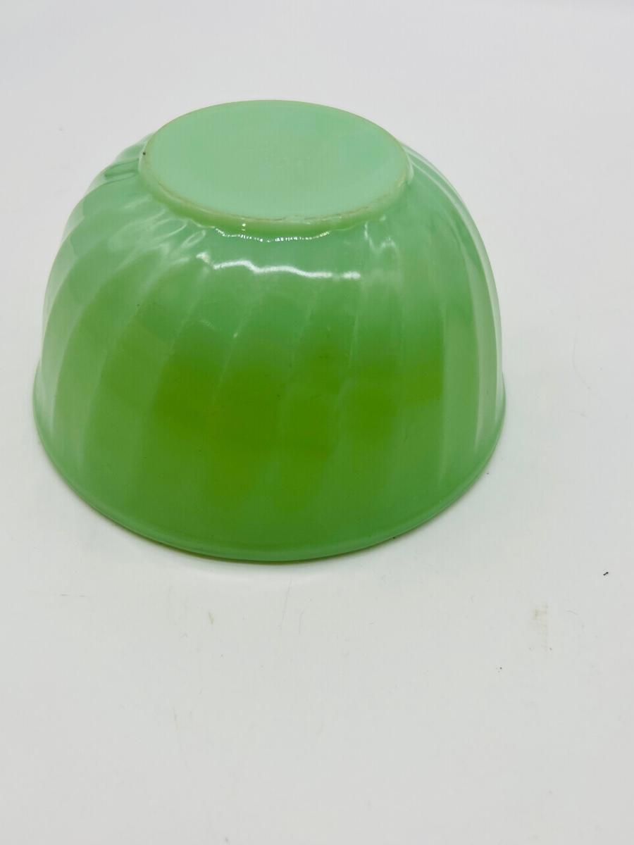 Vintage FireKing and more Includes Anchor Hocking Fire King Jadeite Glass Swirl Mixing Bowl #20, Anchor Hocking Fire King Green Meadow Casserole Baking Dish w/Lid #437 1.5 qt., VINTAGE FIRE KING #468 DIVIDED CASSEROLE DISH, PEACH LUSTER, REVERSE LOGO and 2 Vintage Fire King Oven Ware Peach Luster Beehive Handled Soup Bowls Glass USA, Vintage Fire King Green Kimberly Mug, Vintage Federal Six Flags mug, and Vintage Glassbake Milk Glass Divided Oval Casserole