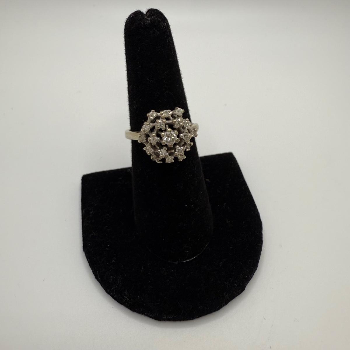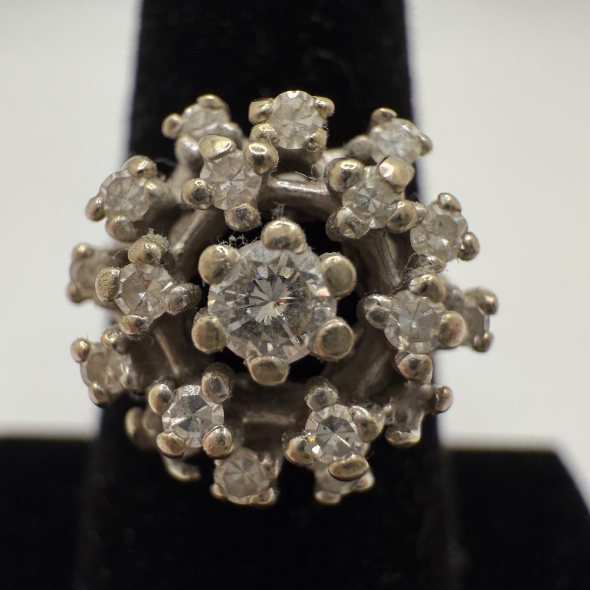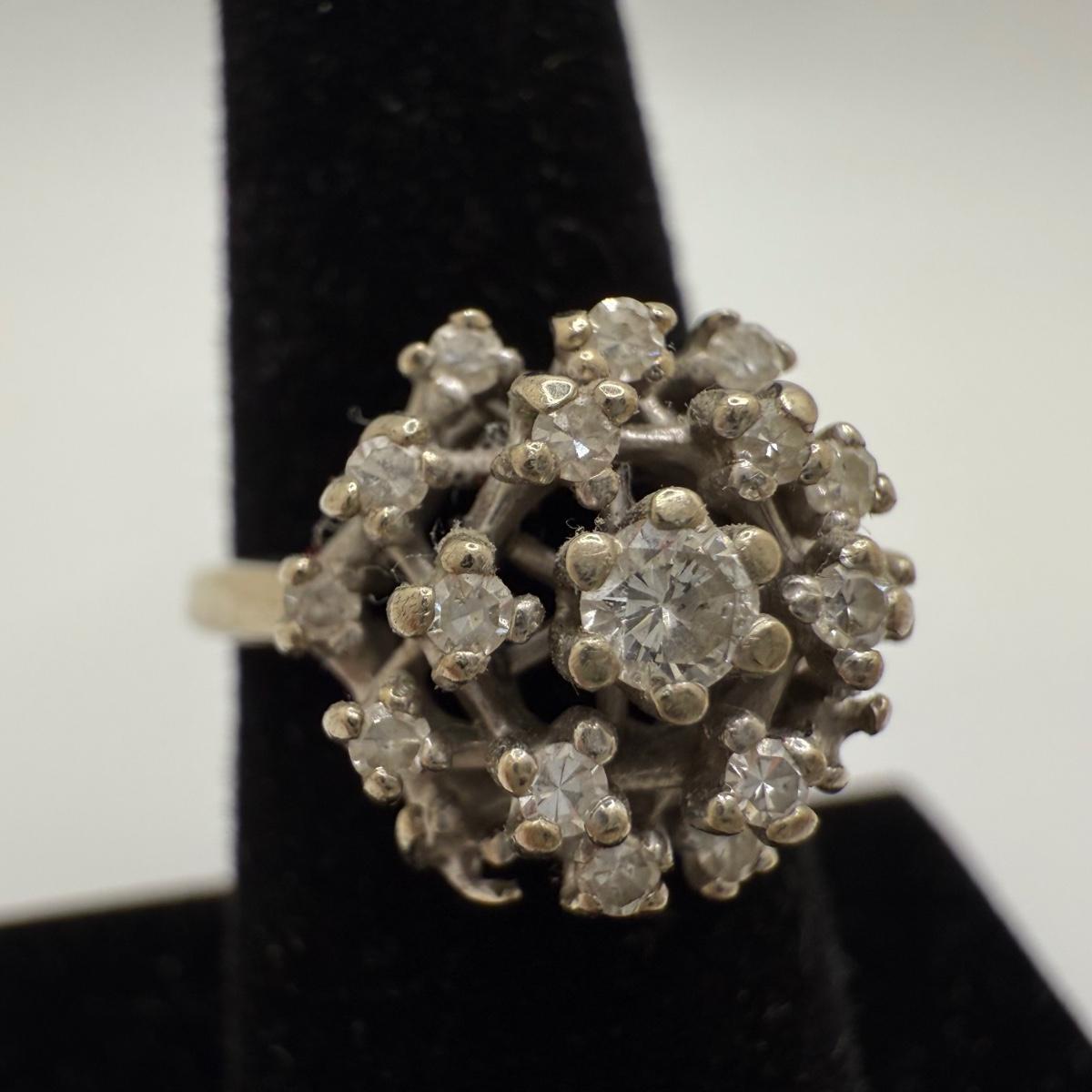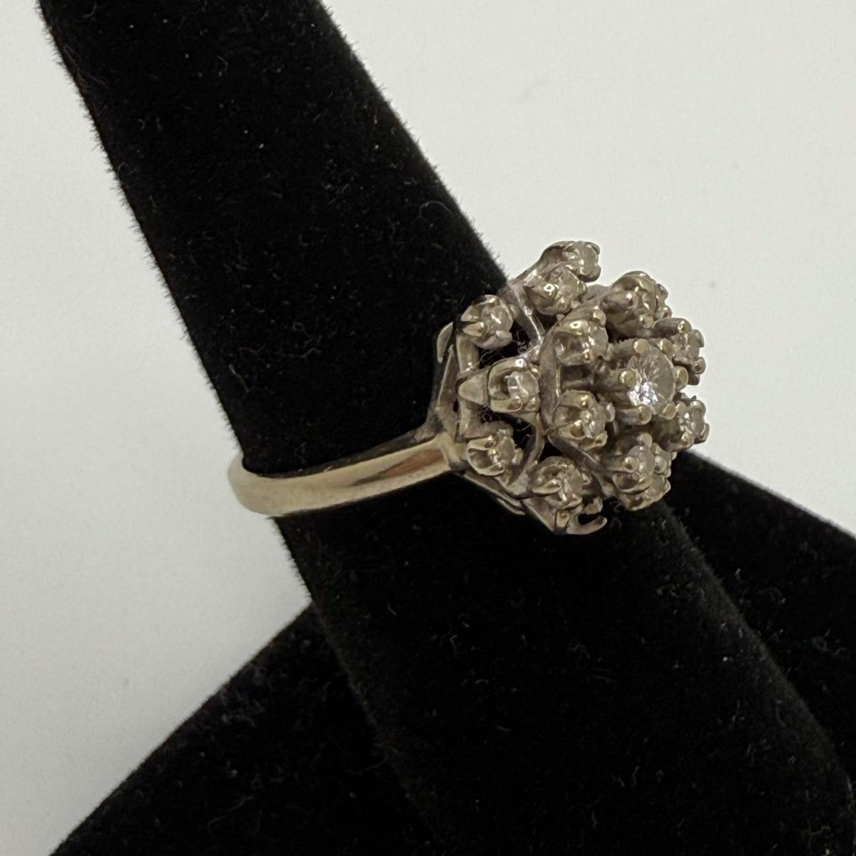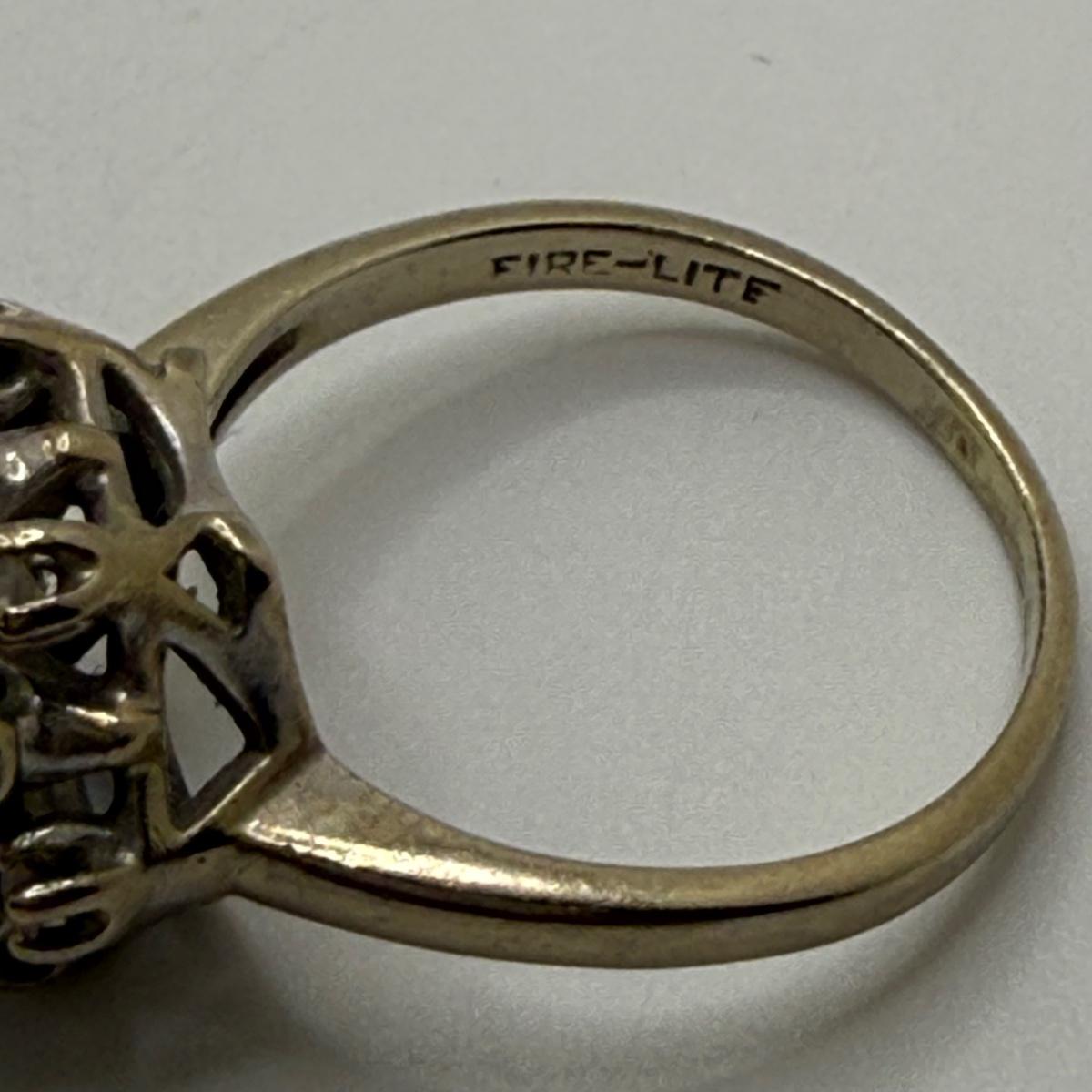 This beautiful ring features a central diamond surrounded by many small clear gemstones. Stones are set in a white gold band stamped with “14K” and “Fire-Lite”. Our diamond tester registered only the center stone as a diamond. Two of the smaller stones are missing. The ring appears to be size 8.5.
