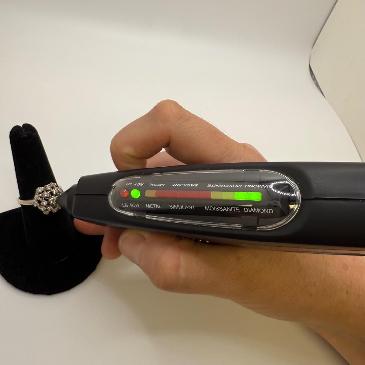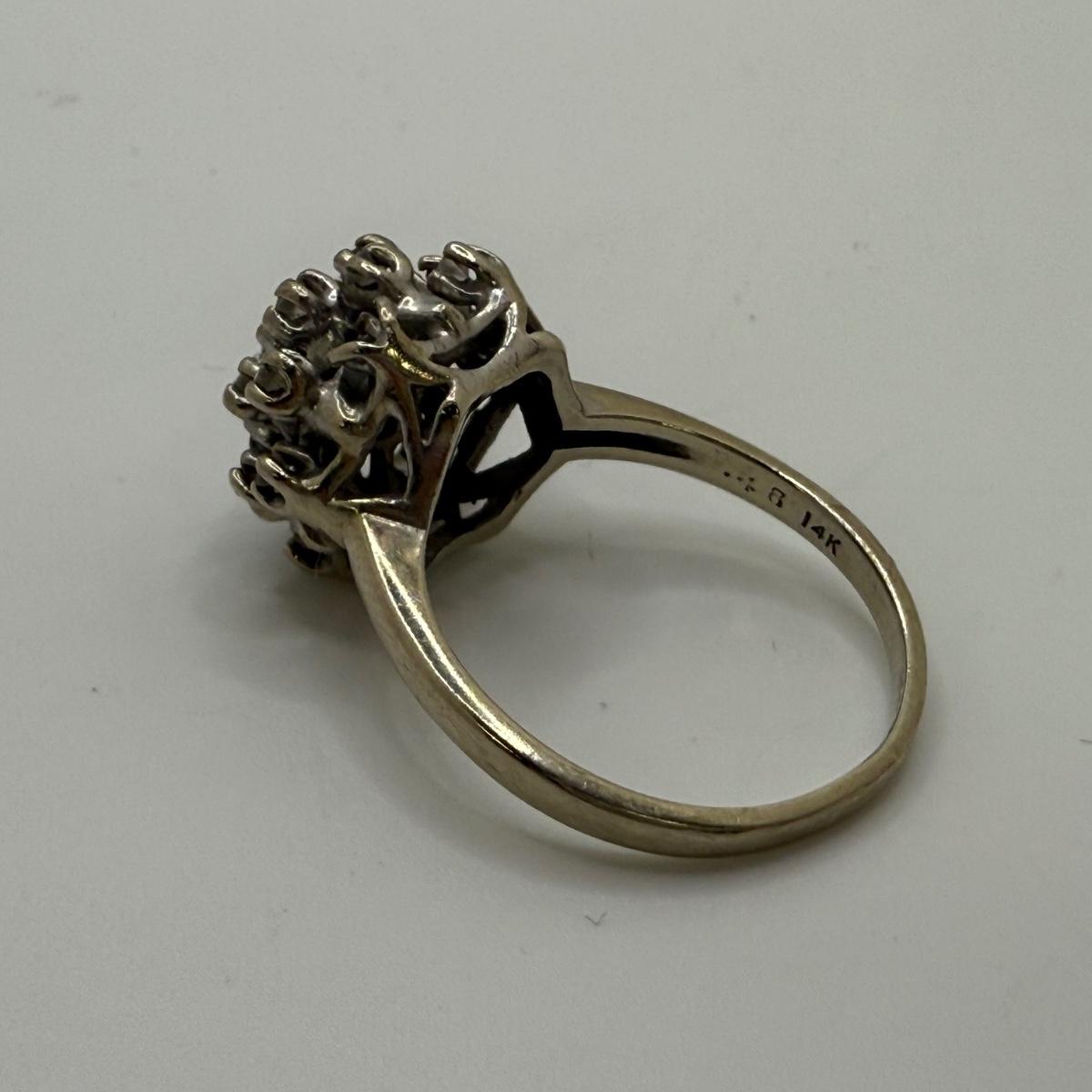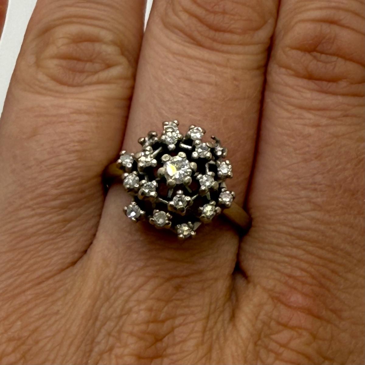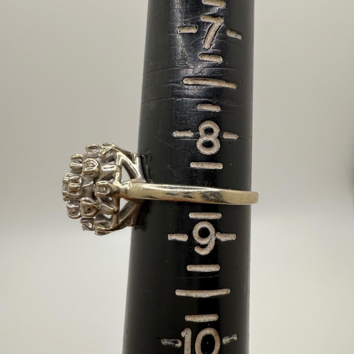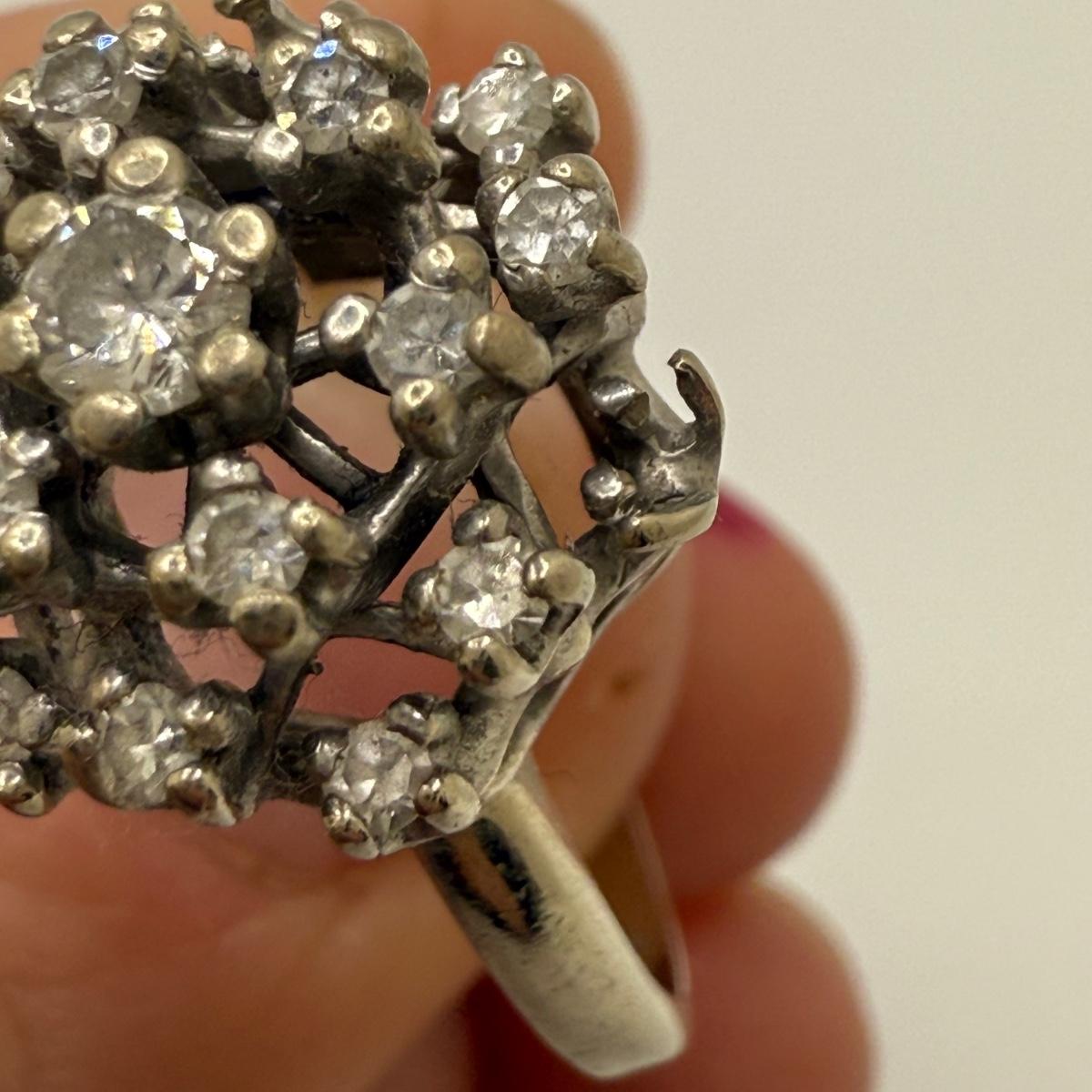 This beautiful ring features a central diamond surrounded by many small clear gemstones. Stones are set in a white gold band stamped with “14K” and “Fire-Lite”. Our diamond tester registered only the center stone as a diamond. Two of the smaller stones are missing. The ring appears to be size 8.5.