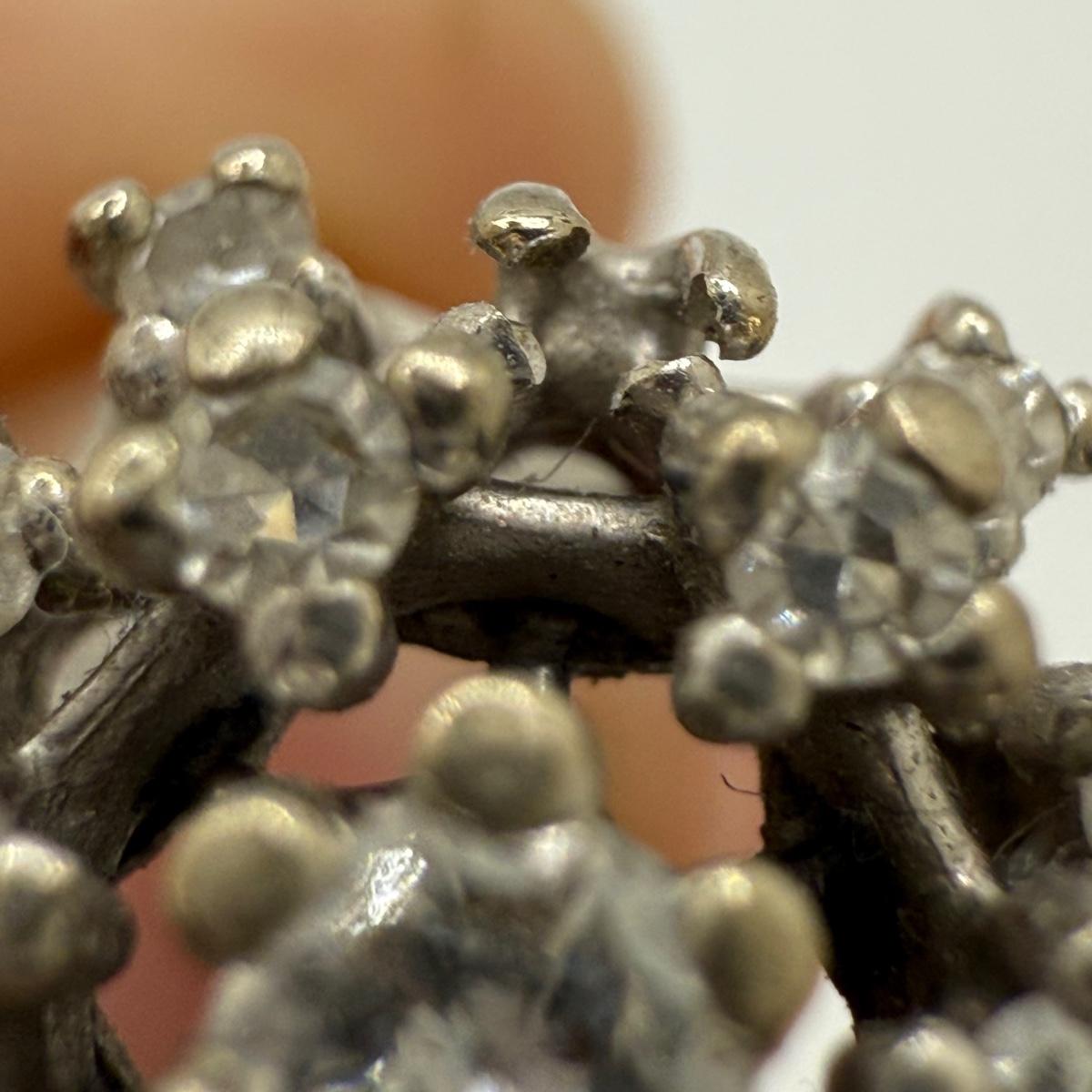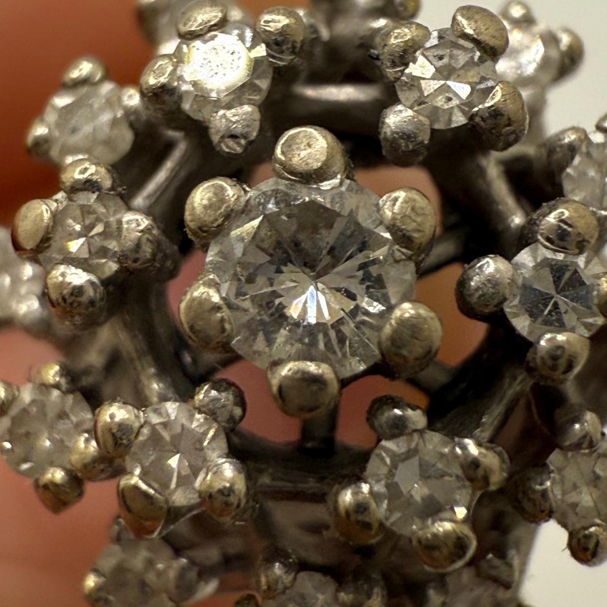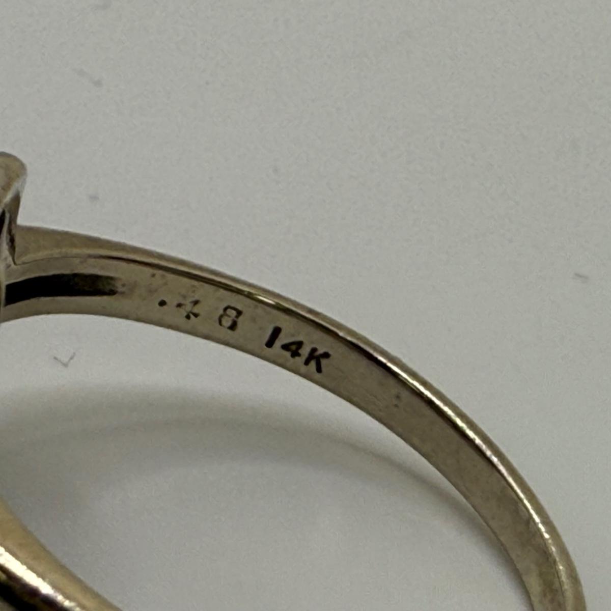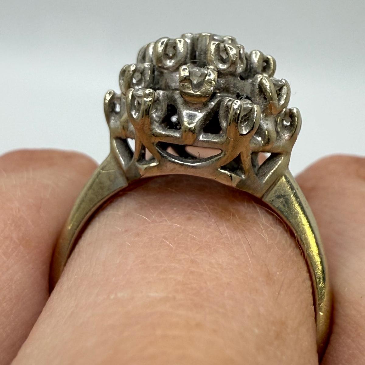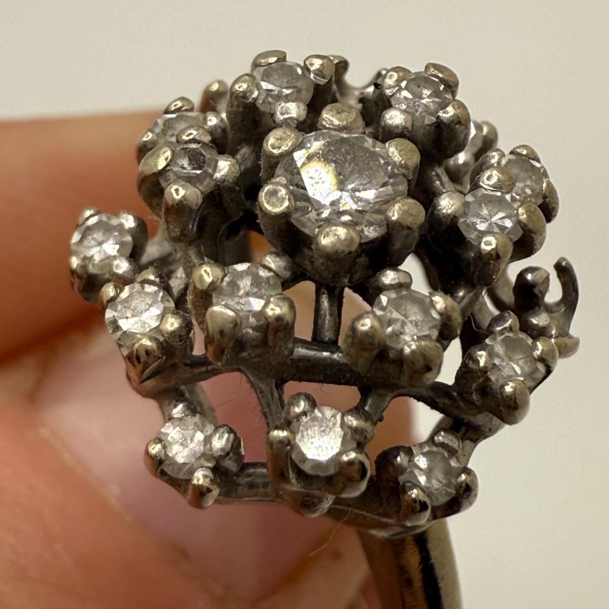 This beautiful ring features a central diamond surrounded by many small clear gemstones. Stones are set in a white gold band stamped with “14K” and “Fire-Lite”. Our diamond tester registered only the center stone as a diamond. Two of the smaller stones are missing. The ring appears to be size 8.5.
