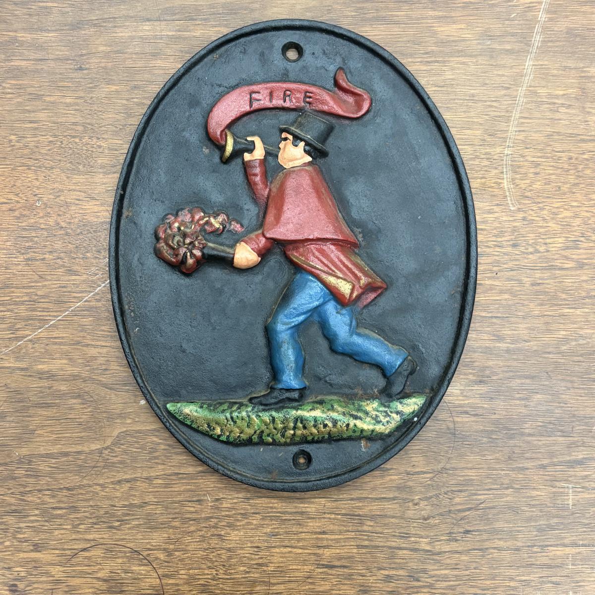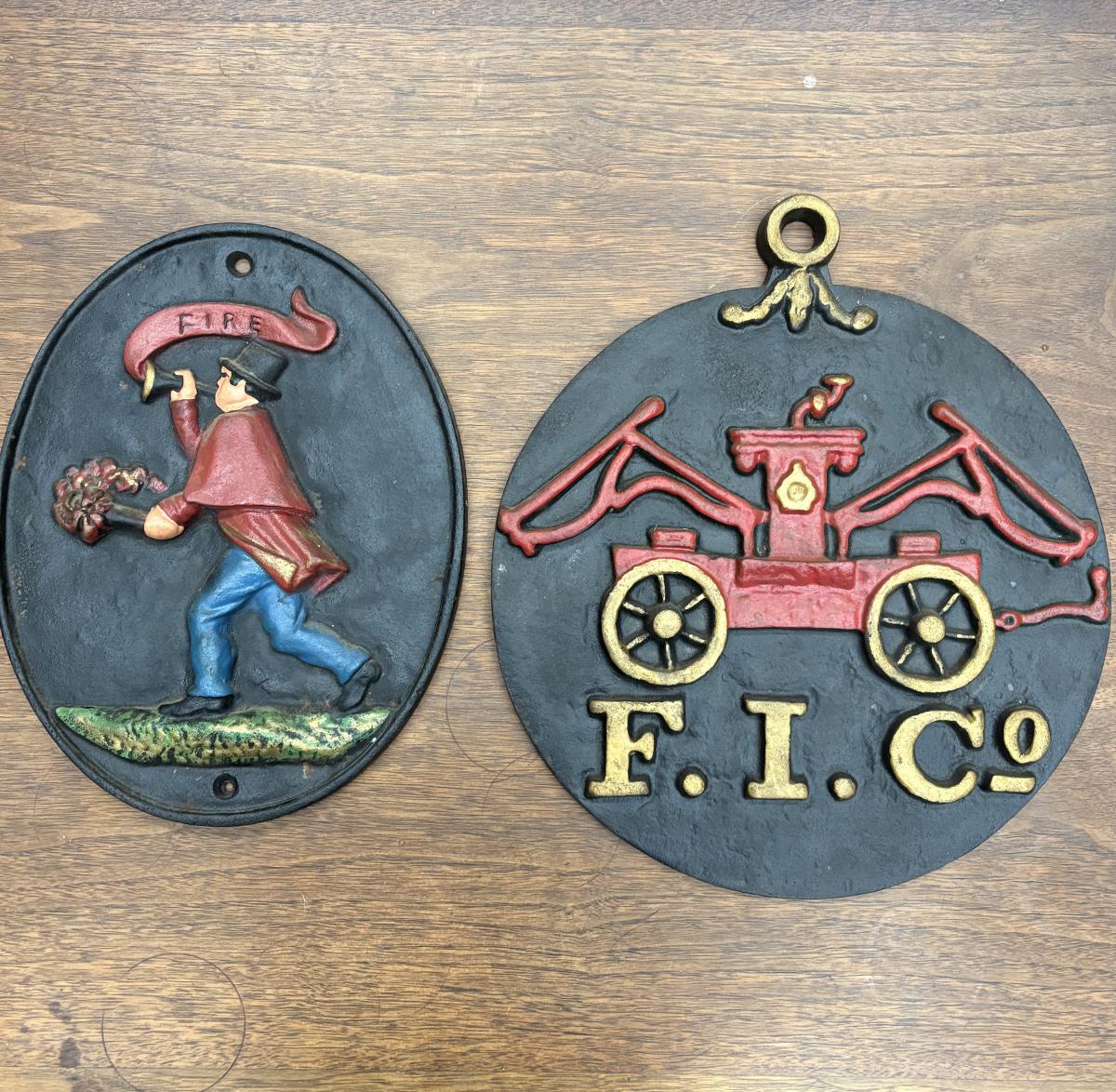 This lot includes two cast iron plaques that appear to be from the Firemen's Insurance Company. For reference, the larger of the two plaques has measurements of approximately 13" x 11.5"H.