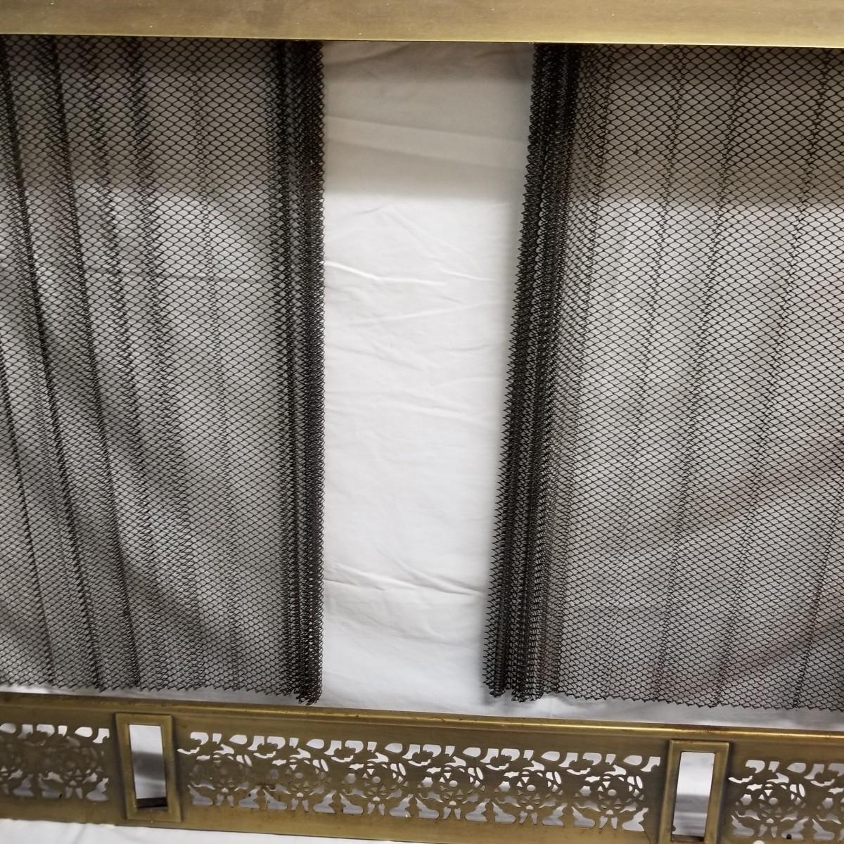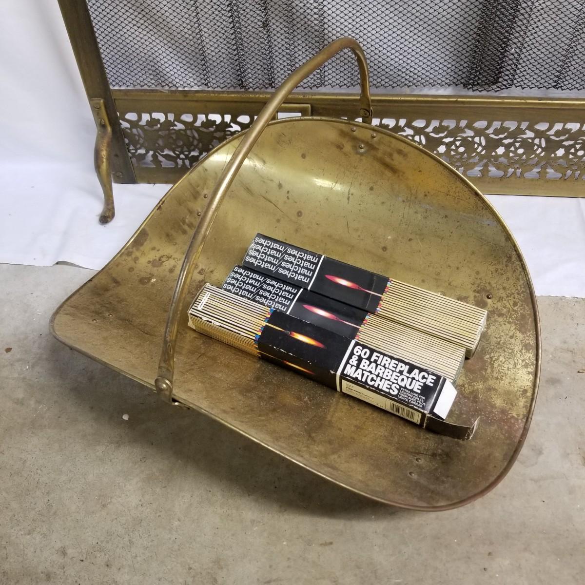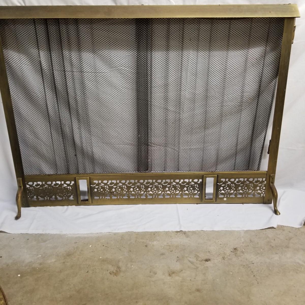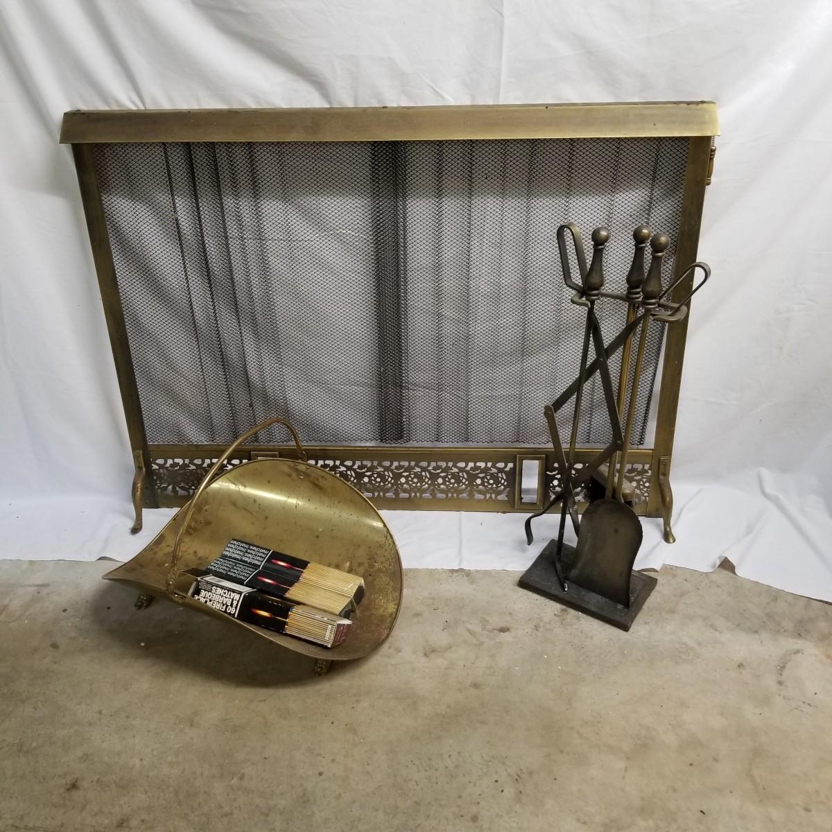Brass/bronze colored fireplace screen with chain curtain. Decorative filigree at bottom, unit is 44"x32"7". Shows some wear. Tool set is 9"x6"x27", has poker, tongs, shovel and brush on holder. Brass log basket is 22"x16"x13, includes three boxes long starter matches. See photos for detail.  Local pickup only.