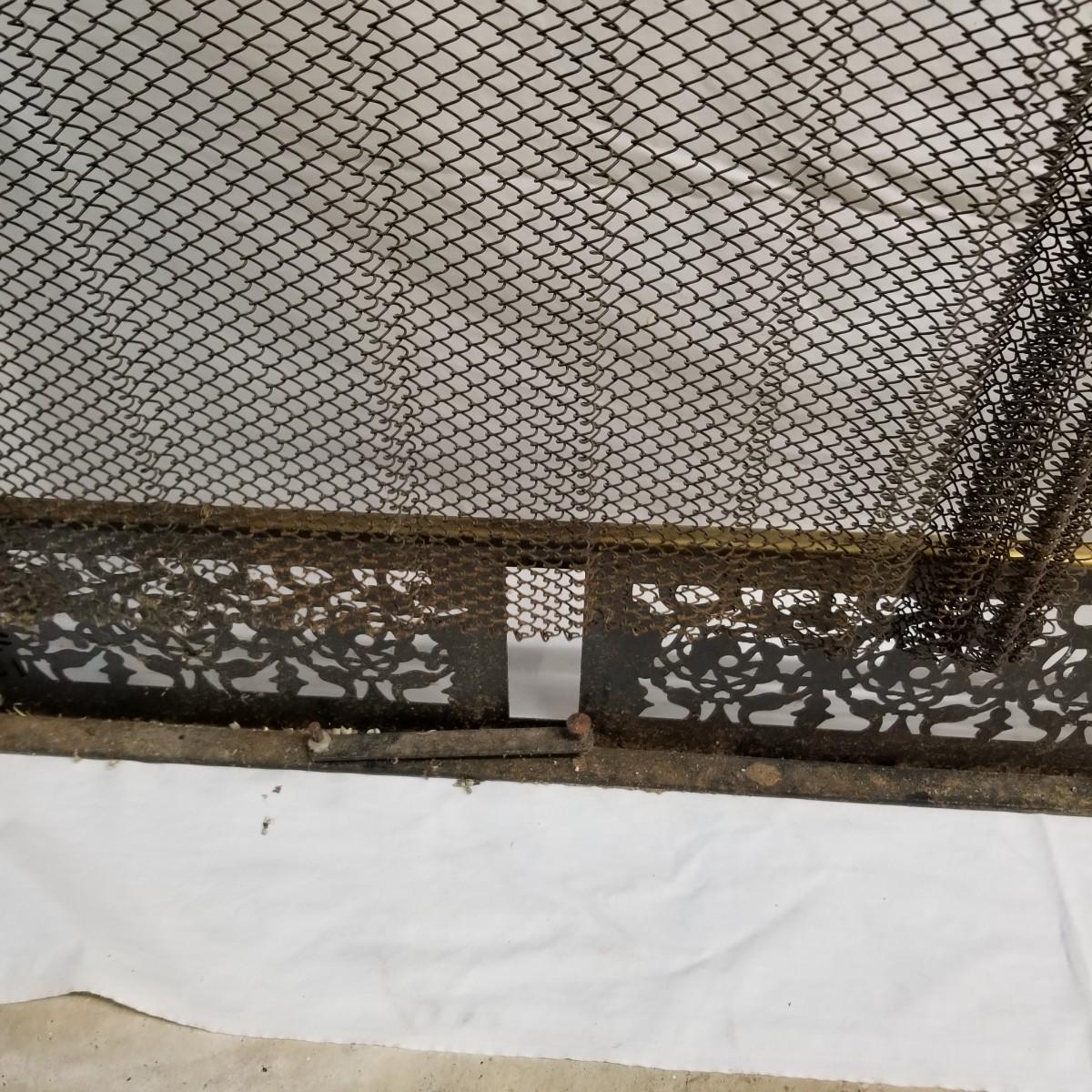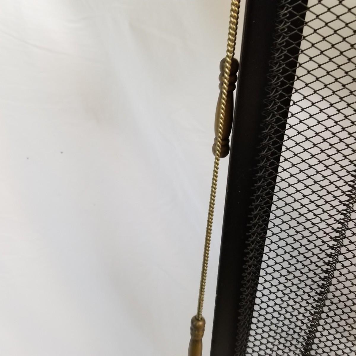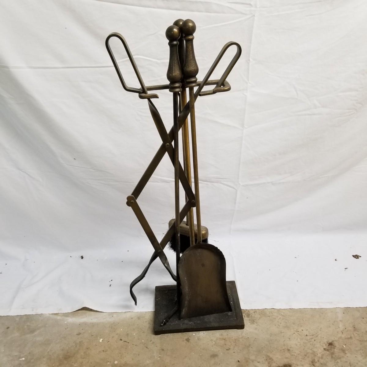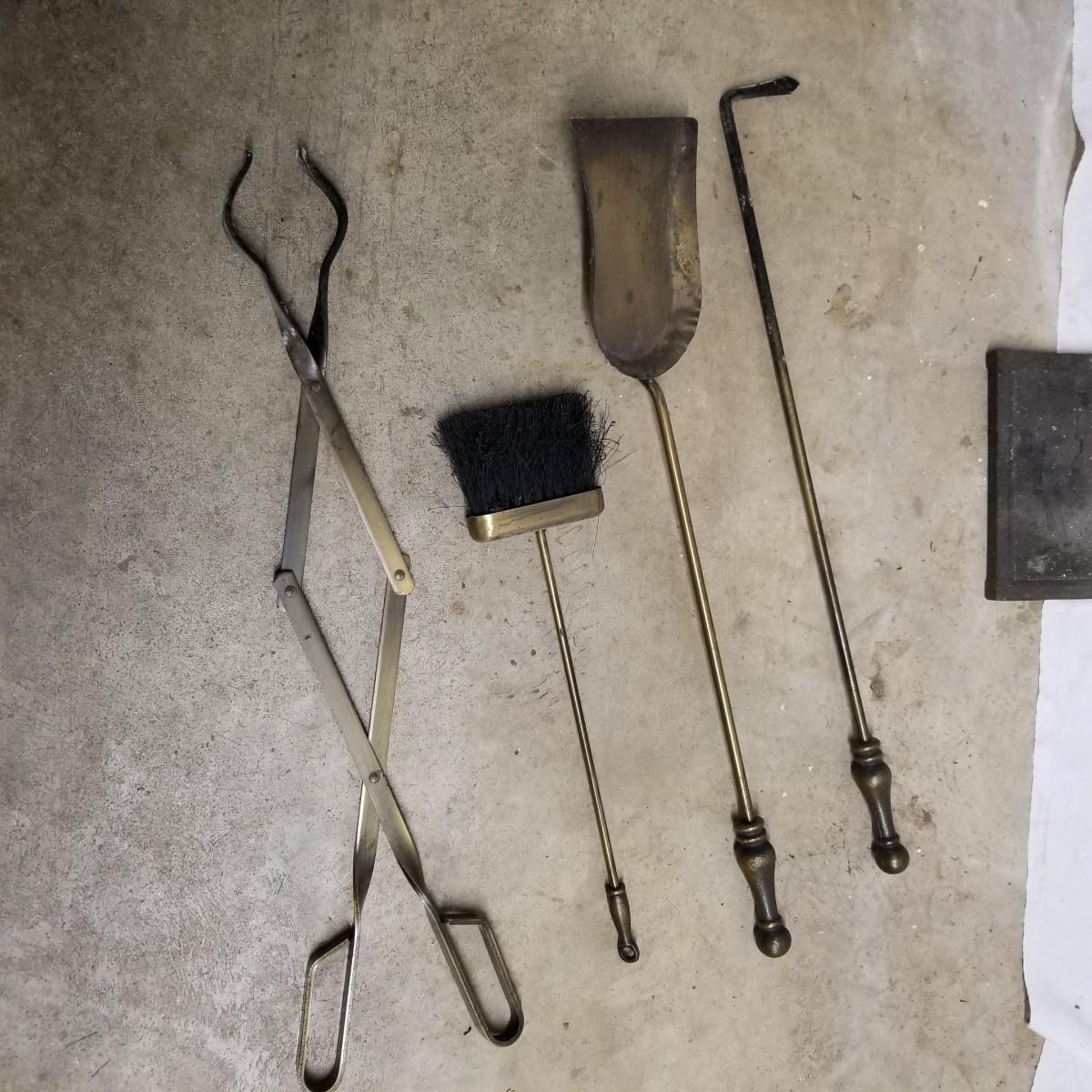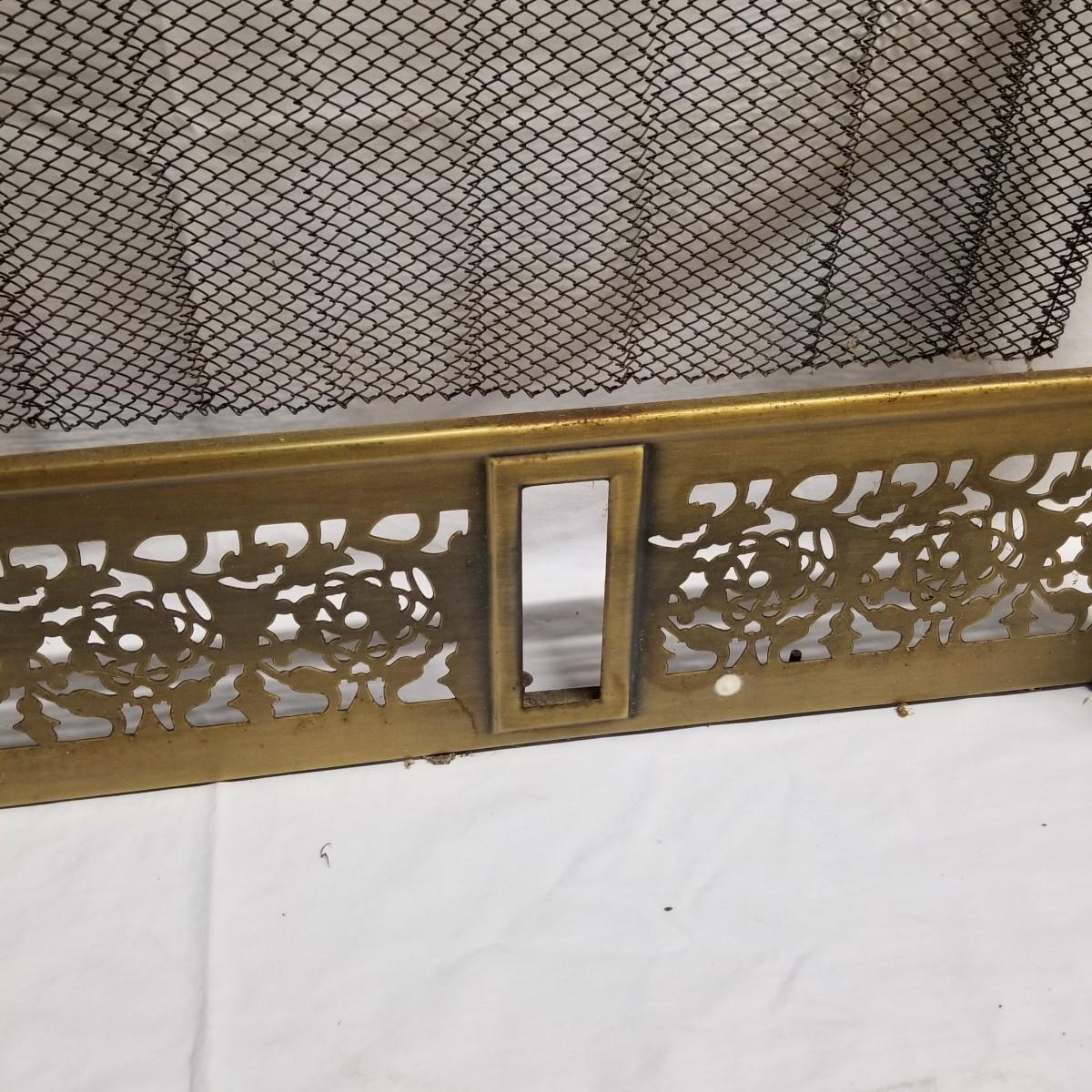 Brass/bronze colored fireplace screen with chain curtain. Decorative filigree at bottom, unit is 44"x32"7". Shows some wear. Tool set is 9"x6"x27", has poker, tongs, shovel and brush on holder. Brass log basket is 22"x16"x13, includes three boxes long starter matches. See photos for detail.  Local pickup only.