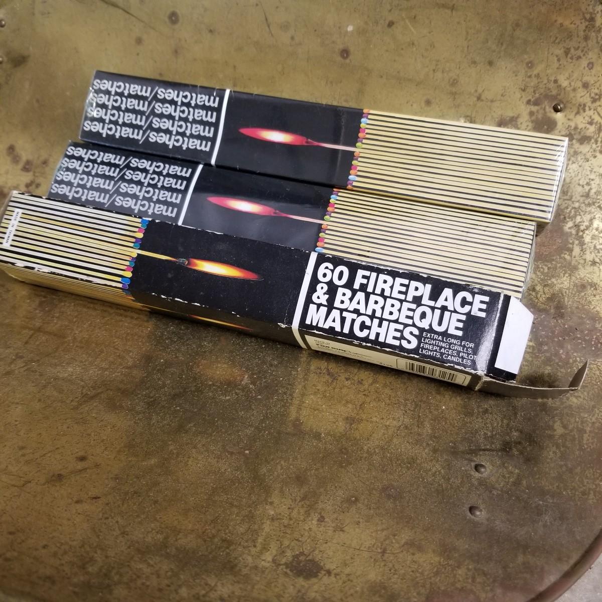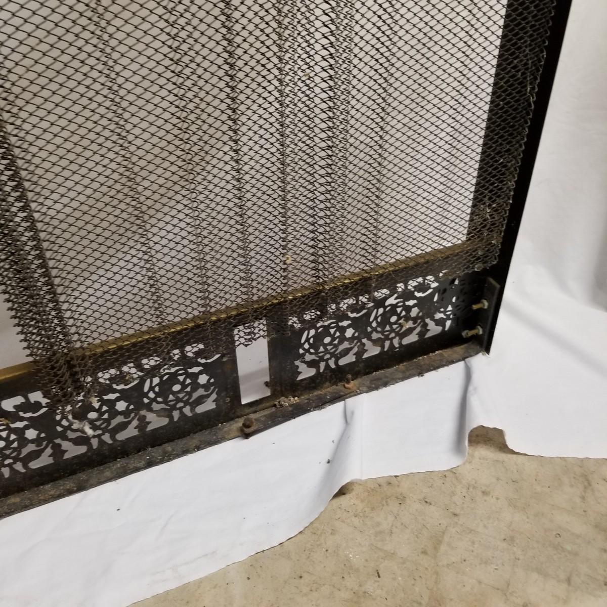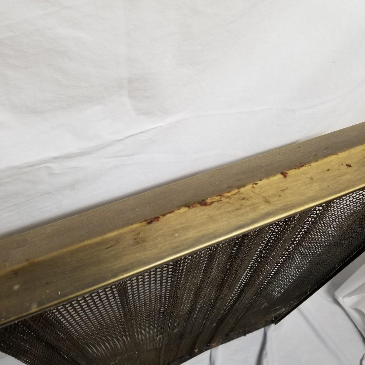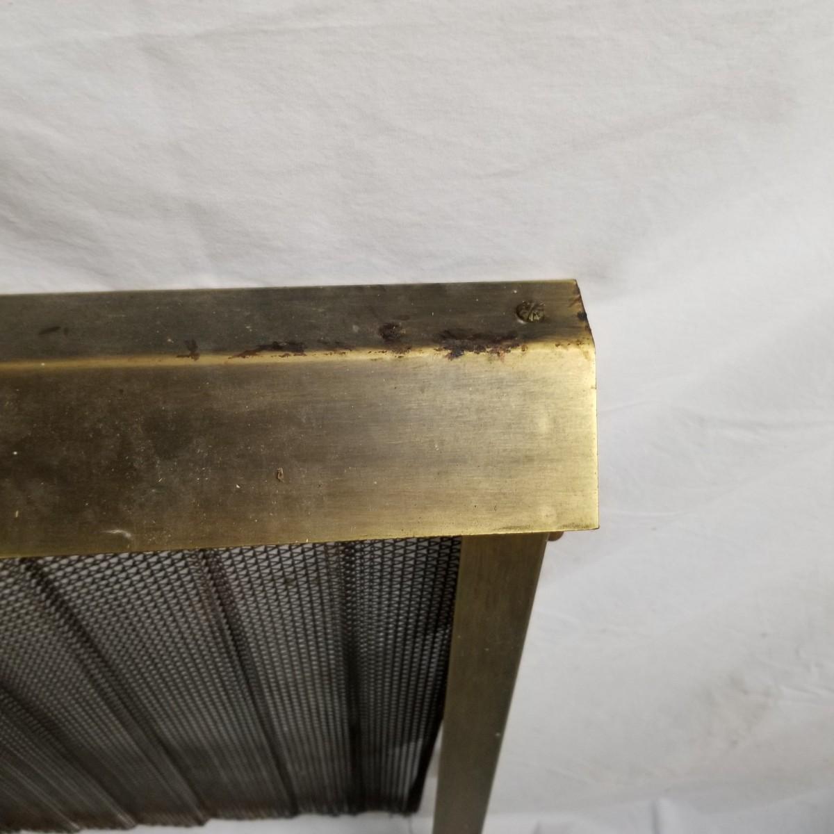 Brass/bronze colored fireplace screen with chain curtain. Decorative filigree at bottom, unit is 44"x32"7". Shows some wear. Tool set is 9"x6"x27", has poker, tongs, shovel and brush on holder. Brass log basket is 22"x16"x13, includes three boxes long starter matches. See photos for detail.  Local pickup only.