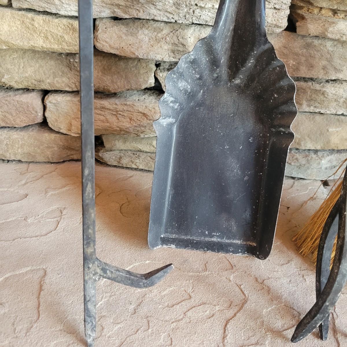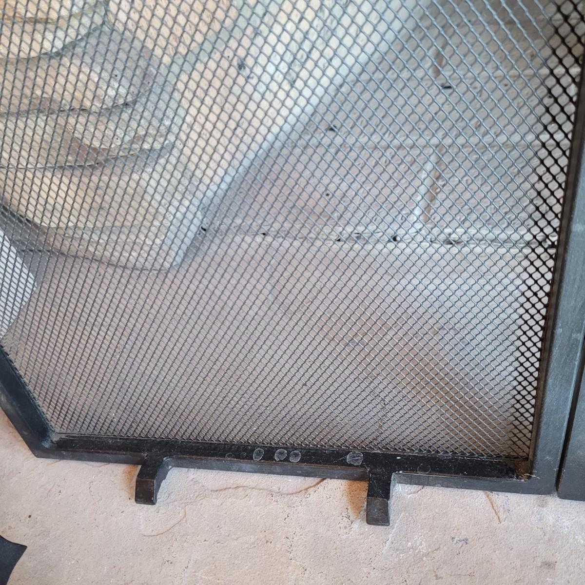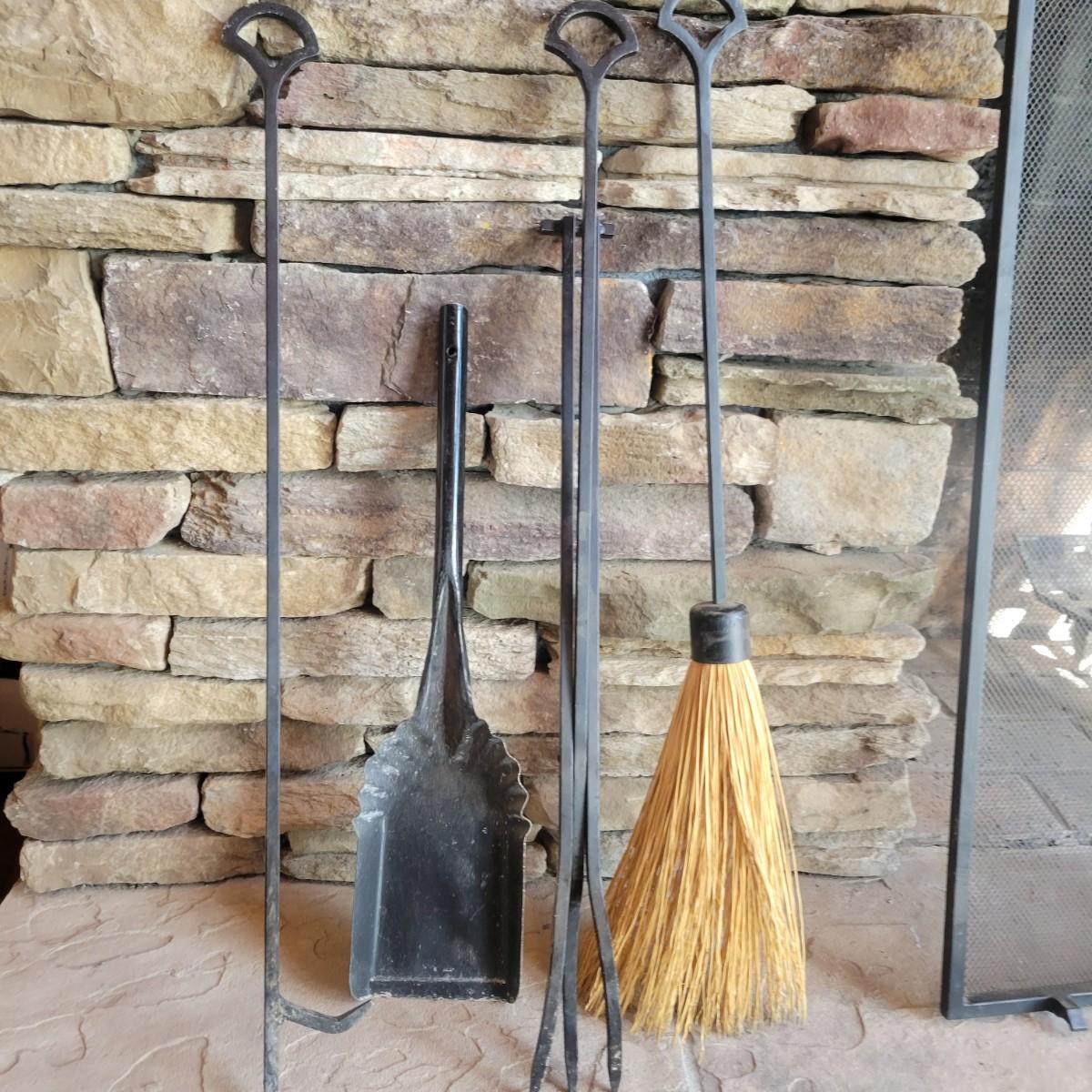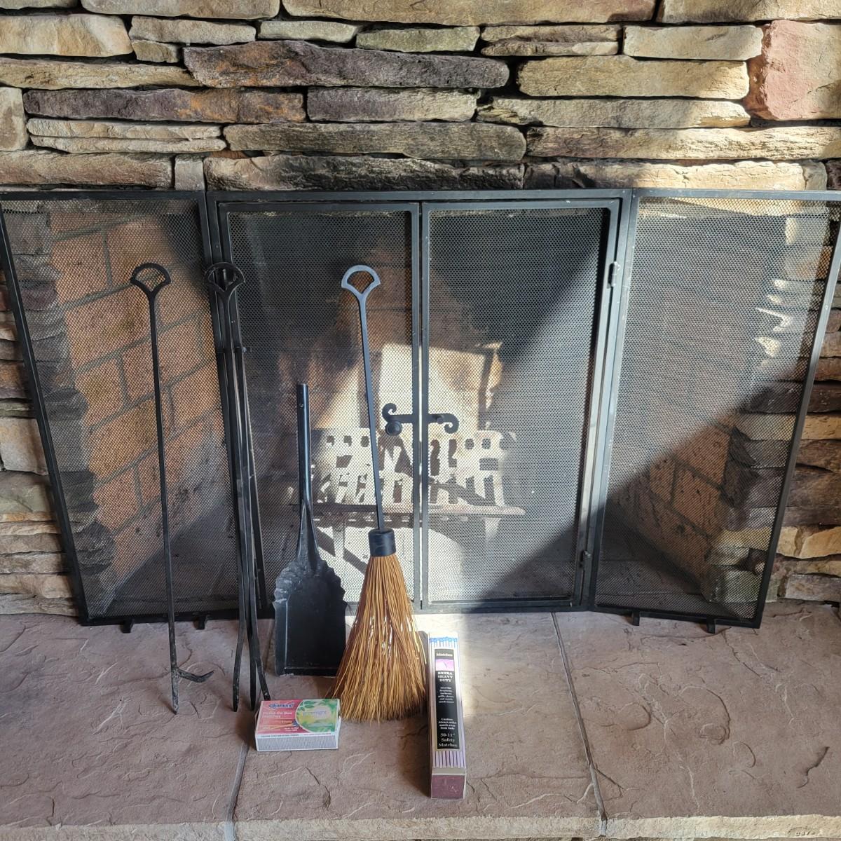 A fireplace screen and accessories in good condition. Note the metal grate is not included. Included in this lot is a three panel fireplace screen that has front doors that open. It is made of metal and measures approximately 48" x 30" x .75". Lot also includes a broom fire poker and log grab with wrought iron handles. The dust pan is a different style and appears to be made of steel and painted. Additionally, there are two packs of matches. Local pickup only