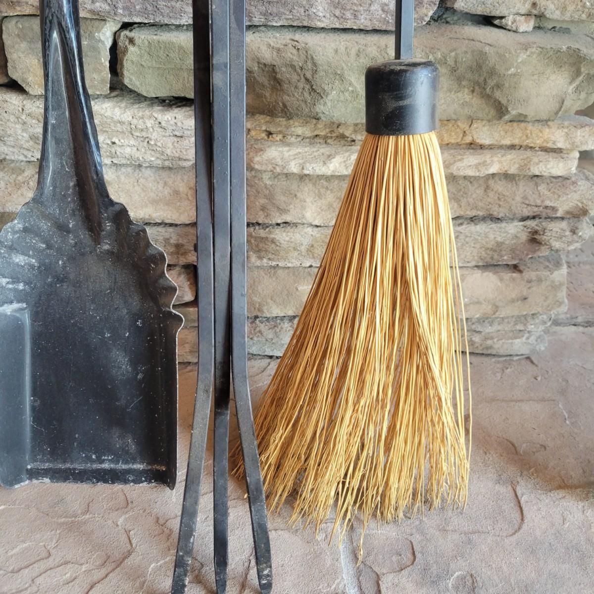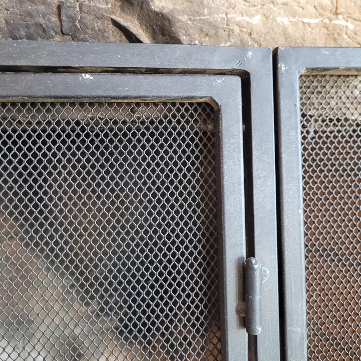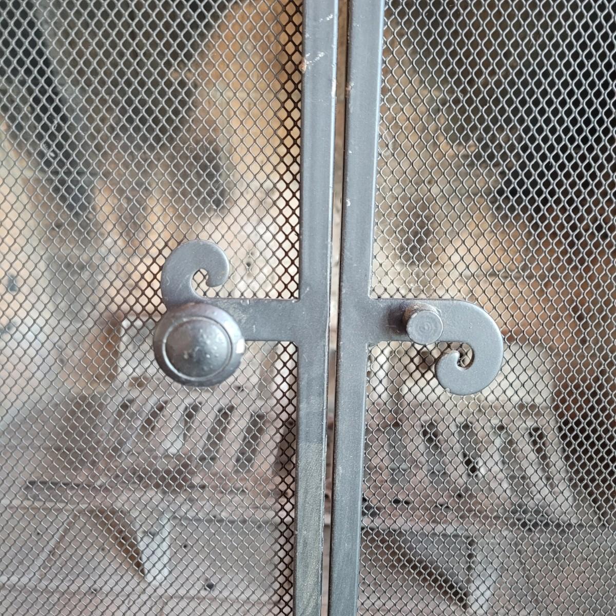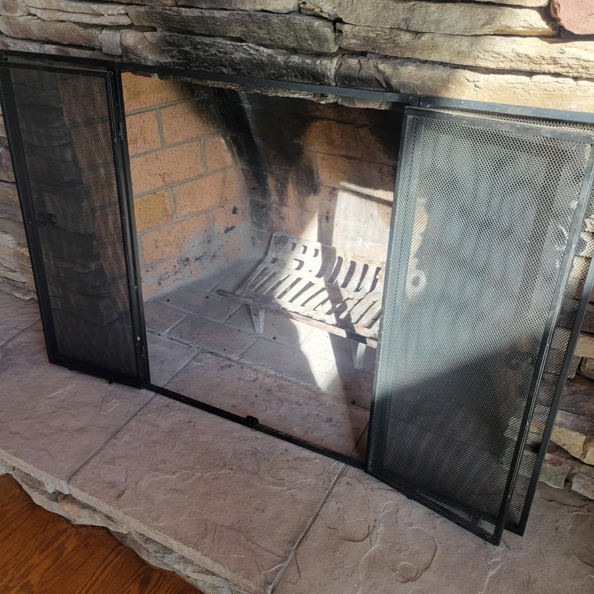 A fireplace screen and accessories in good condition. Note the metal grate is not included. Included in this lot is a three panel fireplace screen that has front doors that open. It is made of metal and measures approximately 48" x 30" x .75". Lot also includes a broom fire poker and log grab with wrought iron handles. The dust pan is a different style and appears to be made of steel and painted. Additionally, there are two packs of matches. Local pickup only