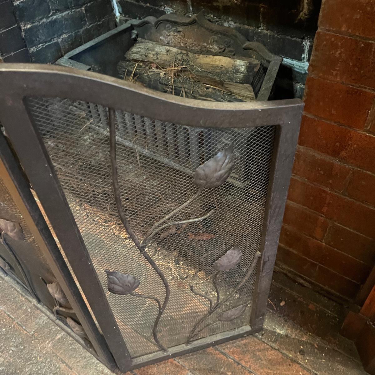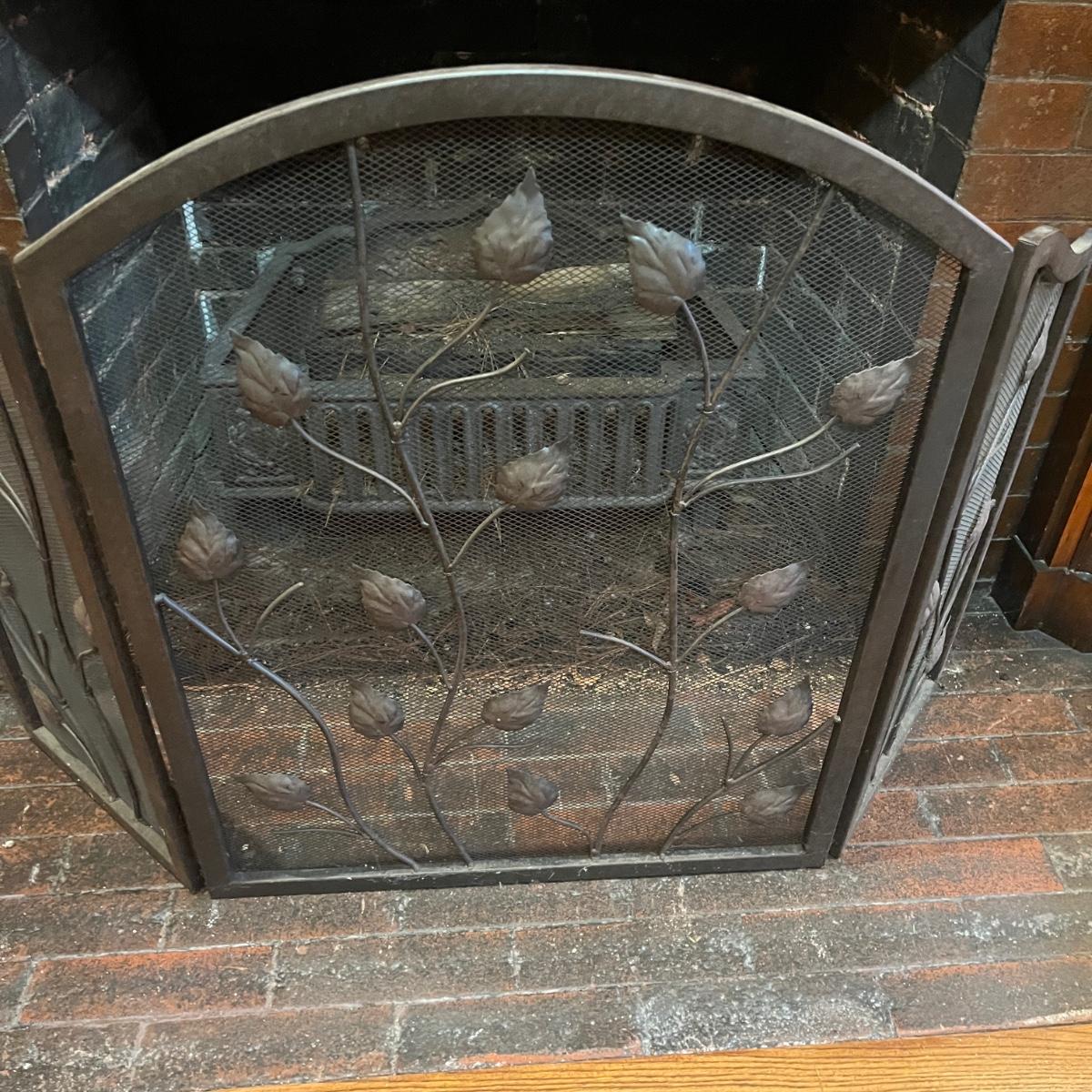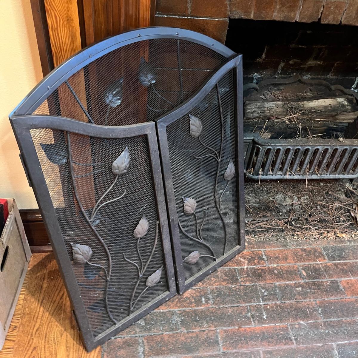 Lot includes a metal folding fireplace screen with leaf design. Screen measures 48” x .5” x 29”H.