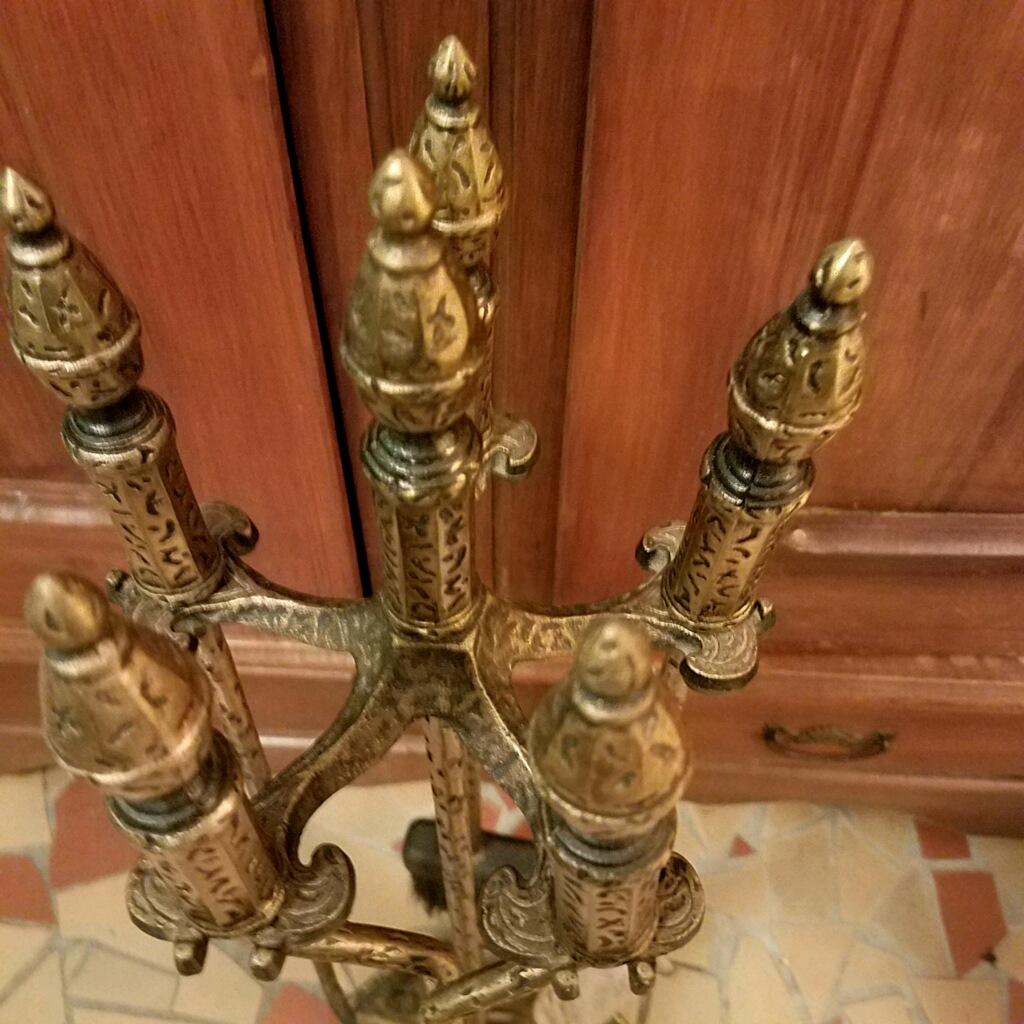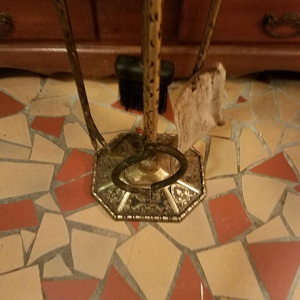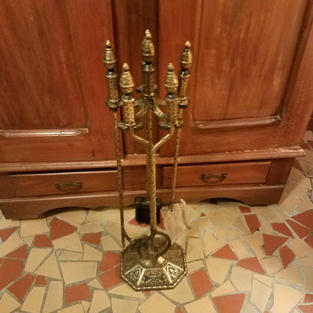 Fireplace Set B: Vintage set. 4 tools, tool holder, brass with dark finish