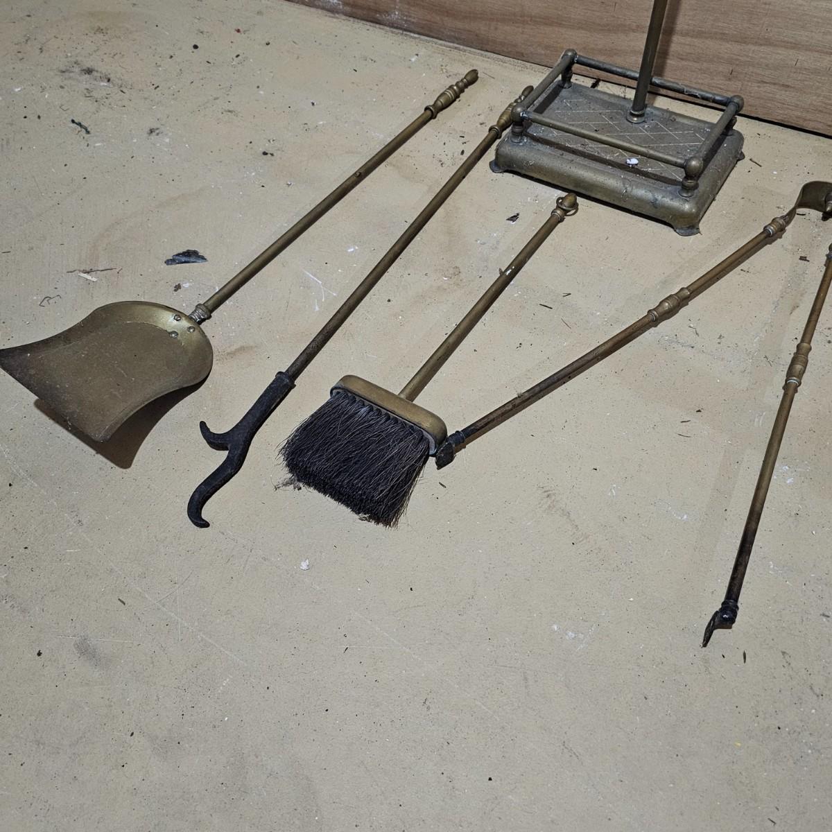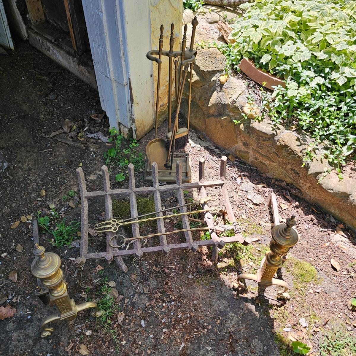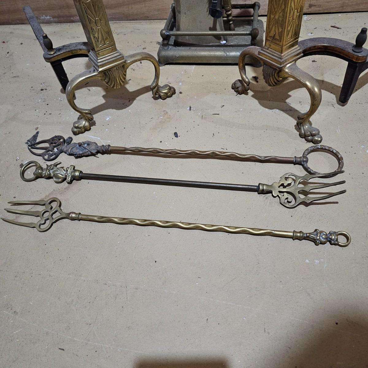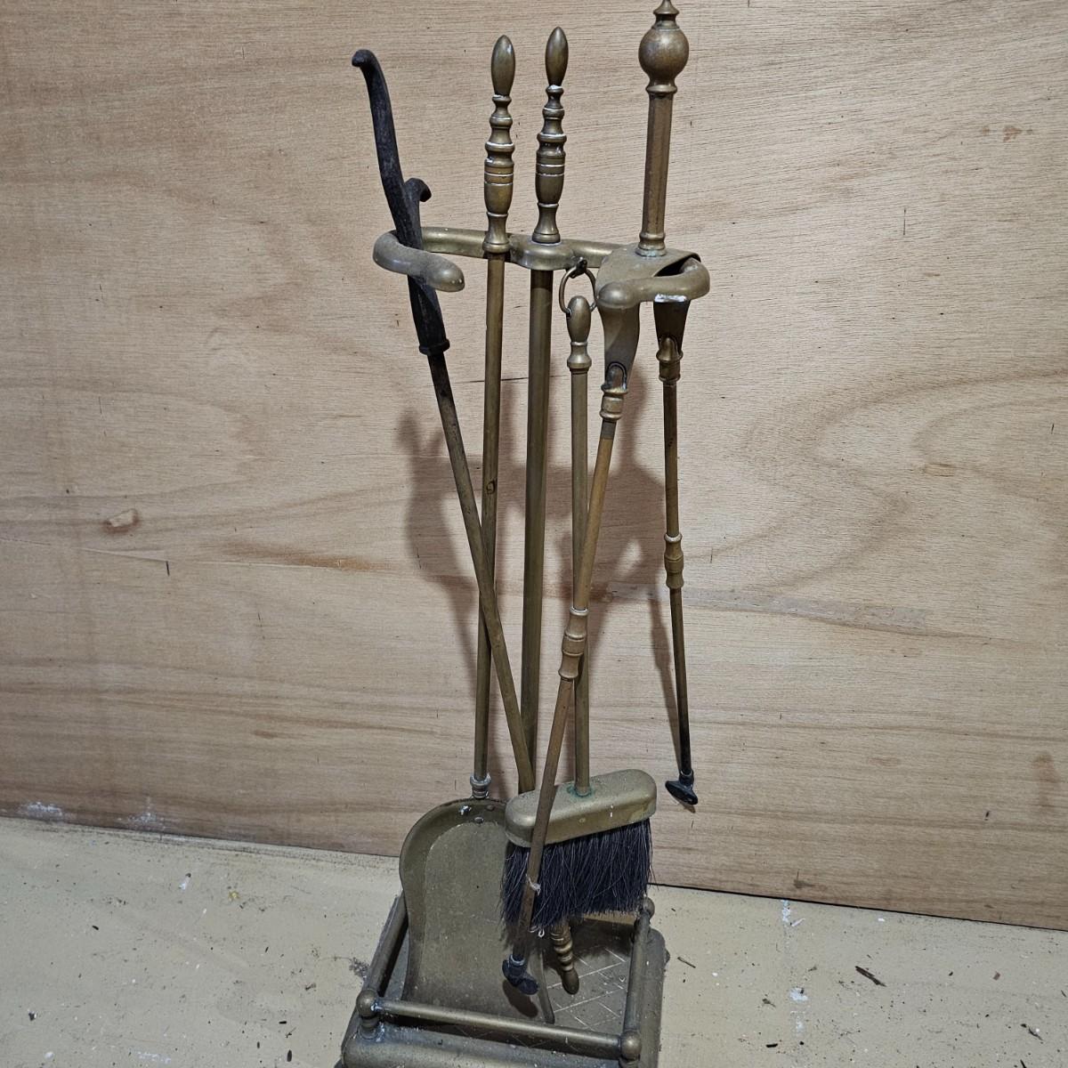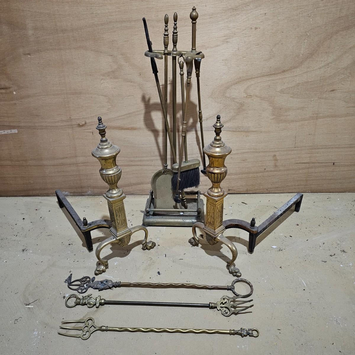 Brass fireplace set with shovel, poker, brush, holder and two andirons to hold wood. Tool stand measures 9"W x 7"D x 28"H. andirons are 9"W x 18"D x 19"H. Large cast iron grate measures 24"W x 16"D x 8"H. All items used, see photos for details. Local pickup only.