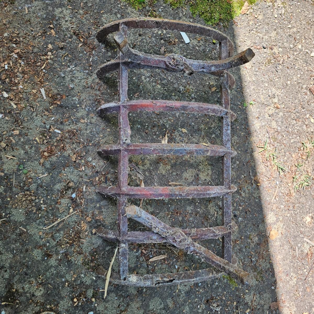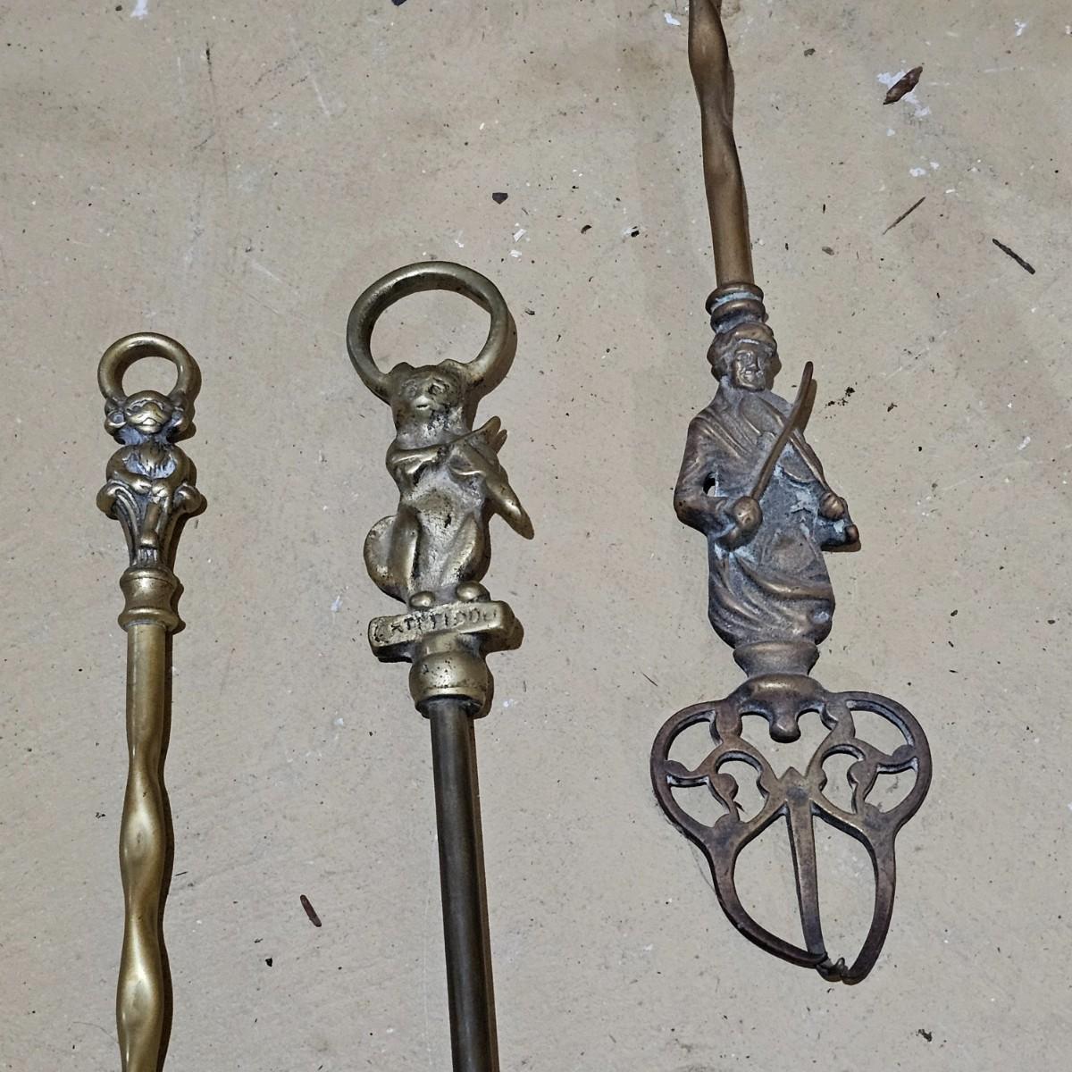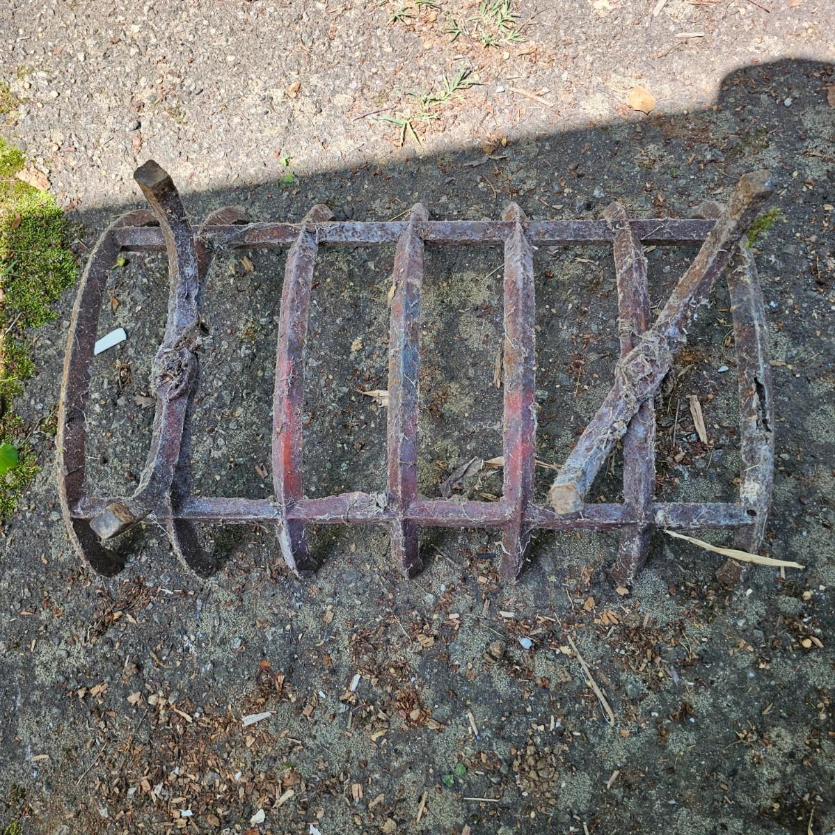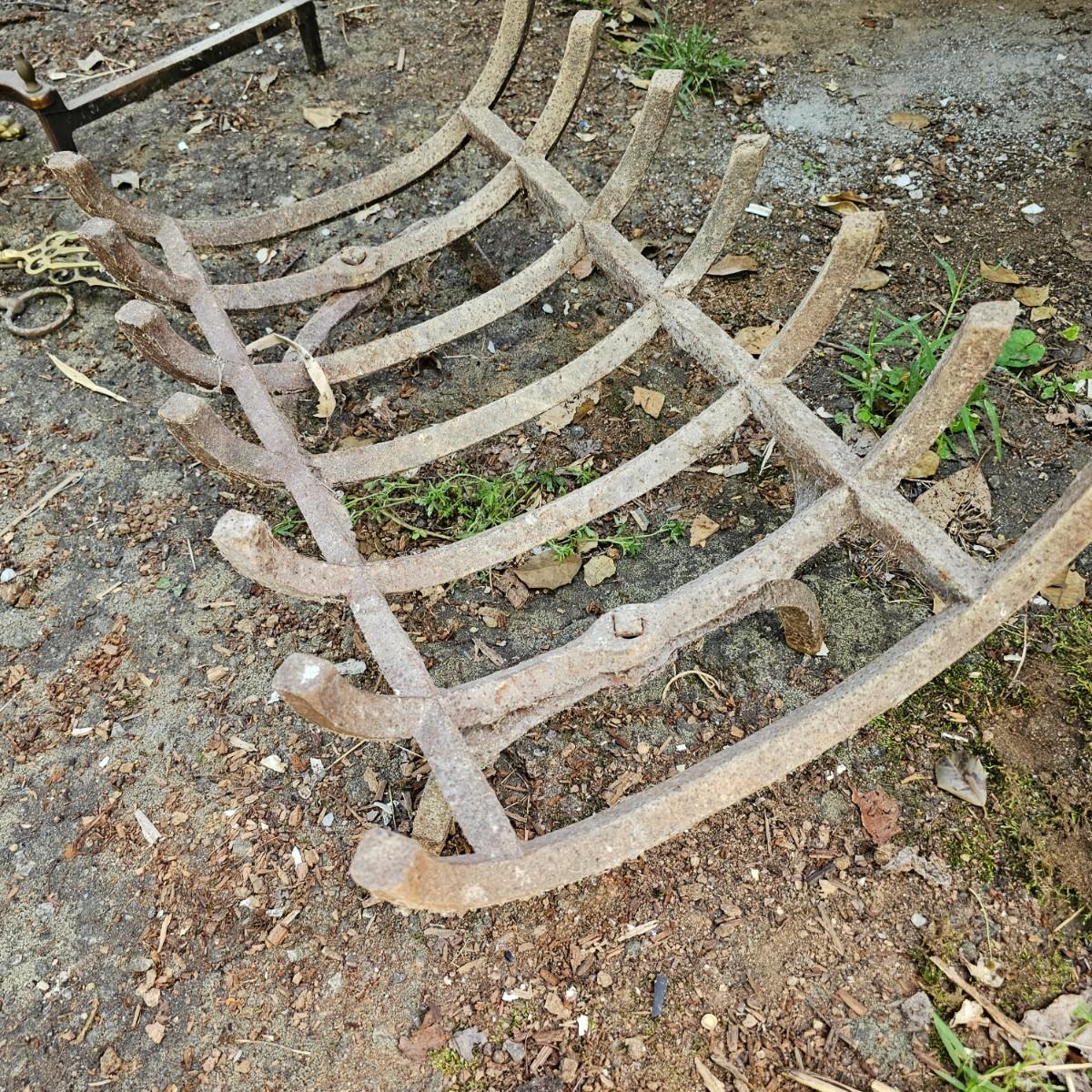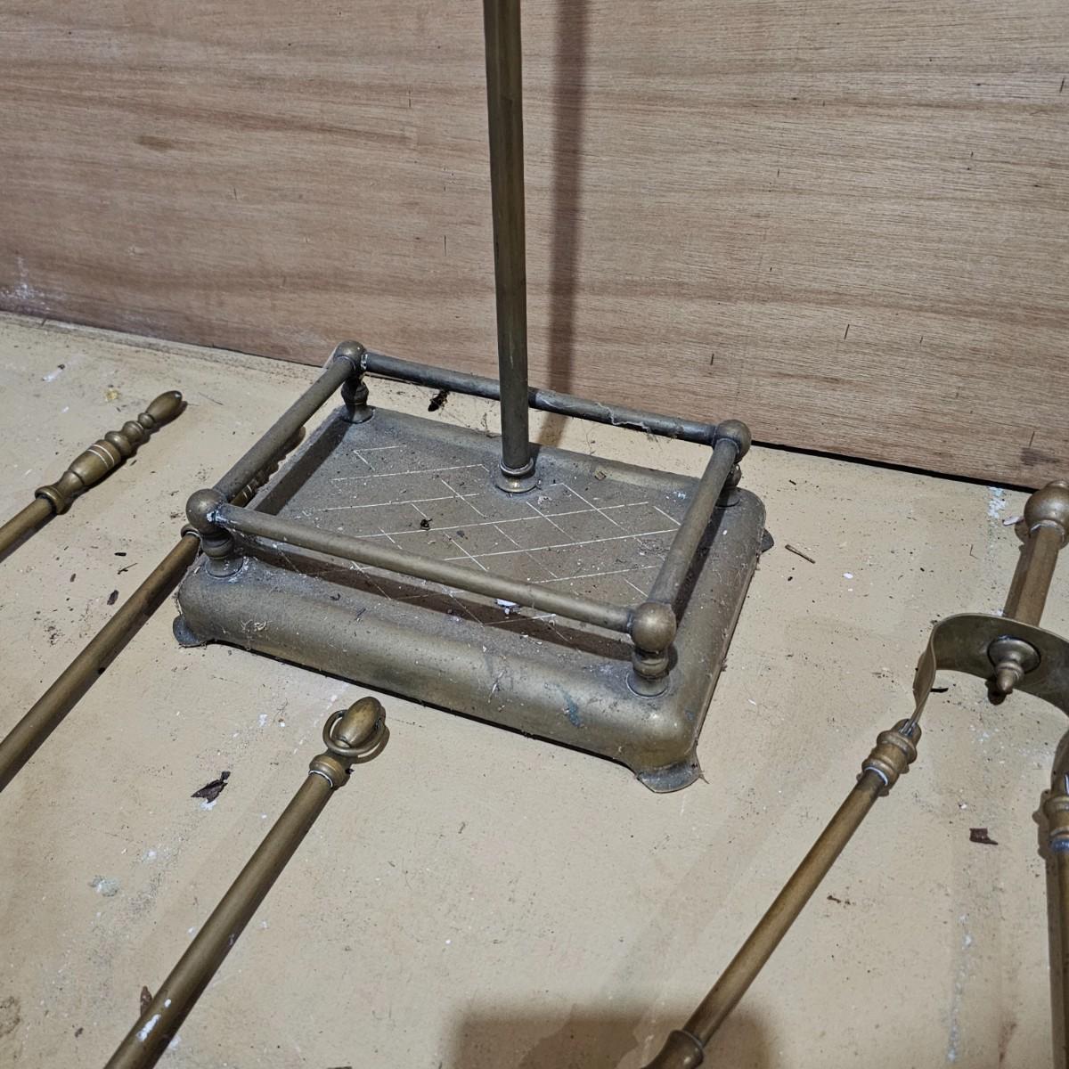 Brass fireplace set with shovel, poker, brush, holder and two andirons to hold wood. Tool stand measures 9"W x 7"D x 28"H. andirons are 9"W x 18"D x 19"H. Large cast iron grate measures 24"W x 16"D x 8"H. All items used, see photos for details. Local pickup only.